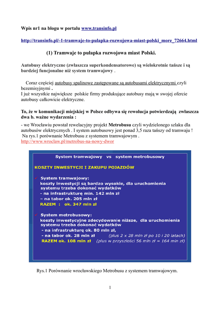 Wpis nr1 na blogu w portalu www.transinfo.pl http://transinfo.pl/-1-tramwaje-to-pulapka-rozwojowa-miast-polski_more_72664.html (1) Tramwaje to pułapka rozwojowa miast Polski. Autobusy elektryczne (zwłaszcza superkondensatorowe) są wielokrotnie tańsze i są bardziej funcjonalne niż system tramwajowy . Coraz częściej autobusy spalinowe zastępowane są autobusami elektrycznymi czyli bezemisyjnymi . I już wszystkie największe polskie firmy produkujące autobusy mają w swojej ofercie autobusy całkowicie elektryczne. To, że w komunikacji miejskiej w Polsce odbywa się rewolucja potwierdzają zwłaszcza dwa b. ważne wydarzenia : - we Wrocławiu powstał rewelacyjny projekt Metrobusu czyli wydzielonego szlaku dla autobusów elektrycznych . I system autobusowy jest ponad 3,5 raza tańszy od tramwaju ! Na rys.1 porównanie Metrobusu z systemem tramwajowym . http://www.wroclaw.pl/metrobus-na-nowy-dwor Rys.1 Porównanie wrocławskiego Metrobusu z systemem tramwajowym. 1 A planowano we Wrocławiu wprowadzić autobusy akumulatorowe więc gdyby zastosowano ponad dwukrotnie tańsze autobusy superkondensatorowe przewaga Metrobusu nad tramwajem była by kolosalna. - Natomiast Solaris na skalę produkcyjną wprowadził tramwaj superkondensatorowy , który był testowany w Krakowie ( jazda bez pantografu ) http://krakow.pl/aktualnosci/170381,29,komunikat,krakowianie_przetestuja_tramwaj_solari sa.html A w Chinach już w 2014 rozpoczęto wytwarzanie na skalę produkcyjną pojazdów zasilanych wyłącznie superkondensatorami – Rys.2 Rys.2 Tramwaje superkondensatorowe wprowadzone do seryjnej produkcji, od 2014 w Chinach . Niepotrzebna jest trakcja między przystankami . Tramwaj lub autobus w ciągu kilkunastu sekund czyli w czasie wysiadania/wsiadania pasażerów ładuje superkondensatory na przystanku i do następnego przystanku wystarczy energia z superkondensatorów ( jazda bez pantografu ). Połączenie powyższych faktów oznacza, że era masowej elektryfikacji transportu miejskiego w Polsce staje się faktem bo : Autobus elektryczny ( superkondensatorowy ) poruszający się po wydzielonym torze i/lub ulicy łączy zalety tramwaju i autobusu spalinowego i jednocześnie nie ma ich wad. 2 Czyli auto-trolejbus , Rys.3 : Rys.3 Auto-trolejbus superkondensatorowy w Schanghaju. http://kopalniawiedzy.pl/superkondensator-autobus-komunikacja-miejska,8793 W powyższym linku jest błąd : czas ładowania to 20 s a nie 20 min. Sprostowanie w linku: http://energetykon.pl/index.php/2012/02/09/nanotechnologia-pozwala-magazynowac-prad/ Akumulatory niestety nadal są zbyt ciężkie, zbyt drogie a nawet nieekologiczne bo zawierają szkodliwe pierwiastki i ich utylizacja jest droga. I trzeba je długo ładować. Jak rewelacyjne/rewolucyjne znaczenie dla komunikacji miejskiej ma technika superkondansatorowa dobitnie potwierdzają przykłady obliczeniowe. do pobrania -> superkondensatory – przykłady obliczeniowe.pdf superkondensatory są 10 razy tańsze w zastosowaniu miejskim od akumulatorów ! Linki: - Autobus głównie superkondensatorowy Autotram czyli – autotrolejbus, Rys.4: http://mpk.krakow.pl/pl/aktualnosci/news,3594,krakow-wybiera-ekologiczny-transport.html - Autobus bardziej pojemny od tramwaju Rys.5 : http://www.youtube.com/watch?v=Iwv8VhnfSwU&feature=youtu.be http://www.ivi.fraunhofer.de/en.html http://www.autotram.info/en.html 3 Rys.4 Autotram – metro na kołach samochodowych. Rys.5 Autobus o pojemności większej od tramwaju Ale przy podejmowaniu decyzji o rozwoju komunikacji przede wszystkim trzeba pamiętać że: - W Polsce ludność miejska stanowi tylko ok. 61% a dla porównania na Zachodzie w wielu krajach ok. 90%, w Niemczech 85% . Różnica radykalna. I na pewno do dużych miast Polski napłynie wielu nowych mieszkańców z mniejszych miejscowości i wsi . To jest światowy trend. A bez sprawnej , taniej komunikacji nie ma nawet co marzyć o właściwym rozwoju miast . -obecnie jest ostatni okres dofinansowania przez Unię i gdy roztrwoni się te pieniądze w nieprzemyślany sposób czyli na horrendalnie drogie , kolizyjne i nieefektywne tramwaje (lista wad tramwajów jest daleko dłuższa ) to po roku 2020 nie będzie ani nowoczesnej komunikacji ani pieniędzy 4 Miasta Polski powinny przede wszystkim skupić się na : - masowym zastępowaniu autobusów spalinowych autobusami elektrycznymi ( superkondensatorowymi ) bo koszt eksploatacji pojazdu elektrycznego jest 5 razy niższy od eksploatacji pojazdu spalinowego a wynika to głównie z tego że sprawność silnika spalinowego wynosi zaledwie ok. 30% a sprawność silnika elektrycznego przekracza 90% ! Czyli wkrótce komunikacja miejska będzie nawet 3 razy tańsza niż obecnie. I bilety komunikacji miejskiej będą za 1 zł (!) nawet w dużych miastach. ( nie powinno być tzw darmowej komunikacji bo darmocha jest b.kosztowna i wprowadza złe nawyki ) Także będzie znacznie mniejsza emisja CO2 nawet gdy energia elektryczna będzie pochodziła z elektrociepłowni węglowych - a największe miasta takie jak Kraków, Wrocław , Poznań dodatkowo powinny intensywnie pracować nad wprowadzeniem lekkiego metra . Bo jest pewne , że znacznie zwiększy się liczba mieszkańców największych miast. Szlaki tramwajowe zostały tak wytyczone aby przebiegać przez największe skupiska ludzkie. I z tego powodu w dużych miastach najbardziej obciążone szlaki tramwajowe powinny być zastępowane przez bardziej efektywny środek transportu czyli przez metro. Dla ścisłości : chodzi o lekkie metro czyli głównie naziemne a tunele tylko w centralnych dzielnicach . I tunele podobne np. do względnie taniego (w porównaniu z głębokim metrem) tunelu tramwajowego w poznańskim Franowie. Bardziej ścisła była by nazwa Szybka Kolejka Miejska na bazie wagoników metra lub MetroStyl. Jak skrótowo wykazano rozwiązanie problemów komunikacyjnych miast można dokonać wielokrotnie taniej i znacznie dogodniej dla pasażerów niż przy pomocy tramwai. R