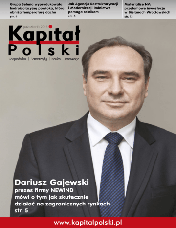 Grupa Selena wyprodukowała hydroizolacyjną powłoka, która obniża temperaturę dachu Jak Agencja Restrukturyzacji i Modernizacji Rolnictwa pomaga rolnikom Kapitał Materialise NV: Polski przełomowe inwestycje w Bielanach Wrocławskich str. 4 str. 8 str. 13 październik 2016 Dariusz Gajewski prezes firmy NEWIND mówi o tym jak skutecznie działać na zagranicznych rynkach str. 5 www.kapitalpolski.plwww.kapitalpolski.pl 1 SPRAWDŹ AKTUALNĄ PROMOCJĘ Od 18 lat wyznaczamy nowe kierunki studia podyplomowe miejsce spotkań praktyków • Zarządzanie jakością • Pośrednictwo w obrocie nieruchomościami • Lean manufacturing • Logistyka w biznesie • Rachunkowość budżetowa • • • • • Studia menedżerskie Zarzadzanie projektem Zarządzanie sprzedażą Zarządzanie zasobami ludzkimi Projektowanie i druk w 3D ponad 70 kierunków studiów z dziedzin takich jak: • administracja i bezpieczeństwo • finanse i rachunkowość • HR • IT • logistyka • marketing i sprzedaż • nieruchomości i prawo • psychologia i pedagogika • zarządzanie 2 październik 2016 www.wsb.pl Kapitał Polski Wszyscy gonimy Europę Już w tym miesiącu rząd ma przyjąć ostateczną wersję Strategii Odpowiedzialnego Rozwoju. Odpowiedzialny rozwój gospodarczy, podobnie jak społeczna odpowiedzialność biznesu na poziomie firmy, każe nam patrzeć znacznie szerzej na biznes. Liczy się nie tylko zysk, wydajność, efektywność, ale również i to jakim kosztem to robimy. Czy przy okazji nie niszczymy środowiska, czy w centrum naszych działań znajduje się człowiek i jego potrzeby rozwoju? Innym i słowy, rozwijając się i goniąc Europę mamy myśleć o środowisku, biedniejszych, słabiej rozwiniętych regionach itd. Tylko czy z tymi wszystkimi „obciążeniami” można szybciej biec? Obecnie poziom PKB na mieszkańca Polski wynosi ok. 68 proc. średniej dla całej Unii. Zgodnie z założeniami Strategii, w 2020 roku zbliży się do poziomu 80 proc. średniej. Aby to było realne musimy się szybko rozwijać. Tymczasem, w ostatnich latach tempo wzrostu gospodarczego Polski zmalało, zmniejszył się też poziom inwestycji. To wszystko grozi nam wpadnięciem w tzw. pułapkę średniego dochodu. Do tej pory nasz wzrost gospodarczy w bardzo dużym stopniu był napędzany przez inwestycje zagraniczne. Teraz mamy postawić na budowanie rodzimego kapitału. Jednym ze sposobów jest proponowany przez rząd Program Budowy Kapitału. Z naszych dochodów mają być tworzone oszczędności, które powinny być wykorzystywane do finansowania wielu inwestycji. Innymi słowy, musimy bardziej powiązać budowanie naszych oszczędności ze wzrostem gospodarczym. Jedną z jaskółek zapowiadających takie zmiany mają być mają być m.in. fundusze inwestycyjne typu REIT. Fundusze te, znane zresztą powszechnie na Zachodzie inwestują w nieruchomości komercyjne i sprzedają udziały drobnym inwestorom. Takie jednostki uczestnictwa będą doskonałą lokatą kapitału, również ze względów podatkowych, idealnym sposobem np. na oszczędzanie na emeryturę. Rządzący zakładają, że na realizację Strategii na rzecz Odpowiedzialnego Rozwoju, do roku 2020, wydanych zostanie około 1,5 biliona złotych. Pieniądze te mają pochodzić ze źródeł publicznych, ale i prywatnych. Dzięki temu, wzrośnie stopa inwestycji w gospodarce i to właśnie inwestycje, a nie konsumpcja, mają mocno napędzać wzrost gospodarczy. Wzrost ten, zwiększanie konkurencyjności gospodarki, ma opierać się jednak na nowoczesnych towarach i usługach, a nie na słabym złotym i niskich płacach. Strategia ma też przynieść inną, ważną zmianę – nowy model rozwoju to rozwój odpowiedzialny, czyli taki, który zapewnia korzyści wszystkim grupom społecznym i odbywa się bez szkody dla przyszłych pokoleń. Istotne jest odpowiednie kształtowanie relacji pomiędzy konkurencyjnością gospodarki, dbałością o środowisko oraz jakością życia. Odpowiedzialny rozwój, to wzrost gospodarczy wykorzystujący takie walory jak przedsiębiorczość, pracowitość, zasoby i umiejętności Polaków. Zmiany mają więc być zasadnicze, ale zagrożeń jest bez liku: spowolnienie światowej gospodarki, zaostrzenie problemów najważniejszych partnerów gospodarczych Polski, mniejsze dotacje unijne, kryzys strefy euro, starzenie się polskiego społeczeństwa, czy choćby błyskawicznie rozwijająca się robotyzacja i automatyzacja, które już za kilka lat mogą sprawić ogromne problemy na rynku pracy. Pocieszające jest to, że w codziennym życiu gospodarczym odnajdujemy wiele przykładów przed- siębiorstw, czy samorządów, które działają w myśl tych nowych założeń. Natrafiamy na nie cały czas przygotowując dla Państwa kolejne wydania „Kapitału Dolnego Śląska”, czy „Kapitału Polski”. Widzimy na przykład, że coraz więcej samorządów, zwłaszcza te, które dzięki mądrej polityce gospodarczej, zdołały wzmocnić swoje budżety, działają tak, aby coraz szersze grupy lokalnych społeczności mogły z tego sukcesu korzystać. Są na przykład takie gminy, do których za wszelką cenę usiłują się przyłączyć leżące przy ich granicach miejscowości. Liczą na lepsze warunki życia, a więc lepsze drogi, komunikację itd. W województwie dolnośląskim gmina taką są Kobierzyce. W tym numerze naszego magazynu opisujemy inne takie przykłady, np. gminę Żórawina, która mimo tego, że ma rolniczy charakter potrafiła przyciągać bi- Zwiększanie konkurencyjności gospodarki, ma opierać się na nowoczesnych towarach i usługach, a nie na słabym złotym i niskich płacach znes i znacznie poprawić stan swojego budżetu. Poprawiła go na tyle, że może coraz więcej inwestować w poprawę jakości życia, rozwój sportu, profilaktyki zdrowotnej. Opisujemy również przedsiębiorstwa, które w niekonwencjonalny, innowacyjny sposób myślą o swoim rozwoju. KGHM TFI wspólnie z inn