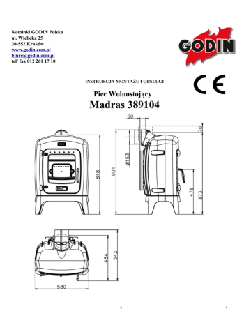 Kominki GODIN Polska ul. Wielicka 25 30-552 Kraków www.godin.com.pl [email protected] tel/ fax 012 261 17 10 INSTRUKCJA MONTAŻU I OBSŁUGI Piec Wolnostojący Madras 389104 1 1 UWAGA! Aby zapobiec ryzyku pożaru, to urządzenie musi być zainstalowane zgodnie z obowiązującymi normami i regułami technicznymi, o których mowa w instrukcji. Jego montaż musi być wykonany przez profesjonalistę lub osobę wykwalifikowaną. Urządzenie jest zgodne z normą EN 13240 i posiada certyfikat CE DANE TECHNICZNE Wymiary paleniska (cm): Otwór drzwiowy (cm): Moc nominalna: Sprawność: Przepływ masy spalin: Średnia temperatura spalin: Emisja CO: Emisja CO2: Waga: Średnica wylotu spalin: Wylot spalin: Regulacja biegu spalania: Przybliżona przestrzeń ogrzewania: Paliwo: 54 x 32 x 28 37 x 24 9 kW 78 % 6,83 g/s 299 ºC 0,19 % 11,94 % 107 kg 153 mm do góry lub do tyłu ręczna 130 do 330 m3 drewno grzewcze o wilgotności do 20%. Jako paliwo zastępcze można używać brykietów z węgla brunatnego. Wszelkie inne rodzaje paliwa są zabronione. Czas spalania 3 kg drewna o wilgotności 12% i mocy kalorycznej 15,7 MJ/kg - przy biegu normalnym: - przy biegu zwolnionym: Spalanie przy biegu normalnym: Długość polan: Minimalna odległość od materiałów palnych - z boków: - z przodu: - z tyłu: 1 godzina 3 godziny 3kg/h do 45 cm 50 cm 150 cm 35 cm CZĘŚĆ PRZEZNACZONA DLA INSTALATORA Zawsze należy przestrzegać przepisów obowiązujących w miejscu gdzie urządzenie jest instalowane. W pierwszej kolejności należy się upewnić czy przewód kominowy jest odpowiedni. KOMIN I ŁĄCZENIE Z PRZEWODEM KOMINOWYM: Rola przewodu kominowego jest zasadnicza. Jego jakość warunkuje końcowy rezultat gdyż zapewnia on dopływ powietrza do spalania i odprowadzenie spalin. Większość niedogodności odczuwanych podczas użytkowania jest spowodowana wadami przewodu kominowego. Uwag na ten temat nigdy za wiele... Nie można zadowolić się odwołaniem do wyników uzyskiwanych z poprzednim urządzeniem, którego zapotrzebowanie na powietrze mogło być całkiem inne. - dobry komin musi być zbudowany z materiałów słabo przewodzących ciepło i nie może się łatwo wychładzać - minimalna przekrój komina dla urządzeń działających przy drzwiach zamkniętych to 150 mm pod warunkiem, że obowiązujące przepisy nie stanowią inaczej. Tam gdzie to możliwe zalecamy używanie komina o wewnętrznej średnicy 180 mm. - nie jest dopuszczalne żadne zmniejszenie tego przekroju, nawet przy wylocie gdyż mogłoby to ograniczyć przepływ spalin i spowodować wydostawanie się dymu do pomieszczenia w momencie otwierania drzwi. - komin musi zaczynać się w pomieszczeniu, gdzie jest zainstalowane urządzenie. - przewód kominowy musi być idealnie szczelny i być zbudowany z materiałów dopuszczonych do urządzeń na paliwo stałe. - przewód kominowy nie może być niższy niż 5 m i jego szczyt musi przewyższać kalenicę lub wszystkie inne przeszkody znajdujące się w odległości mniejszej niż 8 m. od komina o co najmniej 40 cm. Wylot komina musi być odetkany i bez zwężenia. - ewentualne odchylenia komina od pionu muszą być bardzo łagodne. 2 2 - ciąg komina musi zawierać się między 12 a 15 Pa przy biegu normalnym i może spadać o około 5 Pa przy spalaniu zwolnionym. W żadnym wypadku ciąg nie może zejść poniżej 12 Pa przy biegu normalnym – powodowałoby to bardzo złe działanie urządzenia. Jeśli podciśnienie jest za duże, należy przewidzieć zainstalowanie regulatora ciągu. Jeśli podciśnienie jest niewystarczające należy spełnić wymagania dotyczące komina wymienione powyżej. - Jeśli przekrój przewodu kominowego jest za duży, za duża jest jego przestrzeń, którą trzeba ogrzać i nie można uzyskać normalnego ciągu. W takim wypadku należy wykonać tubowa-nie przewodu kominowego przy użyciu produktów atestowanych na paliwo stałe. Właściwości rury, która ma być użyta do zwężenia komina powinny być ocenione przez specjalistę na podstawie obowiązujących przepisów i reguł sztuki. - Usunąć zakończenia komina, w których powierzchnia przekroju wylotu jest mniejsza niż 2,5 dm2 - Zaleca się, by szczelny czyszczak znajdował około 50 cm poniżej osi rury dymowej. - Przed wykonaniem łączenia z przewodem kominowym należy się upewnić, że jest on całkowicie czysty. Jeśli to potrzebne, należy wykonać czyszczenie. - Urządzenia powinny być zainstalowane zgodnie z obowiązującymi normami i przez wykwalifikowanego pracownika. W szczególności należy przestrzegać obowiązujących norm krajowych. - Wyciągi kuchenne używane w tym samym pomieszczeniu lub w tej samej otwartej przestrzeni co piec kominkowy mogą w niebezpieczny sposób zakłócać jego działanie - Jednoczesne działanie innych pieców w tej samej otwartej przestrzeni co piec kominkowy może powodować zaburzenia ciągu. - Nigdy nie zatykać dopływów powietrza do pomieszczenia. Należy je umieścić w taki sposób, by ich zatkanie było trudne. Urządzenie używa do spalania powietrza, które pobiera z pomieszczenia – należy zatem zapewnić zasilanie pieca przez doprowadzenie wystarczającej ilości powietrza zewnętrznego. - Piec można podłączyć tylko do pojedynczego przewodu kominowego. Dysza wylotu spalin z urządzenia jest zamontowana fabrycznie z tyłu (chyba, że w danym modelu nie ma takiej opcji). Można podłączyć piec bezpośrednio do przewodu kominowego przy pomocy poziomego odcinka rury. Piece, w których jest taka opcja, można po przełożeniu dyszy łączyć z przewodem kominowym od góry WAŻNE: - Sprawdzić, czy podłoga ma wystarczającą nośność. Jeśli to konieczne należy wykonać płytę rozkładającą ciężar lub przedsięwziąć inne adekwatne środki. - jeśli podłoga jest zbudowana z materiałów palnych, należy ja odpowiednio zabezpieczyć, przy pomocy izolującej, niepalnej płyty, wychodzącej co najmniej 40 cm przed urządzenie. - uży