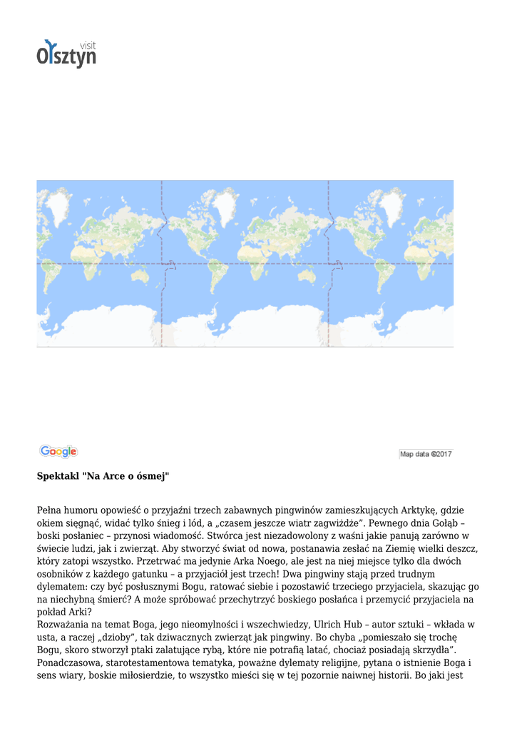 Spektakl "Na Arce o ósmej" Pełna humoru opowieść o przyjaźni trzech zabawnych pingwinów zamieszkujących Arktykę, gdzie okiem sięgnąć, widać tylko śnieg i lód, a „czasem jeszcze wiatr zagwiżdże”. Pewnego dnia Gołąb – boski posłaniec – przynosi wiadomość. Stwórca jest niezadowolony z waśni jakie panują zarówno w świecie ludzi, jak i zwierząt. Aby stworzyć świat od nowa, postanawia zesłać na Ziemię wielki deszcz, który zatopi wszystko. Przetrwać ma jedynie Arka Noego, ale jest na niej miejsce tylko dla dwóch osobników z każdego gatunku – a przyjaciół jest trzech! Dwa pingwiny stają przed trudnym dylematem: czy być posłusznymi Bogu, ratować siebie i pozostawić trzeciego przyjaciela, skazując go na niechybną śmierć? A może spróbować przechytrzyć boskiego posłańca i przemycić przyjaciela na pokład Arki? Rozważania na temat Boga, jego nieomylności i wszechwiedzy, Ulrich Hub – autor sztuki – wkłada w usta, a raczej „dzioby”, tak dziwacznych zwierząt jak pingwiny. Bo chyba „pomieszało się trochę Bogu, skoro stworzył ptaki zalatujące rybą, które nie potrafią latać, chociaż posiadają skrzydła”. Ponadczasowa, starotestamentowa tematyka, poważne dylematy religijne, pytana o istnienie Boga i sens wiary, boskie miłosierdzie, to wszystko mieści się w tej pozornie naiwnej historii. Bo jaki jest Bóg? Według bohaterów sztuki jest: przyjazny, mądry, duży i bardzo, bardzo potężny. Dlaczego jednak postanawia unicestwić wszystko, co stworzył? Czy Bóg może być omylny? I czy na pewno istnieje, skoro nie można go zobaczyć? To bardzo poważne pytania, które często padają z ust dzieci. Autor wie, że nie ma na nie prostych odpowiedzi. On tylko „oswaja” widzów z nierozwiązywalnymi problemami ludzkości, a że czyni to z humorem i wdziękiem, to owo oswajanie jest naprawdę skuteczne i atrakcyjne. Autor dramatu „Na Arce o ósmej”- Ulrich Hub, za sztukę tę został nagrodzony dwukrotnie. W 2006 r. otrzymał nagrodę za najlepsze słuchowisko dla najmłodszych, a w 2008 r. nagrodę literacką za twórczość dla dzieci – Kinderliteraturpreis. NAGRODY: Z przyjemnością informujemy, że spektakl „Na arce o ósmej” Olsztyńskiego Teatru Lalek w reżyserii Mariana Pecko otrzymał ATEST–Świadectwo Wysokiej Jakości i Poziomu Artystycznego 2011. Jest to wyróżnienie Polskiego Ośrodka Międzynarodowego Stowarzyszenia Teatrów dla Dzieci i Młodzieży ASSITEJ dla najlepszych polskich przedstawień adresowanych do młodego widza. 21 paździrnika spektakl "Na arce o ósmej" został zaprezentowany na XXV Ogólnopolskim Festiwalu Teatrów Lalek w Opolu i zdobył honorowe wyróżninie jury. Cały zespół aktorski otrzymał nagrody za role. Spektakl od lat 7. 1)Olsztyński Teatr Lalek, (2015-03-10 11:00-2015-03-10 12:10) 2)Olsztyński Teatr Lalek, (2015-03-11 10:00-2015-03-11 11:10) 3)Olsztyński Teatr Lalek, (2015-03-12 10:00-2015-03-12 11:10) 4)Olsztyński Teatr Lalek, (2015-03-13 10:00-2015-03-13 11:10) 5)Olsztyński Teatr Lalek, (2015-03-15 11:00-2015-03-15 12:10) www.visit.olsztyn.eu