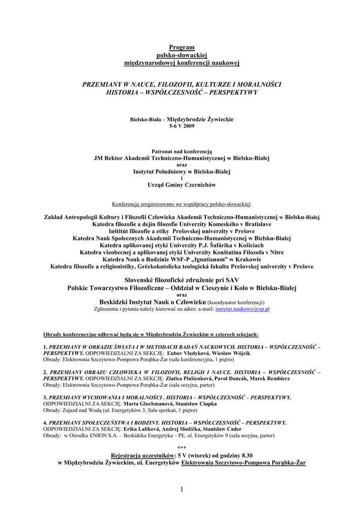 Program polsko-słowackiej międzynarodowej konferencji naukowej PRZEMIANY W NAUCE, FILOZOFII, KULTURZE I MORALNOŚCI HISTORIA – WSPÓŁCZESNOŚĆ – PERSPEKTYWY Bielsko-Biała – Międzybrodzie Żywieckie 5-6 V 2009 Patronat nad konferencją JM Rektor Akademii Techniczno-Humanistycznej w Bielsku-Białej oraz Instytut Południowy w Bielsku-Białej i Urząd Gminy Czernichów Konferencję zorganizowano we współpracy polsko-słowackiej: Zakład Antropologii Kultury i Filozofii Człowieka Akademii Techniczno-Humanistycznej w Bielsku-Białej Katedra filozofie a dejín filozofie Univerzity Komeského v Bratislave Inńtitút filozofie a etiky Preńovskej univerzity v Preńove Katedra Nauk Społecznych Akademii Techniczno-Humanistycznej w Bielsku-Białej Katedra aplikovanej etyki Univerzity P.J. Ńafárika v Końiciach Katedra vńeobecnej a aplikovanej etyki Univerzity Konńtatína Filozofa v Nitre Katedra Nauk o Rodzinie WSF-P „Ignatianum” w Krakowie Katedra filozofie a religionistiky, Gréckokatolícka teologická fakulta Preńovskej univerzity v Preńove Slovenské filozofické združenie pri SAV Polskie Towarzystwo Filozoficzne – Oddział w Cieszynie i Koło w Bielsku-Białej oraz Beskidzki Instytut Nauk o Człowieku (koordynator konferencji) Zgłoszenia i pytania należy kierować na adres: a-mail: [email protected] Obrady konferencyjne odbywać będą się w Międzybrodziu Żywieckim w czterech sekcjach: 1. PRZEMIANY W OBRAZIE ŚWIATA I W METODACH BADAŃ NAUKOWYCH. HISTORIA – WSPÓŁCZESNOŚĆ – PERSPEKTYWY. ODPOWIEDZIALNI ZA SEKCJĘ: Ľubov Vladyková, Wiesław Wójcik Obrady: Elektrownia Szczytowo-Pompowa Porąbka-Żar (sala konferencyjna, 1 piętro) 2. PRZEMIANY OBRAZU CZŁOWIEKA W FILOZOFII, RELIGII I NAUCE. HISTORIA – WSPÓŁCZESNOŚĆ – PERSPEKTYWY. ODPOWIEDZIALNI ZA SEKCJĘ: Zlatica Plańienková, Pavol Dancák, Marek Rembierz Obrady: Elektrownia Szczytowo-Pompowa Porąbka-Żar (sala sesyjna, parter) 3. PRZEMIANY WYCHOWANIA I MORALNOŚCI . HISTORIA – WSPÓŁCZESNOŚĆ – PERSPEKTYWY. ODPOWIEDZIALNI ZA SEKCJĘ: Marta Gluchmanová, Stanisław Ciupka Obrady: Zajazd nad Wodą (ul. Energetyków 3, Sala spotkań, 1 piętro) 4. PRZEMIANY SPOŁECZEŃSTWA I RODZINY. HISTORIA – WSPÓŁCZESNOŚĆ – PERSPEKTYWY. ODPOWIEDZIALNI ZA SEKCJĘ: Erika Lalíková, Andrej Slodička, Stanisław Cader Obrady: w Ośrodku ENION S.A. – Beskidzka Energetyka – PE, ul. Energetyków 9 (sala sesyjna, parter) *** Rejestracja uczestników: 5 V (wtorek) od godziny 8.30 w Międzybrodziu Żywieckim, ul. Energetyków Elektrownia Szczytowo-Pompowa Porąbka-Żar 1 *** OGÓLNY PLAN KONFERENCJI Wtorek – 5 V 2009 9.45-10.15 Uroczyste rozpoczęcie konferencji: Elektrownia Szczytowo-Pompowa Porąbka-Żar (sala sesyjna) Przywitanie Uczestników konferencji. Prezentacja założeń i przebiegu międzynarodowej konferencji. Informacja o instytucjach organizujących konferencję. 10.30-13.15 Obrady sekcji – wykłady wprowadzające i referaty w sekcjach 13.15 – zakończenie obrad sekcji 13.30 – obiad – Zajazd nad Wodą (ul. Energetyków 3) 14.30-17.15 - Obrady sekcji – wykłady wprowadzające i referaty w sekcjach 17.15. – zakończenie obrad sekcji 17.45 – zwiedzanie elektrowni wodnej 19.45 – Uroczysty bankiet w Ośrodku ENION S.A. – Beskidzka Energetyka – PE, ul. Energetyków 9 (sala sesyjna, parter). Na początku bankietu nastąpi dalsza prezentacja instytucji organizujących konferencję i omówienie prowadzonej przez nie współpracy polsko-słowackiej oraz dokonana zostanie krótka prezentacja Powszechnej Encyklopedii Filozofii. Środa – 6 V 2009 8.00. – śniadanie – Zajazd nad Wodą (ul. Energetyków 3) 8.45. – 13.15 Obrady sekcji – wykłady wprowadzające i referaty w sekcjach 13.15 – Podsumowanie i zamknięcie konferencji 13.30 – obiad – Zajazd nad Wodą (ul. Energetyków 3) SZCZEGÓŁOWY PLAN KONFERENCJI I PORZĄDEK OBRAD W SEKCJACH WYKŁAD: 20 MINUT; REFERAT: 15 MINUT; - DYSKUSJA PO WYKŁADACH I REFERATACH ODBYWAĆ SIĘ BĘDZIE NA ZAKOŃCZENIE OBRAD DANEJ CZĘŚCI PORZĄDEK OBRAD SEKCJI PIERWSZEJ: PRZEMIANY W OBRAZIE ŚWIATA I W METODACH BADAŃ NAUKOWYCH. HISTORIA – WSPÓŁCZESNOŚĆ – PERSPEKTYWY Odpowiedzialni za sekcję: Ľubov Vladyková, Wiesław Wójcik Obrady: Elektrownia Szczytowo-Pompowa Porąbka-Żar (sala konferencyjna, 1 piętro) Wtorek – 5 V 2009 9.45-10.15 Uroczyste rozpoczęcie konferencji. Przywitanie Uczestników konferencji. Prezentacja założeń i przebiegu międzynarodowej konferencji. Informacja o instytucjach organizujących konferencję. 10.30-13.15 Obrady sekcji – wykłady wprowadzające i referaty w sekcjach wykłady wprowadzające Adam Jonkisz, Postęp w nauce i filozofii nauki Marián Palenčár, K problému socio-kultúrnej determinácie vývinu vedy (Prípad Kepler a Galilei) Anna Valcerova, Dva systémy literárnej komparatistiky Wiesław Wójcik, Drugi przełom nowożytny w nauce 2 referaty Marek Rembierz, Przemiany granic nauki i granic filozofii Krzysztof Śleziński, W poszukiwaniu nowej metody badań naukowych Jakub Jonkisz, Przemiany koncepcji podmiotu i subiektywności we współczesnej filozofii umysłu /zarys problemu/ 13.15 – zakończenie obrad sekcji 13.30 – obiad 14.30-17.15 Obrady sekcji – wykłady wprowadzające i referaty w sekcjach wykłady wprowadzające Peter Krchnák, Ekologická kríza ako príležitosť k našej humanizácii a ekologizácii referaty Piotr Leśniak, Czy nauka może się skończyć? Marián Ambrozy, Eva Dirgová, Niektoré aspekty premien vzťahu vedy a viery od 17. storočia dodnes Anna Marek-Bieniasz, Problem współczesnej ateizacji nauki. Bogdan Koperski, Izydora Dąmbska a „destrukcja pojęcia faktu” w konwencjonalizmie Stanisław Ciupka, Misteryjność filozofii greckiej Wojciech Daszkiewicz, Bronisława Malinowskiego funkcjonalna koncepcja kultury 17.15. – zakończenie obrad sekcji 17.45 – zwiedzanie elektrowni wodnej 19.45 – Uroczysty bankiet. Środa – 6 