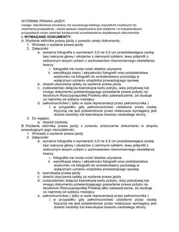 WTÓRNIK PRAWA JAZDY Uwaga: standardowe procedury nie wyczerpują katalogu wszystkich możliwych do zaistnienia przypadków - każda sprawa rozpatrywana jest odrębnie i w indywidualnych przypadkach może zaistnieć konieczność przedstawienia dodatkowych dokumentów I. WYMAGANE DOKUMENTY: A. Wydanie wtórnika prawa jazdy z powodu utraty dokumentu: 1. Wniosek o wydanie prawa jazdy 2. Załączniki: a. wyraźna fotografia o wymiarach 3,5 na 4,5 cm przedstawiająca osobę bez nakrycia głowy i okularów z ciemnymi szkłami, lewy półprofil z widocznym lewym uchem z zachowaniem równomiernego oświetlenia twarzy i. fotografia nie może nosić śladów używania ii. weryfikacja stanu i aktualności fotografii oraz podobieństwa wizerunku na fotografii do wnioskodawcy pozostają w wyłącznym uznaniu urzędnika prowadzącego sprawę b. dowód uiszczenia opłaty za wydanie prawa jazdy c. cudzoziemiec dołącza kserokopię karty pobytu, wizy pobytowej lub innego dokumentu potwierdzającego posiadanie prawa pobytu na terytorium Rzeczypospolitej Polskiej albo zaświadczenie, że studiuje co najmniej od sześciu miesięcy d. pełnomocnictwo ( tylko w razie reprezentacji przez pełnomocnika ) i. w przypadku gdy pełnomocnictwo udzielone przez osobę fizyczną nie jest potwierdzone przez notariusza wymagany jest dowód osobisty lub kserokopia dowodu osobistego strony 3. Do wglądu: a. dowód osobisty B. Wydanie wtórnika prawa jazdy z powodu zniszczenia dokumentu w stopniu powodującym jego nieczytelność: 1. Wniosek o wydanie prawa jazdy 2. Załączniki: a. wyraźna fotografia o wymiarach 3,5 na 4,5 cm przedstawiająca osobę bez nakrycia głowy i okularów z ciemnymi szkłami, lewy półprofil z widocznym lewym uchem z zachowaniem równomiernego oświetlenia twarzy i. fotografia nie może nosić śladów używania ii. weryfikacja stanu i aktualności fotografii oraz podobieństwa wizerunku na fotografii do wnioskodawcy pozostają w wyłącznym uznaniu urzędnika prowadzącego sprawę b. kserokopia prawa jazdy c. dowód uiszczenia opłaty za wydanie prawa jazdy d. cudzoziemiec dołącza kserokopię karty pobytu, wizy pobytowej lub innego dokumentu potwierdzającego posiadanie prawa pobytu na terytorium Rzeczypospolitej Polskiej albo zaświadczenie, że studiuje co najmniej od sześciu miesięcy e. pełnomocnictwo ( tylko w razie reprezentacji przez pełnomocnika ) i. w przypadku gdy pełnomocnictwo udzielone przez osobę fizyczną nie jest potwierdzone przez notariusza wymagany jest dowód osobisty lub kserokopia dowodu osobistego strony 3. Do wglądu: a. dowód osobisty b. prawo jazdy C. Wydanie wtórnika prawa jazdy z powodu zmiany danych w dokumencie, w zakresie adresu zamieszkania ( stałego zameldowania ) lub nazwiska: 1. Wniosek o wydanie prawa jazdy 2. Załączniki: a. wyraźna fotografia o wymiarach 3,5 na 4,5 cm przedstawiająca osobę bez nakrycia głowy i okularów z ciemnymi szkłami, lewy półprofil z widocznym lewym uchem z zachowaniem równomiernego oświetlenia twarzy i. fotografia nie może nosić śladów używania ii. weryfikacja stanu i aktualności fotografii oraz podobieństwa wizerunku na fotografii do wnioskodawcy pozostają w wyłącznym uznaniu urzędnika prowadzącego sprawę b. kserokopia prawa jazdy c. dokumenty potwierdzające zmianę danych d. dowód uiszczenia opłaty za wydanie prawa jazdy e. cudzoziemiec dołącza kserokopię karty pobytu, wizy pobytowej lub innego dokumentu potwierdzającego posiadanie prawa pobytu na terytorium Rzeczypospolitej Polskiej albo zaświadczenie, że studiuje co najmniej od sześciu miesięcy f. pełnomocnictwo ( tylko w razie reprezentacji przez pełnomocnika ) i. w przypadku gdy pełnomocnictwo udzielone przez osobę fizyczną nie jest potwierdzone przez notariusza wymagany jest dowód osobisty lub kserokopia dowodu osobistego strony 3. Do wglądu: a. dowód osobisty b. prawo jazdy E. Wydanie wtórnika prawa jazdy z powodu zmiany danych w dokumencie w zakresie daty ważności uzyskanego uprawnienia: 1. Wniosek o wydanie prawa jazdy 2. Załączniki: a. wyraźna fotografia o wymiarach 3,5 na 4,5 cm przedstawiająca osobę bez nakrycia głowy i okularów z ciemnymi szkłami, lewy półprofil z widocznym lewym uchem z zachowaniem równomiernego oświetlenia twarzy i. fotografia nie może nosić śladów używania ii. weryfikacja stanu i aktualności fotografii oraz podobieństwa wizerunku na fotografii do wnioskodawcy pozostają w wyłącznym uznaniu urzędnika prowadzącego sprawę b. kserokopia prawa jazdy c. orzeczenie lekarskie o braku przeciwwskazań zdrowotnych do kierowania pojazdem d. dowód uiszczenia opłaty za wydanie prawa jazdy e. cudzoziemiec dołącza kserokopię karty pobytu, wizy pobytowej lub innego dokumentu potwierdzającego posiadanie prawa pobytu na terytorium Rzeczypospolitej Polskiej albo zaświadczenie, że studiuje co najmniej od sześciu miesięcy 3. Do wglądu: a. dowód osobisty b. prawo jazdy II. OPŁATY: 1. za wydanie wtórnika prawa jazdy - 100,50 zł 2. skarbowa - od jednego stosunku pełnomocnictwa - 17,00 zł [ z opłaty skarbowej zwolnieni są małżonkowie, dzieci, rodzeństwo i rodzice strony (warunkiem zwolnienia z opłaty skarbowej jest uwzględnienie stopnia pokrewieństwa w pełnomocnictwie)] Opłaty komunikacyjne w Starostwie Powiatowym w Gryficach wnosi się na rachunek: Starostwo Powiatowe, 72-300 Gryfice, Bank Gospodarki Żywnościowej S.A. O/O Gryfice, NRB: 74203000451110000000543040 . Bez prowizji wpłaty dokonywać można w kasie Starostwa Powiatowego Gryfice, znajdującej się w budynku Wydziału Komunikacji, Transportu i Dróg Powiatowych przy ulicy Piłsudskiego 18 w Gryficach (II piętro, pokój 26) Opłatę skarbową jeżeli jest wymagana wnosi się na rachunek: Urząd Miasta i Gminy Gryfice, 72-300 Gryfice, pl. Zwycięstwa 37, NRB: 67937600010000054720010007. Bez prowizji wpłat dokonywać można w kasie Starostwa Powiatowego Gryfice, znajdującej się w budynku Wydziału Komunika