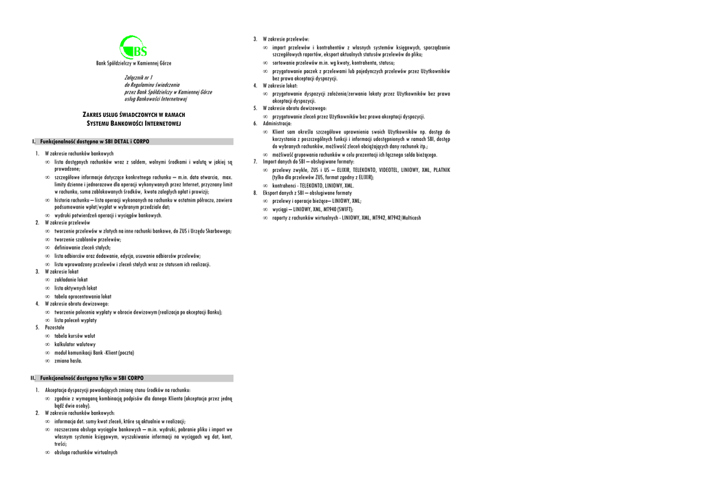 Bank Spółdzielczy w Kamiennej Górze Załącznik nr 1 do Regulaminu świadczenia przez Bank Spółdzielczy w Kamiennej Górze usług Bankowości Internetowej ZAKRES USŁUG ŚWIADCZONYCH W RAMACH SYSTEMU BANKOWOŚCI INTERNETOWEJ I. Funkcjonalność dostępna w SBI DETAL i CORPO 1. W zakresie rachunków bankowych • lista dostępnych rachunków wraz z saldem, wolnymi środkami i walutą w jakiej są prowadzone; • szczegółowe informacje dotyczące konkretnego rachunku – m.in. data otwarcia, max. limity dzienne i jednorazowe dla operacji wykonywanych przez Internet, przyznany limit w rachunku, suma zablokowanych środków, kwota zaległych opłat i prowizji; • historia rachunku – lista operacji wykonanych na rachunku w ostatnim półroczu, zawiera podsumowanie wpłat/wypłat w wybranym przedziale dat; • wydruki potwierdzeń operacji i wyciągów bankowych. 2. W zakresie przelewów • tworzenie przelewów w złotych na inne rachunki bankowe, do ZUS i Urzędu Skarbowego; • tworzenie szablonów przelewów; • definiowanie zleceń stałych; • lista odbiorców oraz dodawanie, edycja, usuwanie odbiorców przelewów; • lista wprowadzony przelewów i zleceń stałych wraz ze statusem ich realizacji. 3. W zakresie lokat • zakładanie lokat • lista aktywnych lokat • tabela oprocentowania lokat 4. W zakresie obrotu dewizowego: • tworzenie polecenia wypłaty w obrocie dewizowym (realizacja po akceptacji Banku); • lista poleceń wypłaty 5. Pozostałe • tabela kursów walut • kalkulator walutowy • moduł komunikacji Bank -Klient (poczta) • zmiana hasła. II. Funkcjonalność dostępna tylko w SBI CORPO 1. Akceptacja dyspozycji powodujących zmianę stanu środków na rachunku: • zgodnie z wymaganą kombinacją podpisów dla danego Klienta (akceptacja przez jedną bądź dwie osoby). 2. W zakresie rachunków bankowych: • informacja dot. sumy kwot zleceń, które są aktualnie w realizacji; • rozszerzona obsługa wyciągów bankowych – m.in. wydruki, pobranie pliku i import we własnym systemie księgowym, wyszukiwanie informacji na wyciągach wg dat, kont, treści; • obsługa rachunków wirtualnych 3. W zakresie przelewów: • import przelewów i kontrahentów z własnych systemów księgowych, sporządzanie szczegółowych raportów, eksport aktualnych statusów przelewów do pliku; • sortowanie przelewów m.in. wg kwoty, kontrahenta, statusu; • przygotowanie paczek z przelewami lub pojedynczych przelewów przez Użytkowników bez prawa akceptacji dyspozycji. 4. W zakresie lokat: • przygotowanie dyspozycji założenia/zerwania lokaty przez Użytkowników bez prawa akceptacji dyspozycji. 5. W zakresie obrotu dewizowego: • przygotowanie zleceń przez Użytkowników bez prawa akceptacji dyspozycji. 6. Administracja: • Klient sam określa szczegółowe uprawnienia swoich Użytkowników np. dostęp do korzystania z poszczególnych funkcji i informacji udostępnionych w ramach SBI, dostęp do wybranych rachunków, możliwość zleceń obciążających dany rachunek itp.; • możliwość grupowania rachunków w celu prezentacji ich łącznego salda bieżącego. 7. Import danych do SBI – obsługiwane formaty: • przelewy zwykłe, ZUS i US – ELIXIR, TELEKONTO, VIDEOTEL, LINIOWY, XML, PŁATNIK (tylko dla przelewów ZUS, format zgodny z ELIXIR); • kontrahenci - TELEKONTO, LINIOWY, XML. 8. Eksport danych z SBI – obsługiwane formaty • przelewy i operacje bieżące– LINIOWY, XML; • wyciągi – LINIOWY, XML, MT940 (SWIFT); • raporty z rachunków wirtualnych - LINIOWY, XML, MT942, MT942/Multicash