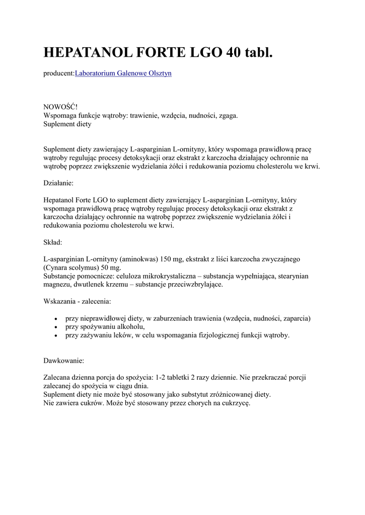 HEPATANOL FORTE LGO 40 tabl. producent:Laboratorium Galenowe Olsztyn NOWOŚĆ! Wspomaga funkcje wątroby: trawienie, wzdęcia, nudności, zgaga. Suplement diety Suplement diety zawierający L-asparginian L-ornityny, który wspomaga prawidłową pracę wątroby regulując procesy detoksykacji oraz ekstrakt z karczocha działający ochronnie na wątrobę poprzez zwiększenie wydzielania żółci i redukowania poziomu cholesterolu we krwi. Działanie: Hepatanol Forte LGO to suplement diety zawierający L-asparginian L-ornityny, który wspomaga prawidłową pracę wątroby regulując procesy detoksykacji oraz ekstrakt z karczocha działający ochronnie na wątrobę poprzez zwiększenie wydzielania żółci i redukowania poziomu cholesterolu we krwi. Skład: L-asparginian L-ornityny (aminokwas) 150 mg, ekstrakt z liści karczocha zwyczajnego (Cynara scolymus) 50 mg. Substancje pomocnicze: celuloza mikrokrystaliczna – substancja wypełniająca, stearynian magnezu, dwutlenek krzemu – substancje przeciwzbrylające. Wskazania - zalecenia: przy nieprawidłowej diety, w zaburzeniach trawienia (wzdęcia, nudności, zaparcia) przy spożywaniu alkoholu, przy zażywaniu leków, w celu wspomagania fizjologicznej funkcji wątroby. Dawkowanie: Zalecana dzienna porcja do spożycia: 1-2 tabletki 2 razy dziennie. Nie przekraczać porcji zalecanej do spożycia w ciągu dnia. Suplement diety nie może być stosowany jako substytut zróżnicowanej diety. Nie zawiera cukrów. Może być stosowany przez chorych na cukrzycę.