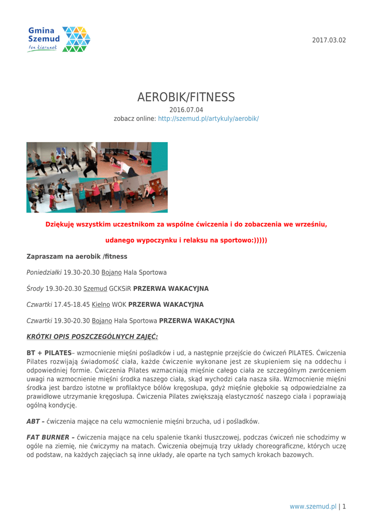 2017.03.02 AEROBIK/FITNESS 2016.07.04 zobacz online: http://szemud.pl/artykuly/aerobik/ Dziękuję wszystkim uczestnikom za wspólne ćwiczenia i do zobaczenia we wrześniu, udanego wypoczynku i relaksu na sportowo:))))) Zapraszam na aerobik /fitness Poniedziałki 19.30-20.30 Bojano Hala Sportowa Środy 19.30-20.30 Szemud GCKSiR PRZERWA WAKACYJNA Czwartki 17.45-18.45 Kielno WOK PRZERWA WAKACYJNA Czwartki 19.30-20.30 Bojano Hala Sportowa PRZERWA WAKACYJNA KRÓTKI OPIS POSZCZEGÓLNYCH ZAJĘĆ: BT + PILATES– wzmocnienie mięśni pośladków i ud, a następnie przejście do ćwiczeń PILATES. Ćwiczenia Pilates rozwijają świadomość ciała, każde ćwiczenie wykonane jest ze skupieniem się na oddechu i odpowiedniej formie. Ćwiczenia Pilates wzmacniają mięśnie całego ciała ze szczególnym zwróceniem uwagi na wzmocnienie mięśni środka naszego ciała, skąd wychodzi cała nasza siła. Wzmocnienie mięśni środka jest bardzo istotne w profilaktyce bólów kręgosłupa, gdyż mięśnie głębokie są odpowiedzialne za prawidłowe utrzymanie kręgosłupa. Ćwiczenia Pilates zwiększają elastyczność naszego ciała i poprawiają ogólną kondycję. ABT – ćwiczenia mające na celu wzmocnienie mięśni brzucha, ud i pośladków. FAT BURNER – ćwiczenia mające na celu spalenie tkanki tłuszczowej, podczas ćwiczeń nie schodzimy w ogóle na ziemię, nie ćwiczymy na matach. Ćwiczenia obejmują trzy układy choreograficzne, których uczę od podstaw, na każdych zajęciach są inne układy, ale oparte na tych samych krokach bazowych. www.szemud.pl | 1 2017.03.02 SHAPE – ćwiczenia wzmacniające partie dużych mięśni całego ciała. Na tych ćwiczeniach skupiamy się nad tym aby wzmocnić mięśnie ramion, pleców, klatki piersiowej, brzucha, pośladków i ud. Do ćwiczeń wykorzystujemy hantle o wadze 0,5 kg / 1kg. FIT BALL /SHAPE – Fit Ball to ćwiczenia z użyciem dużych piłek, gimnastyka na tych piłkach wzmacnia mięśnie naszego ciała, angażuje mięśnie odpowiedzialne za utrzymanie prawidłowej postawy ciała (mięśnie posturalne), są to ćwiczenia równoważne. Oprócz ćwiczeń na piłkach w czasie tych zajęć ćwiczymy również bez ich użycia, na matach z ciężarkami 0,5 kg/1 kg wzmacniając partie dużych mięśni całego ciała. ZGRABNA FIGURA – ćwiczenia polegające na połączeniu dynamiki ze wzmacnianiem, połowa zajęć to wzmacnianie dużych partii mięśniowych (plecy, ramiona, brzuch, uda, pośladki), druga połowa to spalanie tkanki tłuszczowej polegające na nauce układu choreograficznego do dynamicznej muzyki. Każdy rodzaj zajęć rozpoczyna się od krótkiej rozgrzewki i rozciągnięcia grup mięśniowych, które będą ćwiczone, następnie przechodzimy do głównej części zajęć czyli do celu naszych zajęć, który trwa 40 minut, po czym na koniec rozciągamy ćwiczone partie mięśni. Kontakt: Weronika 505 581 822 Do zobaczenia :):) www.szemud.pl | 2