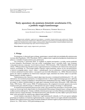 71 Prace Instytutu Mechaniki Górotworu PAN Tom 6, nr 1-2, (2004), s. 71-78 © Instytut Mechaniki Górotworu PAN Testy aparatury do pomiaru kinetyki uwalniania CO2 z próbek węgla kamiennego JULIUSZ TOPOLNICKI, MIROSŁAW WIERZBICKI, NORBERT SKOCZYLAS Instytut Mechaniki Górotworu PAN, ul. Reymonta 27; 30-059 Kraków Streszczenie Odgazowanie pokładów węglowych jest jednym z warunków bezpieczeństwa prac górniczych. Podjęta została próba wykorzystania zbudowanej w IMG PAN aparatury do grawimetrycznych badań odgazowania próbek węglowych. Przedstawione zostały wstępne wyniki pomiarów odgazowania próbek o różnych frakcjach ziarnowych. Podjęto próbę fenomenologicznego opisu obserwowanego procesu. Słowa kluczowe: węgiel, sorpcja, odgazowanie, grawimetria 1. Wstęp Przyjmujemy, iż obecność gazu wolnego, sprężonego w porach skały jest niezbędna dla zainicjowania wyrzutu skał [Topolnicki, 1999; Wierzbicki, 2003], a odgazowanie węgla przed podjęciem eksploatacji jest jednym z warunków bezpieczeństwa prac górniczych. Gaz uwięziony w porowatej skale, ze względu na stopień powiązania z tą skałą, można podzielić na dwie kategorie. Rozróżniamy więc gaz wolny, wypełniający pory i szczeliny skały i gaz związany z nią poprzez procesy sorpcyjne. Liczni autorzy [Lasoń, 1988; Kawęcka, 1988; Nodzeński, 2000; Seewald i Klein, 1988] przedstawiają charakterystykę węgli kamiennych w kontekście ich właściwości sorpcyjnych. Autorzy stwierdzają, że z fizycznego punktu widzenia węgiel kamienny zalicza się do ciał porowatych, w których występują makro-, mezo-, mikro- i submikropory. Jest on sorbentem o niesztywnej strukturze, w którym udział powierzchni makro- i mezoporów jest niewielki [Mastalerz i in., 2004]. Obecność dużych porów nie wpływa zasadniczo na właściwości sorpcyjne węgla, natomiast ma istotny wpływ na zjawisko filtracji poprzez ośrodek węglowy. Najistotniejszą rolę w procesie sorpcji odgrywają więc pory o rozmiarach molekularnych (< 5Å- submikropory). Za Lasoniem przyjmujemy, że zmagazynowany w złożu węgla kamiennego gaz jest w głównej mierze związany z sorpcją występującą w obszarach porów molekularnych [Lasoń, 1988a]. Na główny udział tej sorpcji w całości zasorbowanego na węglu gazu wskazują również prace [Kawęcka, 1988; MilewskaDuda, 1990; Karta, 1982; Larsen, 2004]. W niniejszej pracy, dla wstępnych rozważań ograniczymy się do rozpatrywania gazu adsorbowanego w mikroporach oraz gazu wolnego zawartego w makroporach. W nienaruszonych partiach górotworu gaz wolny i gaz zasorbowany pozostają w równowadze. Naruszenie tej równowagi może doprowadzić do uruchomienia filtracyjnego transportu gazu wolnego, głównie wzdłuż systemu makroporów. Zmiany rozkładu ciśnienia porowego wywołane filtracją uruchamiają procesy dyfuzji i procesy sorpcji-desorpcji. Ten łańcuch procesów, jeśli umożliwi się stały odpływ gazu poza obszar skały, może prowadzić do stopniowego odgazowania pokładu. Liczne badania sorpcyjnych właściwości węgli kamiennych wskazały, że CO2 jest gazem najlepiej penetrującym strukturę wewnętrzną węgli kamiennych, a sorpcja właściwa na węglu zachodzi momentalnie. Badania nad szybkością procesu sorpcji na bardzo drobnych ziarnach węglowych prowadzone przez Gawora [Gawor i in., 1990; Gawor, 1993] potwierdzają tę tezę. 72 Juliusz Topolnicki, Mirosław Wierzbicki, Norbert Skoczylas Przenoszenie substancji w sorbencie porowatym zachodzi według różnych mechanizmów, wszystkie jednak znane sposoby przenoszenia zależą od gradientu stężeń (ciśnień), więc kinetyka uwalniania gazu jest uwarunkowana procesami dyfuzji w obrębie pojedynczych ziaren [Lasoń, 1988; Gawor i in., 1990]. Złożom węgla kamiennego towarzyszą gazy takie jak CO2, CH4 oraz woda. Ciśnienie porowe w nienaruszonych partiach złoża węgla kamiennego może osiągać wartości rzędu 1 MPa. Ilość gazu zawartego w 1 tonie węgla sięga kilkunastu kilogramów (normalnych m3). W pracach dotyczących kinetyki sorpcji–desorpcji [Paderewski, 1999] rozważa złoże ziaren sorbentu obmywane płynem zawierającym sorbat. Dla wstępnej analizy procesu odgazowania przyjmuje się, że system wypełnionych gazem wolnym makroporów i spękań dzieli objętość węgla na wyodrębnione obszary pocięte siecią porów o mniejszych wymiarach. Transport gazu w tych wyodrębnionych obszarach ma charakter dyfuzji napędzanej gradientem stężenia gazu zdeponowanego w węglu. Przyjmujemy, że gaz związany w wyniku całego spektrum procesów adsorpcyjnych i absorpcyjnych przemieszcza się dyfuzyjnie do ścianek makroporów, a następnie uwalnia się do ich wnętrza. Dalszy transport gazu wolnego wzdłuż sieci makroporów ma charakter filtracji wywołanej gradientem ciśnienia porowego. Odgazowanie złoża łączy się z transportem znacznych ilości (do kilkudziesięciu normalnych m3 gazu na 1 m3 złoża) gazu pierwotnie związanego z organiczną substancją węglową z głębi złoża do ociosu. Filtracyjny transport tak wielkich ilości gazu w systemie makroporów wiąże się ze znaczną modyfikacją ciśnienia porowego. Ciśnienie porowe decyduje o przebiegu dyfuzji w strukturze porowatej węgla. Przebieg odgazowania kształtuje więc wzajemne oddziaływanie filtracji odbywającej się w systemie makroporów i dyfuzji w obszarach gdzie zmagazynowany jest gaz. W warunkach in situ wpływy ciśnienia górotworu jak i ciśnienia gazów kopalnianych mogą powodować zmianę struktury porowej złoża. Jak zaznaczono wcześniej, węgiel kamienny można traktować jako układ biporowaty, którego szczególną cechą jest to, że obszary mikroporowate są albo sprężane przez wysokie ciśnienie płynów porowych, czego konsekwencją jest rozszerzanie makroporów, albo rozszerzają się w wyniku pęcznienia powodowanego przez zjawiska adsorpcyjno-absorpcyjne i w skutek tego zawężają makrop