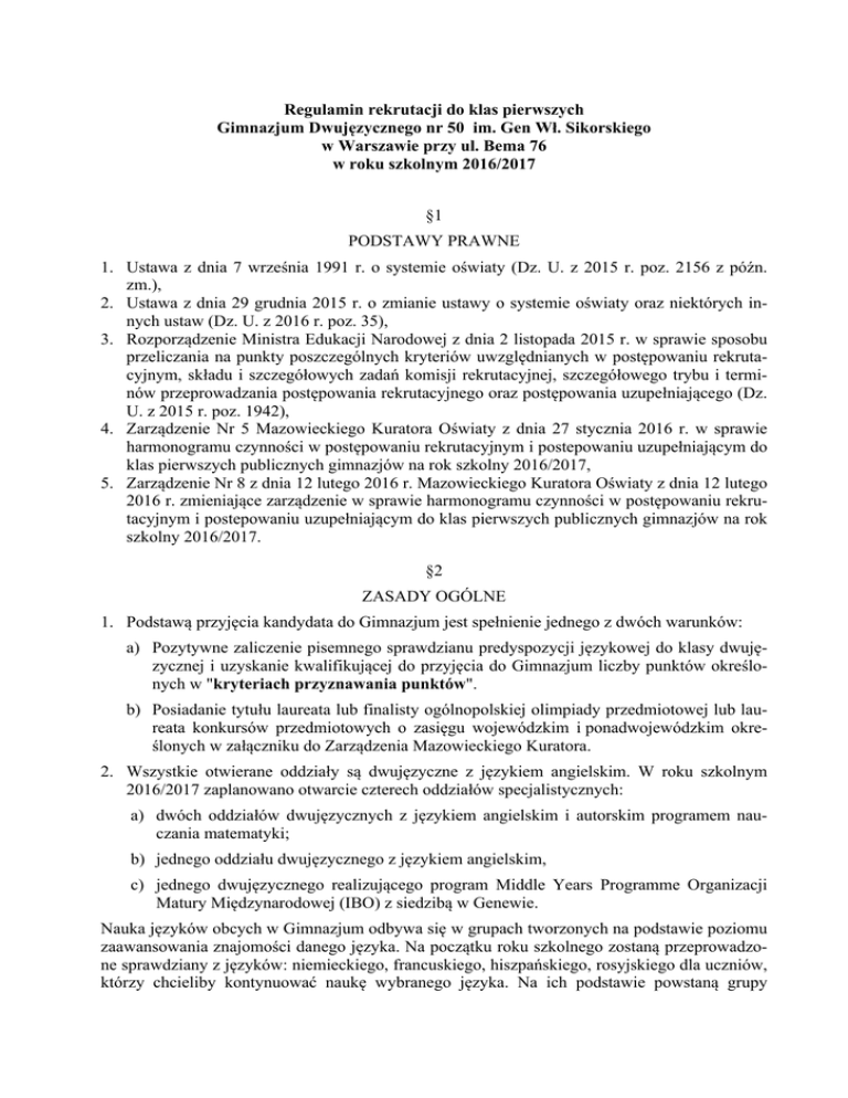 Regulamin rekrutacji do klas pierwszych Gimnazjum Dwujęzycznego nr 50 im. Gen Wł. Sikorskiego w Warszawie przy ul. Bema 76 w roku szkolnym 2016/2017 §1 PODSTAWY PRAWNE 1. Ustawa z dnia 7 września 1991 r. o systemie oświaty (Dz. U. z 2015 r. poz. 2156 z późn. zm.), 2. Ustawa z dnia 29 grudnia 2015 r. o zmianie ustawy o systemie oświaty oraz niektórych innych ustaw (Dz. U. z 2016 r. poz. 35), 3. Rozporządzenie Ministra Edukacji Narodowej z dnia 2 listopada 2015 r. w sprawie sposobu przeliczania na punkty poszczególnych kryteriów uwzględnianych w postępowaniu rekrutacyjnym, składu i szczegółowych zadań komisji rekrutacyjnej, szczegółowego trybu i terminów przeprowadzania postępowania rekrutacyjnego oraz postępowania uzupełniającego (Dz. U. z 2015 r. poz. 1942), 4. Zarządzenie Nr 5 Mazowieckiego Kuratora Oświaty z dnia 27 stycznia 2016 r. w sprawie harmonogramu czynności w postępowaniu rekrutacyjnym i postepowaniu uzupełniającym do klas pierwszych publicznych gimnazjów na rok szkolny 2016/2017, 5. Zarządzenie Nr 8 z dnia 12 lutego 2016 r. Mazowieckiego Kuratora Oświaty z dnia 12 lutego 2016 r. zmieniające zarządzenie w sprawie harmonogramu czynności w postępowaniu rekrutacyjnym i postepowaniu uzupełniającym do klas pierwszych publicznych gimnazjów na rok szkolny 2016/2017. §2 ZASADY OGÓLNE 1. Podstawą przyjęcia kandydata do Gimnazjum jest spełnienie jednego z dwóch warunków: a) Pozytywne zaliczenie pisemnego sprawdzianu predyspozycji językowej do klasy dwujęzycznej i uzyskanie kwalifikującej do przyjęcia do Gimnazjum liczby punktów określonych w "kryteriach przyznawania punktów". b) Posiadanie tytułu laureata lub finalisty ogólnopolskiej olimpiady przedmiotowej lub laureata konkursów przedmiotowych o zasięgu wojewódzkim i ponadwojewódzkim określonych w załączniku do Zarządzenia Mazowieckiego Kuratora. 2. Wszystkie otwierane oddziały są dwujęzyczne z językiem angielskim. W roku szkolnym 2016/2017 zaplanowano otwarcie czterech oddziałów specjalistycznych: a) dwóch oddziałów dwujęzycznych z językiem angielskim i autorskim programem nauczania matematyki; b) jednego oddziału dwujęzycznego z językiem angielskim, c) jednego dwujęzycznego realizującego program Middle Years Programme Organizacji Matury Międzynarodowej (IBO) z siedzibą w Genewie. Nauka języków obcych w Gimnazjum odbywa się w grupach tworzonych na podstawie poziomu zaawansowania znajomości danego języka. Na początku roku szkolnego zostaną przeprowadzone sprawdziany z języków: niemieckiego, francuskiego, hiszpańskiego, rosyjskiego dla uczniów, którzy chcieliby kontynuować naukę wybranego języka. Na ich podstawie powstaną grupy o różnych poziomach: od początkowego do zaawansowanego. W przypadku zbyt niskiej liczby (poniżej 10) kandydatów wybierających określony poziom danego języka, grupy nie tworzy się. §3 TERMINARZ REKRUTACJI ZASADNICZEJ W okresie od 11 kwietnia od godziny 9:00 do 10 maja 2016 r. do godziny 16:00 kandydaci składają w sekretariacie szkoły następujące dokumenty: 1. Wydruk wniosku z systemu elektronicznego wspomagania rekrutacji jeśli wybrany oddział Gimnazjum Dwujęzycznego nr 50 jest pierwszym na liście preferencji. 2. Zgłoszenie przystąpienia do sprawdzianu uzdolnień kierunkowych (druk zgłoszenia dostępny na naszej stronie internetowej oraz w sekretariacie Gimnazjum) z informacją o wyborze drugiego języka obcego: niemieckiego, francuskiego, rosyjskiego lub hiszpańskiego oraz okresu dotychczasowej nauki tego języka. 3. Jedno zdjęcie podpisane na odwrocie. Wszystkich kandydatów obowiązuje pisemny sprawdzian predyspozycji językowych do klas dwujęzycznych, który odbędzie się w terminie 18 maja 2016 r. godz. 9:00 – 10:30 Ostateczny termin ogłoszenia wyników sprawdzianu: 21 maja 2016 r. do godz. 16:00. Sprawdzian predyspozycji językowych jest wzajemnie uznawany na mocy porozumienia dyrektorów szkół przez następujące warszawskie gimnazja prowadzące oddziały dwujęzyczne: 1. Gimnazjum nr 1 z Oddziałami Dwujęzycznymi im. Roberta Schumana ul. Tyniecka 25 02-615 Warszawa 2. Gimnazjum z Oddziałami Dwujęzycznymi nr 18 im. Ignacego Jana Paderewskiego ul. Angorska 2 03-913 Warszawa 3. Gimnazjum z Oddziałami Dwujęzycznymi nr 19 im. Bolesława Prusa ul. Zwycięzców 7/9 03-936 Warszawa 4. Gimnazjum z Oddziałami Dwujęzycznymi nr 25 im. Czesława Niemena ul. Zwycięzców 44 03-938 Warszawa 5. Gimnazjum nr 27 z Oddziałami Dwujęzycznymi im. Orląt Lwowskich ul. gen. Abrahama R. 10 03-982 Warszawa 6. Zespół Szkół nr 66 w Warszawie Gimnazjum Dwujęzyczne nr 33 im. Stefana Batorego ul. Myśliwiecka 6 00-459 Warszawa 7. Zespół Szkół nr 67 Gimnazjum Dwujęzyczne nr 34 im. Narcyzy Żmichowskiej ul. Klonowa 16 00-951 Warszawa 8. Gimnazjum Dwujęzyczne nr 42 im. Bohaterek Powstania Warszawskiego ul. Twarda 8/12 00-105 Warszawa 9. Gimnazjum nr 44 im. Generała Pawła Chrzanowskiego ul. Smolna 30 00-375 Warszawa 10. Gimnazjum nr 47 z Oddziałami Dwujęzycznymi im. Marszałka Józefa Piłsudskiego ul. Grenady 16 01-154 Warszawa 11. Gimnazjum nr 49 z Oddziałami Dwujęzycznymi im. Stefana Starzyńskiego ul. Smocza 19 01-051 Warszawa 12. Gimnazjum Dwujęzyczne nr 50 im. gen. Władysława Sikorskiego w Zespole Szkół nr 117 ul. gen. Józefa Bema 76 01-225 Warszawa 13. Gimnazjum Dwujęzyczne nr 53 im. Stefanii Sempołowskiej ul. Ks. J. Popiełuszki 5 01-786 Warszawa 14. Gimnazjum nr 58 z Oddziałami Dwujęzycznymi im. Władysława IV ul. Jagiellońska 38 03-719 Warszawa 15. Gimnazjum Dwujęzyczne nr 59 ul. Wiktorska 30/32 02-587 Warszawa 16. Gimnazjum z Oddziałami Dwujęzycznymi nr 72 im. Antoniego Bolesława Dobrowolskiego ul. Przybyszewskiego 45 01-849 Warszawa 17. Gimnazjum z Oddziałami Dwujęzycznymi nr 83 im. Konstancji Markiewicz ul. Andriollego M. E. 1 01-494 Warszawa 18. Gimnazjum z Oddziałami Dwujęzycznymi nr 93 im. Księżnej Izabeli Czartoryskiej ul. Szolc-Rogozińskiego 2 02-7