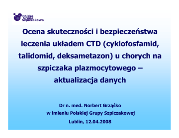 Ocena skuteczności i bezpieczeństwa leczenia układem CTD (cyklofosfamid, talidomid, deksametazon) u chorych na szpiczaka plazmocytowego – aktualizacja danych Dr n. med. Norbert Grząśko w imieniu Polskiej Grupy Szpiczakowej Lublin, 12.04.2008 Cel badania Głównym celem badania była obserwacja tolerancji schematu leczniczego CTD (cyklofosfamid, talidomid, deksametazon) oraz określenie częstości odpowiedzi na leczenie w chorych z nowo rozpoznanym lub opornym/nawrotowym szpiczakiem plazmocytowym (MM). Badanie przeprowadzono według protokołu zatwierdzonego przez Komisję Bioetyczną AM w Lublinie. Wszyscy pacjenci wyrazili pisemną zgodę na udział w badaniu. Kryteria włączenia nowo rozpoznany lub oporny/nawrotowy MM stan ogólny w skali Karnofsky’ego ≥ 60 ANC ≥ 2.0 G/L AST i ALT ≤2.5 x górna granica normy bilirubina ≤1.5 x górna granica normy Kryteria wyłączenia polineuropatia obwodowa st. III i IV wg WHO objawowa zastoinowa niewydolność serca niestabilna dusznica bolesna zaburzenia rytmu serca zaburzenia krążenia mózgowego choroba psychiczna oczekiwany czas przeżycia poniżej 3 miesięcy Schemat leczenia cyklofosfamid 500 mg/m2 i. v. w dniu 1 lub sumaryczna dawka 625 mg/m2 p. o. w dniach 1-4 deksametazon 20 mg/d p. o. w dniach 1-4 i 8-11 talidomid 100 mg/d p. o. codziennie profilaktyka przeciwzakrzepowa: kwas acetylosalicylowy 75 mg/d p. o. cykle leczenia powtarzane co 3 tygodnie do progresji choroby lub przeprowadzenia autoBMT Ocena odpowiedzi na leczenie: zmodyfikowane kryteria EBMT remisja całkowita (CR) – brak białka monoklonalnego w immunofiksacji, 2 oznaczenia w odstępie 6 tygodni bardzo dobra odpowiedź (VGPR) – redukcja stężenia białka monoklonalnego o >75%, immunofiksacja (+) dobra odpowiedź (PR) – redukcja stężenia białka monoklonalnego o 50-75% mała odpowiedź (MR) – redukcja stężenia białka monoklonalnego o 25-50% stabilizacja choroby (SD) – zmiana stężenia białka monoklonalnego o ±25% progresja choroby (PD) – zwiększenie stężenia białka monoklonalnego >25% wyniki leczenia oceniano co 3 cykle oraz 6 tygodni po zakończeniu terapii, a następnie co 3 miesiące aż do progresji choroby Charakterystyka chorych przed leczeniem liczba chorych płeć stan choroby przed CTD 94 m – 53 k – 41 nowe rozpoznanie – 39 oporność/nawrót – 55 stadium według Durie / ISS I – 8 / 37 II – 35 / 22 III – 51 / 35 łańcuch ciężki łańcuch lekki IgG – 63 IgA – 23 ch. ł. l. – 8 kappa – 73 lambda – 21 Charakterystyka chorych przed leczeniem Parametr Mediana (zakres) wiek (lata) 58 (23 – 84) czas od rozpoznania (miesiące) β2-mikroglobulina (mg/l) kreatynina (mg/dl) PLT (G/l) HGB (g/dl) albuminy (g/dl) białko monoklonalne (g/dl) 8 (0-134) 3.79 (1.18 – 32.22) 1.01 (0.54 – 6.00) 207 (14 – 482) 11.2 (4.8 - 16.0) 3.84 (1.9 - 5.6) 5.30 (3.13 - 15.19) Wyniki leczenia 9 analizy wyników leczenia dokonano w grupie 94 chorych, którzy ukończyli przynajmniej 3 cykle leczenia 9 30 chorych zakończyło udział w badaniu: 19 – progresja 5 – objawy uboczne 6 – przeprowadzenie transplantacji szpiku (5 – autoBMT, 1 – alloBMT) 9 12 chorych zmarło: 8 – progresja choroby 4 – objawy niepożądane Odpowiedź na leczenie w całej grupie badanej (n=94) 34,0 odsetek odpowiedzi (% ) 35 całkowita odpowiedź 30 CR 23,4 25 20 16,0 15 11,7 10,6 10 5 0 4,3 CR VGPR PR MR SD PD 68 (72.3%) 4 (4.3%) VGPR 22 (23.4%) PR 32 (34.0%) MR 10 (10.6%) SD 15 (16.0%) PD 11 (11.7%) Odpowiedź na leczenie u chorych z nowo rozpoznanym MM (n=39) 46,1 odsetek odpowiedzi (% ) 50 45 całkowita odpowiedź 40 CR 35 VGPR 11 (28.2%) PR 18 (46.1%) 25 MR 1 (2.6%) 20 SD 4 (10.3%) PD 2 (5.1%) 28,2 30 15 10 10,3 7,7 5 0 5,1 2,6 CR VGPR PR MR SD PD 33 (84.6%) 3 (7.7%) Odpowiedź na leczenie u chorych z opornym/nawrotowym MM (n=55) odsetek odpowiedzi (% ) 30 całkowita odpowiedź 25,4 25 20,0 20 CR 20,0 16,4 16,4 15 10 5 0 1,8 CR VGPR PR MR SD PD 35 (63.6%) 1 (1.8%) VGPR 11 (20.0%) PR 14 (25.4%) MR 9 (16.4%) SD 11 (20.0%) PD 9 (16.4%) Odsetek odpowiedzi w różnych grupach chorych nowo rozpoznany MM (n=39) oporny/nawrotowy MM (n=55) cała grupa badana (n=94) 84.6 % 63.6 % 72.3 % 7.7 % 1.8 % 4.3 % VGPR 28.2 % 20.0 % 23.4 % PR 46.1 % 25.4 % 34.0 % MR 2.6 % 16.4 % 10.6 % SD 10.3 % 20.0 % 16.0 % PD 5.1 % 16.4 % 11.7 % całkowita odpowiedź CR Czas przeżycia w zależności od stanu choroby przed leczeniem CTD Czas do progresji w zależności od stanu choroby przed leczeniem CTD Czas przeżycia w zależności od stadium choroby wg ISS Czas do progresji w zależności od stadium choroby wg ISS Czas przeżycia w zależności od stadium choroby wg Durie-Salmona Czas do progresji w zależności od stadium choroby wg Durie-Salmona Czas przeżycia w zależności od typu łańcucha ciężkiego Czas do progresji w zależności od typu łańcucha ciężkiego Objawy uboczne obserwowane podczas terapii CTD Objaw niepożądany Liczba chorych (%) polineuropatia 21 (22.3%) zaparcia 13 (13.8%) zgon 12 (12.8%) powikłania infekcyjne 8 (8.5 %) powikłania zakrzepowo-zatorowe (zakrzepica żył głębokich, zatorowość płucna, udar mózgu) 8 (8.5%) neutropenia 7 (7.4%) niedokrwistość 7 (7.4%) Objawy uboczne obserwowane podczas terapii CTD Objaw niepożądany Liczba chorych (%) niewydolność krążenia 6 (6.4%) dyspepsja 5 (5.3%) zaburzenia zachowania (spowolnienie, pobudzenie, depresja) 4 (4.3%) osłabienie, złe samopoczucie 2 (2.1%) małopłytkowość, hiperglikemia, zmiany skórne, bóle głowy po 1 (1.1%) Białystok prof. dr hab. Janusz Kłoczko, dr Jolanta Oleksiuk, dr Ewa Łuksza, dr Jarosław Piszcz Lublin prof. dr hab. Anna Dmoszyńska, dr hab. Iwona Hus, dr Norbert Grząśko, dr Adam Walter-Croneck Kraków prof. dr hab. Aleksander Skotnicki, dr Teresa Wolska-Smoleń, dr Artur Jurczyszyn Poznań prof. dr hab. Mieczysław Komarnicki, dr Dominik Dytfeld Toruń Wrocław dr Małgorzata Całbecka, dr Aleksandra Kostyra prof. dr hab. Kazimierz Kuliczkowski,