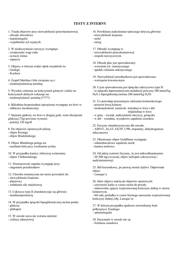 TESTY Z INTERNY 1. Triada objawów przy niewydolności prawokomorowej: - obrzęki obwodowe - hepatomegalia - wypełnienie żył szyjnych 16. Powikłania nadciśnienia tętniczego dotyczą głównie: - niewydolność krążenia - nerki - mózg 2. W niedoczynności tarczycy występuje: - zwiększenie wagi ciała - uczucie zimna - zaparcia 17. Obrzęki występują w: - niewydolności prawokomorowej - zespole nerczycowym 3. Objawy w którym widać rąbek twardówki to: - Grafego - Kochera 4. Zespół Marfana i kiła związane są z: - niedomykalnością aortalną 5. Wysokie ciśnienie na kończynach górnych i niskie na kończynach dolnych wskazuje na: - niedomykalność aortalną (?????) 6. Bilirubina bezpośrednia (sprzężona) występuje we krwi w: - żółtaczce mechanicznej 7. Stężenie glukozy we krwi w drugiej godz. testu obciążenia glukozą (75g) powinno wynosić: - poniżej 120 mg/dl 8. Do objawów oponowych należą: - objaw Kerniga - objaw Brudzińskiego 9. Objaw Blumberga polega na: - nasilaniu bólu przy zwalnianiu ucisku 10. W przypadku kamicy żółciowej wykonamy: - objaw Chełmońskiego 11. Niemiarowość zupełna występuje przy: - migotaniu przedsionków 12. Choroba reumatyczna nie może prowadzić do: - niewydolności krążenia - pląsawicy - osłabienia siły mięśniowej 13. Cukrzyca typu II charakteryzuje się głównie: - insulinoopornością 14. W przypadku śpiączki hipoglikemicznej można podać: - glukozę - glukagon 15. W zawale serca nie wzrasta stężenie: - cyklazy adenylowej 18. Obrzęk płuc jest spowodowany: - wzrostem ciś. osmotycznego - spadek ciśnienia onkotycznego 19. Niewydolność przednerkowa jest spowodowana: - wstrząsem krwotocznym 20. Czym spowodowana jest śpiączka cukrzycowa typu II: - to śpiączka hiperosmotyczna molalność powyżej 380 mmol/kg H2O z hiperglikemią (norma 280 mmol/kg H2O) 21. Co powoduje przesunięcie uderzenia koniuszkowego: - przerost lewej komory - niedomykalność zastawek: mitralnej-w lewo i dół trójdzielnej-w lewo - w górę – wysięk, nadczynność tarczycy, gorączka - w dół – rozedma, wysiękowe zapalenie osierdzia 22. Enzymy charakterystyczne dla zawału: - ASPAT, ALAT, GGTP, CPR, troponiny, dehydrogenaza mleczanowa 23. Obustronny objaw Goldflama występuje: - odmiedniczkowe zapalenie nerek - kamica nerkowa 24. Od jakiej wartości liczymy, że jest mikroalbuminemia: - 20-300 mg (wczesny objaw nefropati cukrzycowej i nadciśnieniowej) 25. Ból korzonkowy, po prawej stronie lędźwi. Odpowiada objaw: - Laseque’a 26. Jakie objawy należą do objawów oponowych: - sztywność karku w czasie ruchu do przodu - mimowolne zgięcie wyprostowanej kończyny dolnej w stawie kolanowym - ból uda, pośladka w czasie biernego unoszenia wyprostowanej kończyny dolnej (obj, Laseque’a) 27. W którym przypadku opukowo stwierdzamy brak półksiężyca Traubego: - splenomegalia 28. Enzymami w zawale nie są: - fosfataza zasadowa 29.Wzrost obwodu brzucha, kiedy pępek nie wystaje na zewnątrz występuje przy: - otyłości 48. Objawy wyrostka robaczkowego: - objaw Jaworskiego - objaw Rovsinga, blumberga 30. Zmniejszenie drżenia piersiowego: - zapalenia oskrzeli - płyn w opłucnej 49. Zespół nerczycowy: - obrzęki spowodowane hipoalbinemią, hipoproteinemia 31. Obrzęki nie występuja w : - nadciśnieniu (??) 32. Powikłania marskości wątroby: - encephalopatia wątrobowa 33. Powikłania nadciśnienia tętniczego dotyczą: - nerki - mózg - niewydolność krążenia 34. Nadciśnienie jest od: - 140/80 35. Jakie są charakterystyczne objawy przy nadczynności tarczycy: - Grafego i Moebiusa 36. Ostra niewydolność PK jest spowodowana: - zator t. płucnej 37. Róznica miedzy wysokim ciś. rozkurczowym a niskim skurczowym: - stenoza mitralna 38. Do nabytych wad serca należą: - stenoza mitralna - otwór w przegrodzie międzyprzedsionkowej 39. Nadciśnienie wtórne nie pojawia się w: - Ch. Addisona 40. Ból w dusznicy bolesnej: - nie promieniuje do lewej ręki - ma charakter kłujący 41. Nadciśnienie wtórne pojawia się w: - zespół Conna 42. odgłos stłumiony opukowy (płuca) występuje w: - płyn w j. opłucnowej 43. odgłos stłumiony bębenkowy występuje w: - rozedma 44. Duży niebolesny twór w rzucie pęcherzyka żółciowego. Żółtaczka występuje w: - objaw Cavoursien (???) 45. Ch. wrzodowa dwunastnicy (bóle): 46. W zaburzeniach móżdżku nie występuje: - objaw szczytowy 47. Objawy w kamicy żółciowej: - napad bólu w prawym podrzebrzu, tzw kolka żółciowa. Występują wymioty, rozwija się żółtaczka mechaniczna. 50. Choroba wieńcowa – cechy charakterystyczne - ból za mostkiem promieniujący do barku, gardłą, szczęki, pod łopatkę (czasem tylko ból „wypromieniowany”) 51. Ból zamostkowy najsilniejszy jest przy: - zawał serca - zawał płuc - dusznica bolesna - zator tętnicy płucnej 52. Deficyt tętna (nitkowate na obwodzie) - brat na t. promieniowej - poniżej 60 uderzeń/minutę
