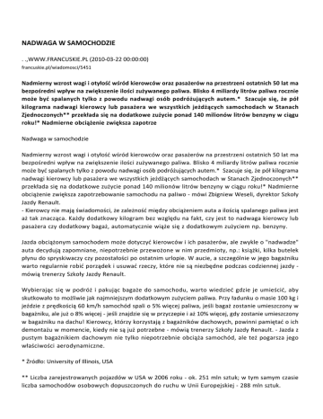 NADWAGA W SAMOCHODZIE . .,WWW.FRANCUSKIE.PL (2010-03-22 00:00:00) francuskie.pl/wiadomosci/5451 Nadmierny wzrost wagi i otyłość wśród kierowców oraz pasażerów na przestrzeni ostatnich 50 lat ma bezpośredni wpływ na zwiększenie ilości zużywanego paliwa. Blisko 4 miliardy litrów paliwa rocznie może być spalanych tylko z powodu nadwagi osób podróżujących autem.* Szacuje się, że pół kilograma nadwagi kierowcy lub pasażera we wszystkich jeżdżących samochodach w Stanach Zjednoczonych** przekłada się na dodatkowe zużycie ponad 140 milionów litrów benzyny w ciągu roku!* Nadmierne obciążenie zwiększa zapotrze Nadwaga w samochodzie Nadmierny wzrost wagi i otyłość wśród kierowców oraz pasażerów na przestrzeni ostatnich 50 lat ma bezpośredni wpływ na zwiększenie ilości zużywanego paliwa. Blisko 4 miliardy litrów paliwa rocznie może być spalanych tylko z powodu nadwagi osób podróżujących autem.* Szacuje się, że pół kilograma nadwagi kierowcy lub pasażera we wszystkich jeżdżących samochodach w Stanach Zjednoczonych** przekłada się na dodatkowe zużycie ponad 140 milionów litrów benzyny w ciągu roku!* Nadmierne obciążenie zwiększa zapotrzebowanie samochodu na paliwo - mówi Zbigniew Weseli, dyrektor Szkoły Jazdy Renault. - Kierowcy nie mają świadomości, że zależność między obciążeniem auta a ilością spalanego paliwa jest aż tak znacząca. Każdy dodatkowy kilogram bez względu na fakt, czy jest to nadwaga kierowcy lub pasażera czy dodatkowy bagaż, automatycznie wiąże się z dodatkowym zużyciem np. benzyny. Jazda obciążonym samochodem może dotyczyć kierowców i ich pasażerów, ale zwykle o "nadwadze" auta decydują zapomniane, niepotrzebnie przewożone w nim przedmioty, np.: książki, kilka butelek płynu do spryskiwaczy czy pozostałości po ostatnim urlopie. W aucie, a szczególnie w jego bagażniku warto regularnie robić porządek i usuwać rzeczy, które nie są niezbędne podczas codziennej jazdy mówią trenerzy Szkoły Jazdy Renault. Wybierając się w podróż i pakując bagaże do samochodu, warto wiedzieć gdzie je umieścić, aby skutkowało to możliwie jak najmniejszym dodatkowym zużyciem paliwa. Przy ładunku o masie 100 kg i jeździe z prędkością 60 km/h samochód spali o 5% więcej paliwa, jeśli bagaż zostanie umieszczony w bagażniku, ale już o 8% więcej - jeśli znajdzie się w przyczepie i aż 10% więcej, gdy zostanie umieszczony w bagażniku na dachu! Kierowcy, którzy korzystają z bagażników dachowych, powinni pamiętać o ich demontażu w momencie, kiedy nie są już potrzebne - mówią trenerzy Szkoły Jazdy Renault. - Jazda z pustym bagażnikiem dachowym nie tylko niepotrzebnie obciąża samochód, ale też pogarsza jego właściwości aerodynamiczne. * Żródło: University of Illinois, USA ** Liczba zarejestrowanych pojazdów w USA w 2006 roku - ok. 251 mln sztuk; w tym samym czasie liczba samochodów osobowych dopuszczonych do ruchu w Unii Europejskiej - 288 mln sztuk. Szkoła Jazdy Renault to pierwsza markowa szkoła doskonalenia techniki jazdy Renault na świecie. Szkoła działa na terenie lotniska Warszawa-Bemowo. W ofercie szkoły znajdują się kursy dla klientów indywidualnych i flotowych, program dla kierowców samochodów dostawczych, defensive driving, czyli ćwiczenie techniki jazdy po mieście, kompletne audyty flot samochodowych, kurs eko-jazdy, wykłady z psychologii i bezpieczeństwa ruchu drogowego oraz szkolenia z zakresu pierwszej pomocy. Szkoła dysponuje 50.000 m2 powierzchni do ćwiczeń, w tym płytą poślizgową o długości 120 m oraz kręgiem poślizgowym o średnicy 60 m, a także płytami betonowymi do jazdy na trolejach i torem do jazdy terenowej. Szkoła Jazdy Renault jest członkiem Partnerstwa dla Bezpieczeństwa Drogowego i Polskiego Stowarzyszenia Motorowego. Szczegóły: www.szkolajazdyrenault.com.pl Źródło: Renault Polska