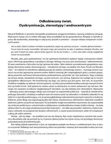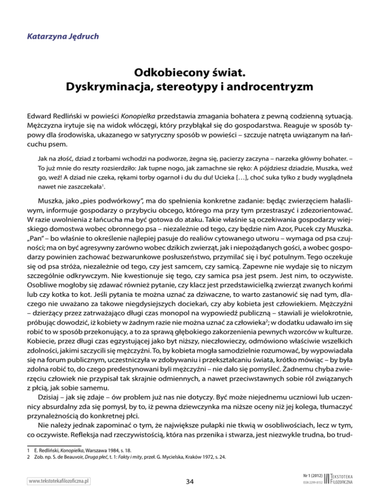Katarzyna Jędruch Odkobiecony świat. Dyskryminacja, stereotypy i androcentryzm Edward Redliński w powieści Konopielka przedstawia zmagania bohatera z pewną codzienną sytuacją. Mężczyzna irytuje się na widok włóczęgi, który przybłąkał się do gospodarstwa. Reaguje w sposób typowy dla środowiska, ukazanego w satyryczny sposób w powieści – szczuje natręta uwiązanym na łańcuchu psem. Jak na złość, dziad z torbami wchodzi na podworze, żegna się, pacierzy zaczyna – narzeka główny bohater. – To już mnie do reszty rozsierdziło: Jak tupne nogo, jak zamachne sie ręko: A pójdziesz dziadzie, Muszka, weź go, weź! A dziad nie czeka, rękami torby ogarnoł i du du du! Ucieka […], choć suka tylko z budy wyglądneła nawet nie zaszczekała1. Muszka, jako „pies podwórkowy”, ma do spełnienia konkretne zadanie: będąc zwierzęciem hałaśliwym, informuje gospodarzy o przybyciu obcego, którego ma przy tym przestraszyć i zdezorientować. W razie uwolnienia z łańcucha ma być gotowa do ataku. Takie właśnie są oczekiwania gospodarzy wiejskiego domostwa wobec obronnego psa – niezależnie od tego, czy będzie nim Azor, Pucek czy Muszka. „Pan” – bo właśnie to określenie najlepiej pasuje do realiów cytowanego utworu – wymaga od psa czujności; ma on być agresywny zarówno wobec dzikich zwierząt, jak i niepożądanych gości, a wobec gospodarzy powinien zachować bezwarunkowe posłuszeństwo, przymilać się i być potulnym. Tego oczekuje się od psa stróża, niezależnie od tego, czy jest samcem, czy samicą. Zapewne nie wydaje się to niczym szczególnie odkrywczym. Nie kwestionuje się tego, czy samica psa jest psem. Jest nim, to oczywiste. Osobliwe mogłoby się zdawać również pytanie, czy klacz jest przedstawicielką zwierząt zwanych końmi lub czy kotka to kot. Jeśli pytania te można uznać za dziwaczne, to warto zastanowić się nad tym, dlaczego nie uważano za takowe niegdysiejszych dociekań, czy aby kobieta jest człowiekiem. Mężczyźni – dzierżący przez zatrważająco długi czas monopol na wypowiedź publiczną – stawiali je wielokrotnie, próbując dowodzić, iż kobiety w żadnym razie nie można uznać za człowieka2; w dodatku udawało im się robić to w sposób przekonujący, a to za sprawą głębokiego zakorzenienia pewnych wzorców w kulturze. Kobiecie, przez długi czas egzystującej jako byt niższy, nieczłowieczy, odmówiono właściwie wszelkich zdolności, jakimi szczycili się mężczyźni. To, by kobieta mogła samodzielnie rozumować, by wypowiadała się na forum publicznym, uczestniczyła w zdobywaniu i przekształcaniu świata, krótko mówiąc – by była zdolna robić to, do czego predestynowani byli mężczyźni – nie dało się pomyśleć. Żadnemu chyba zwierzęciu człowiek nie przypisał tak skrajnie odmiennych, a nawet przeciwstawnych sobie ról związanych z płcią, jak sobie samemu. Dzisiaj – jak się zdaje – ów problem już nas nie dotyczy. Być może niejednemu uczniowi lub uczennicy absurdalny zda się pomysł, by to, iż pewna dziewczynka ma niższe oceny niż jej kolega, tłumaczyć przynależnością do konkretnej płci. Nie należy jednak zapominać o tym, że największe pułapki nie tkwią w osobliwościach, lecz w tym, co oczywiste. Refleksja nad rzeczywistością, która nas przenika i stwarza, jest niezwykle trudna, bo trud1 E. Redliński, Konopielka, Warszawa 1984, s. 18. 2 Zob. np. S. de Beauvoir, Druga płeć, t. 1: Fakty i mity, przeł. G. Mycielska, Kraków 1972, s. 24. www.tekstotekafilozoficzna.pl 34 Nr 1 (2012) ISSN 2299-8152 Odkobiecony świat. Dyskryminacja, stereotypy i androcentryzm nym przedsięwzięciem jest próba postawienia się o b o k niej. Wyrażanie zdziwienia tym, co na co dzień konstytuuje świat, w którym człowiek się porusza, próby podważania i sprawdzania, czy pewne rzeczy można zrobić inaczej, pytanie „dlaczego”, stawiane, gdy mamy do czynienia ze zwyczajem – to wszystko nierzadko wywołuje postawy nieprzychylne, drwiny, a nawet agresję. Krytyczna refleksja zdaje się posiadać moc unicestwiania rzeczywistości: pewnej, bezpiecznej, bezrefleksyjnie przyjmowanej w postaci zwyczaju, konwenansu czy po prostu tradycji. Często więc prześmiewczo traktowane są refleksje i roszczenia feministek; ponieważ niektóre z poruszanych przez nie problemów należą do kategorii bezrefleksyjnie akceptowanej oczywistości, nie podchodzi się do nich poważnie. Przykładem takiego lekceważenia może być chociażby ostatnio poruszane zagadnienie „żeńskich form” i „żeńskich końcówek” w nazwach zawodów i funkcji. Znamienne jest to, że ci, którzy próbują ośmieszyć ów problem, niekoniecznie muszą być zdeklarowanymi przeciwnikami danej inicjatywy, lecz po prostu opierają się refleksyjności, do której zachęcają feministki. W swoim artykule chciałabym poruszyć m.in. kwestię dyskryminacji kobiet w języku i ogólnie – w sposobie ujmowania rzeczywistości; przedstawię przy tym pewne stereotypowe przekonania dotyczące kobiet. Odwołam się do poświęconej temu zagadnieniu literatury przedmiotu, punkt wyjścia mojej analizy stanowić będą fragmenty tekstów literackich, filmów oraz wypowiedzi zamieszczone w Internecie. Wymienione źródła posłużą mi za przykłady bezrefleksyjnego powielania oraz utrwalania określonych postaw i przekonań. Często, gdy stykamy się z dziełem literackim, muzycznym lub plastycznym, podpisanym inicjałem albo imieniem, które nic nam nie mówi o płci twórcy, automatycznie przypisujemy autorowi płeć męską. I raczej nie mylimy się w przypadku dzieła powstałego przed wiekami. Właśnie w tym tkwi, według mnie, trudny do przezwyciężenia problem. Faktem jest jednak i to, że często automatyczne wyobrażenie męskiej sylwetki autora narzuca się także w przypadku dzieł współczesnych. Czyżby i dzisiaj mężczyźni i kobiety uważali, że to właśnie przede 
