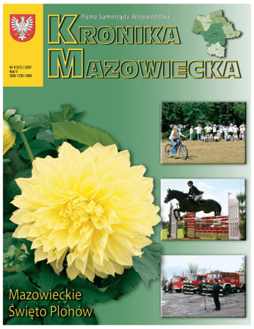 W NUMERZE: KRONIKA MAZOWIECKA Z prac samorządu XII sesja Sejmiku Województwa Mazowieckiego . . . . . . . . . . . . . . . 2 W komisjach . . . . . . . . . . . . . . . . . . . . . . . . . . . . . . . . . . . . . . 5 Posiedzenia Zarządu Województwa Mazowieckiego . . . . . . . . . . . 11 Temat miesiąca Mazowieckie święto plonów . . . . . . . . . . . . . . . . . . . . . . . . . . . . 12 Warto wiedzieć Grupą Mości Panowie, czyli rzecz o rolniczych grupach producenckich . . . . . . . . . . . . . . . 14 Puszcza za rogatkami Warszawy . . . . . . . . . . . . . . . . . . . . . . . . . 18 Imprezy kulturalne na Mazowszu . . . . . . . . . . . . . . . . . . . . . . . . 21 Miesiąc na Mazowszu „Kroplówka” finansowa dla szpitali . . . . . . . . . . . Nowoczesny tabor kolejowy . . . . . . . . . . . . . . . . Na Mazowszu będzie bezpieczniej . . . . . . . . . . . . Bezpieczniej do szkoły . . . . . . . . . . . . . . . . . . . Podsumowanie Pogodnego Lata . . . . . . . . . . . . . Projekt „OMNI-NET” . . . . . . . . . . . . . . . . . . . . . Bezpieczny gimbus . . . . . . . . . . . . . . . . . . . . . . Pamięć i pojednanie . . . . . . . . . . . . . . . . . . . . . Moją miłością jest Natura . . . . . . . . . . . . . . . . . . „Mazowsze Bliskie Sercu” – II edycja . . . . . . . . . . . Kolej przyszłością Mazowsza . . . . . . . . . . . . . . . Koncertowy Węgrów . . . . . . . . . . . . . . . . . . . . . II Festiwal Produktów Regionalnych i Ekologicznych Międzynarodowe Dni z Doradztwem Rolniczym . . . Zielony Korczew . . . . . . . . . . . . . . . . . . . . . . . . „O pierścień księżnej Anny” . . . . . . . . . . . . . . . . Nadbużańskie Serpelice . . . . . . . . . . . . . . . . . . „Viva Rossini !!!” . . . . . . . . . . . . . . . . . . . . . . . . Za niebieską Ukrainą – żal . . . . . . . . . . . . . . . . . Łąck – weekendowa stolica hippiki . . . . . . . . . . . Fala pomocy dla Jeziora Zdworskiego wciąż płynie . Zaproszenie w kolorze bieli i brązu . . . . . . . . . . . Z wizytą w piastowskim grodzie . . . . . . . . . . . . . Popłynęli z wiatrem . . . . . . . . . . . . . . . . . . . . . Spływ kajakowy samorządowców . . . . . . . . . . . . Poezja emocjami pisana . . . . . . . . . . . . . . . . . . Rok Wyspiańskiego. . . . . . . . . . . . . . . . . . . . . . Szansa na lepszą przyszłość . . . . . . . . . . . . . . . . Okno na świat . . . . . . . . . . . . . . . . . . . . . . . . . Reaktywacja połączenia . . . . . . . . . . . . . . . . . . Strategiczne porozumienie . . . . . . . . . . . . . . . . Turniej rycerski w rocznicę lokacji miasta . . . . . . . Radomskie Święto Chleba . . . . . . . . . . . . . . . . . Festiwal z Myszką . . . . . . . . . . . . . . . . . . . . . . . Muzyka klasyczna w Solcu . . . . . . . . . . . . . . . . . Święto Żelaza i Stali . . . . . . . . . . . . . . . . . . . . . Za zasługi dla kultury ludowej . . . . . . . . . . . . . . Jubileuszowe spotkanie kapel podwórkowych . . . . „Na Pielgrzymim Szlaku” . . . . . . . . . . . . . . . . . . Życie wycięte z papieru . . . . . . . . . . . . . . . . . . . Pusca mniodem płynąca . . . . . . . . . . . . . . . . . . Bitwa pod Ostrołęką . . . . . . . . . . . . . . . . . . . . . Z perspektywy siodła . . . . . . . . . . . . . . . . . . . . W Hołdzie Powstańcom Warszawskim. . . . . . . . . . Powrócili Szwoleżerowie Gwardii. . . . . . . . . . . . . Spotkania ze średniowieczem w Ciechanowie . . . . Plener w Ciechanowie . . . . . . . . . . . . . . . . . . . . W skrócie . . . . . . . . . . . . . . . . . . . . . . . . . . . . . . . . . . . . . . . . . . . . . . . . . . . . . . . . . . . . . . . . . . . . . . . . . . . . . . . . . . . . . . . . . . . . . . . . . . . . . . . . . . . . . . . . . . . . . . . . . . . . . . . . . . . . . . . . . . . . . . . . . . . . . . . . . . . . . . . . . . . . . . . . . . . . . . . . . . . . . . . . . . . . . . . . . . . . . . . . . . . . . . . . . . . . . . . . . . . . . . . . . . . . . . . . . . . . . . . . . . . . . . . . . . . . . . . . . . . . . . . . . . . . . . . . . . . . . . . . . . . . . . . . . . . . . . . . . . . . . . . . . . . . . . . . . . . . . . . . . . . . . . . . . . . . . . . . . . . . . . . . . . . . . . . . . . . . . . . . . . . . . . . . . . . . . . . . . . . . . . . . . . . . . . . . . . . . . . . . . . . . . . . . . . . . . . . . . . . . . . . . . . . . . . . . . . . . . . . . . . . . . . . . . . . . . . . . . . . . . . . . . . . . . . . . . . . . . . . . . . . . . . . . . . . . . . . . . . . . . . . . . . . . . . . . . . . . . . . . . . . . . . . . . . . . . . . . . . . . . . . . . . . . . . . . . . . . . 25 . 26 . 27 . 28 . 29 . 30 . 31 . 32 . 32 . 33 . 34 . 35 . 36 . 37 . 38 . 38 . 40 . 41 . 42 . 42 . 43 . 44 . 45 . 46 . 46 . 47 . 47 . 48 . 48 . 49 . 49 . 50 . 52 . 53 . 54 . 55 . 55 . 56 . 56 . 57 . 58 . 59 . 61 . 61 . 62 . 63 . 64 65 Foto na okładce: Podsumowanie Pogodnego Lata, Łąck – weekendowa stolica hippiki, Na Mazowszu będzie bezpieczniej Redaguje Zespół w składzie: Redaktor Naczelna Magdalena Lewandowska Zastępca Redaktor Naczelnej Elżbieta Tomaszewska Agnieszka Bogucka Elwira Kasprzak Justyna Michniewicz Zdjęcia: Maria Amamowicz-Lipiec, Archiwum Redakcji „Przegląd Hodowlany”, Adam Bakuła, Barbara Chrzanowska, Joanna Czechowicz, Anna Groszyk, Monika Guzowska, Ewa Janoszka, Teresa Kaczorowska, Mariusz Karpiński, B. Kendzierska, Jan Kutyło, Magdalena Lewandowska, Mariusz Mierzejewski, Katarzyna Mróz, Ireneusz Nieczajew, Michał Rząca, Ewa Szczepanowska, Marek Ślufarski, Barbara Tokarska, Elżbieta Tomaszewska, Wiesław Wismont, Jerzy Zawadzki Mapę wykonał: Wojewódzki Inspektorat Ochrony Środowiska o. Ciechanów ul. Strażacka 6, 06-400 Ciechanów tel. (23) 672 59 59 Opracowanie graficzne Robert Stachowicz Skład komputerowy: Robert Mączyński, QLCO. Agencja Reklamowo-Wydawnicza, Tel. 699 71 21 Wydawca: Urząd Marszałkowski Województwa Mazowieckiego 03-472 Warszawa, ul. B.