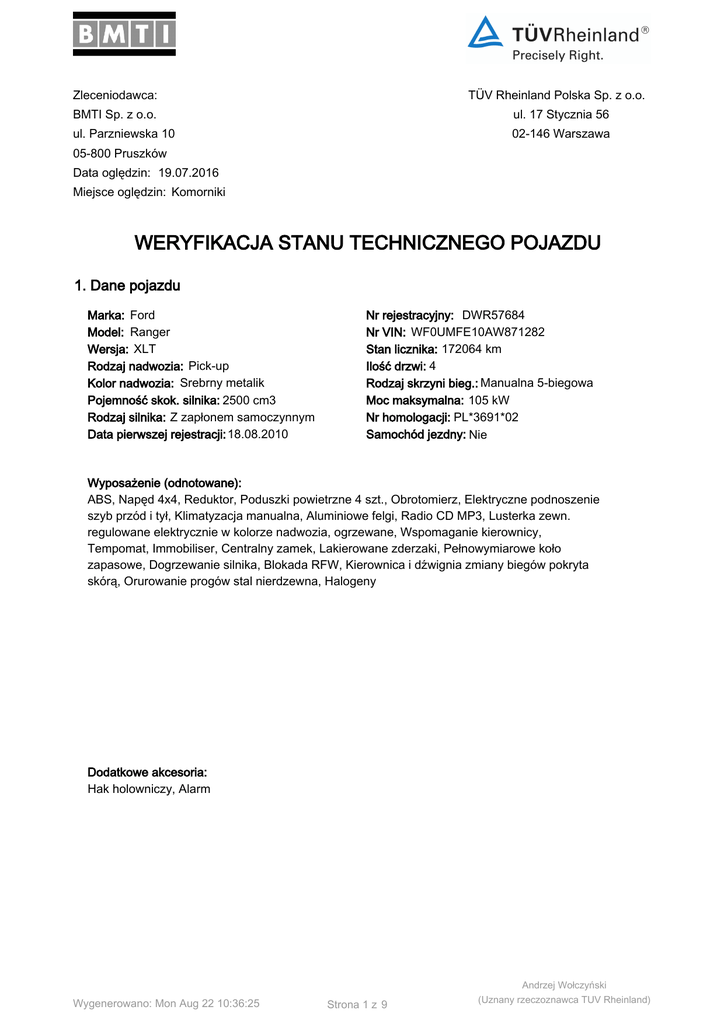 Zleceniodawca: TÜV Rheinland Polska Sp. z o.o. BMTI Sp. z o.o. ul. 17 Stycznia 56 ul. Parzniewska 10 02-146 Warszawa 05-800 Pruszków Data oględzin: 19.07.2016 Miejsce oględzin: Komorniki WERYFIKACJA STANU TECHNICZNEGO POJAZDU 1. Dane pojazdu Marka: Ford Model: Ranger Wersja: XLT Rodzaj nadwozia: Pick-up Kolor nadwozia: Srebrny metalik Pojemność skok. silnika: 2500 cm3 Rodzaj silnika: Z zapłonem samoczynnym Data pierwszej rejestracji: 18.08.2010 Nr rejestracyjny: DWR57684 Nr VIN: WF0UMFE10AW871282 Stan licznika: 172064 km Ilość drzwi: 4 Rodzaj skrzyni bieg.: Manualna 5-biegowa Moc maksymalna: 105 kW Nr homologacji: PL*3691*02 Samochód jezdny: Nie Wyposażenie (odnotowane): ABS, Napęd 4x4, Reduktor, Poduszki powietrzne 4 szt., Obrotomierz, Elektryczne podnoszenie szyb przód i tył, Klimatyzacja manualna, Aluminiowe felgi, Radio CD MP3, Lusterka zewn. regulowane elektrycznie w kolorze nadwozia, ogrzewane, Wspomaganie kierownicy, Tempomat, Immobiliser, Centralny zamek, Lakierowane zderzaki, Pełnowymiarowe koło zapasowe, Dogrzewanie silnika, Blokada RFW, Kierownica i dźwignia zmiany biegów pokryta skórą, Orurowanie progów stal nierdzewna, Halogeny Dodatkowe akcesoria: Hak holowniczy, Alarm Wygenerowano: Mon Aug 22 10:36:25 Strona 1 z 9 Andrzej Wołczyński (Uznany rzeczoznawca TUV Rheinland) 2. Stan pojazdu 2.1 Układ jezdny. Stan ogumienia: Opona lewa przednia: Producent, model: Barum Bravuris 4x4 Rodzaj: Letnia Wysokość bieżnika: 6 mm Opona prawa przednia: Producent, model: Barum Bravuris 4x4 Rodzaj: Letnia Wysokość bieżnika: 6 mm Opona lewa tylna: Producent, model: Barum Bravuris 4x4 Rodzaj: Letnia Wysokość bieżnika: 7 mm Opona prawa tylna: Producent, model: Barum Bravuris 4x4 Rodzaj: Letnia Wysokość bieżnika: 7 mm Stan obręczy kół/kołpaków: Brak uszkodzeń Zaobserwowany stan tarcz/klocków hamulcowych: Tarcze hamulcowe kół przednich brak możliwości weryfikacji, Klocki hamulcowe przód brak możliwości weryfikacji, Oś tylna brak możliwości weryfikacji Niepokojące odgłosy/objawy stwierdzone w trakcie jazdy próbnej: Brak możliwości wykonania jazdy próbnej, zdemontowana skrzynia biegów (C) TÜV, TUEV, TUV, are registred trademarks. Utilisation and application requires prior approval. Uwagi inne: Skrzynia biegów ze sprzęgłem złożona luzem w części ładunkowej Wygenerowano: Mon Aug 22 10:36:25 Strona 2 z 9 Andrzej Wołczyński (Uznany rzeczoznawca TUV Rheinland) 2.2 Nadwozie pojazdu. Pomiar lakieru wykonany miernikiem: 100-109 120-140 75-85 Salutron Combi D3 110-115 130-140 245-255 110-130 75-85 78-82 200-550 320-340 (C) TÜV, TUEV, TUV, are registred trademarks. Utilisation and application requires prior approval. Uszkodzenia nadwozia: Błotnik PL wgniecenia, Listwa nadkola PL rysy trwałe, Obudowa lusterka zewn. L brak, Próg L rysy trwałe, korozja, Drzwi TL rysy wierzchnie, Słupek "C" L rysy wierzchnie, Błotnik TL rysy wierzchnie i trwałe, Podłoga skrzyni ładunkowej rysy trwałe, korozja, Drzwi TP odpryski, rysy trwałe, wgniecenie, Drzwi PP odprysk, korozja. Lusterko zewn P pęknięcie, Przedłużenie zderzaka PP zdeformowane, rysy trwałe, Reflektor PL matowy klosz, Reflektor PP matowy klosz, trwałe odkształcenie termiczne, Pokrywa przód odpryski, korozja, Zderzak przód pęknięcia, rysy trwałe, Dach rysy trwałe, korozja, zanieczyszczenia betonem Szyby pojazdu: Szyba czołowa nieoryginalna Uwagi inne: Brak Wygenerowano: Mon Aug 22 10:36:25 Strona 3 z 9 Andrzej Wołczyński (Uznany rzeczoznawca TUV Rheinland) 2.3 Wnętrze pojazdu. Stan tapicerki foteli oraz tapicerek drzwiowych: Tapicerka foteli przednich i kanapy tylnej zabrudzona, zaplamiona, Tapicerki drzwiowe zabrudzone, zaplamione Stan podsufitki, deski rozdzielczej, oraz wykończeń przedziału bagażowego: Podsufitka zabrudzona, Wykładzina podłogi części tylnej kabiny zabrudzona, zaplamiona Tablica rozdzielcza - świecące kontrolki: Brak możliwości weryfikacji Uwagi inne: Zgięte, odkształcone gniazdo mocowania ramienia podnośnika samochodowego 2.4 Układ napędowy. Wycieki w układzie napędowym: Brak możliwości weryfikacji Nieprawidłowości w pracy układu napędowego: Brak możliwości weryfikacji Stan układu wydechowego: Zdemontowany (C) TÜV, TUEV, TUV, are registred trademarks. Utilisation and application requires prior approval. 2.5 Kompletność pojazdu. Do samochodu dołączono: - Klucze (szt): 2 - Dowód rejestracyjny: TAK - Instrukcję obsługi: TAK - Książkę serwisową - data ostatniego wpisu: Brak - Koło zapasowe - wysokość bieżnika: 7 mm - Kompletny zestaw narzędzi: NIE - Sprawny podnośnik: NIE - Ważna gaśnicę - data ważności: 03.2017 Drugi komplet kół/opon: Rodzaj opon: Brak Rodzaj felg: Ilość, marka, model i rozmiar opon: Wygenerowano: Mon Aug 22 10:36:25 Strona 4 z 9 Andrzej Wołczyński (Uznany rzeczoznawca TUV Rheinland) 3. Dodatkowe uwagi. Rzeczoznawca przeprowadzający weryfikację oraz TÜV Rheinland Polska sp. z o.o. nie biorą odpowiedzialności za wady ukryte pojazdu oraz wady których nie dotyczyła powyższa weryfikacja. Powyższa weryfikacja stanu pojazdu została sporządzona organoleptycznie, oraz za pomocą wymienionych w formularzu urządzeń. Weryfikacja nie ma charakteru diagnostyki uszkodzeń pojazdu. Dodatkowe uwagi: Udostępniający pojazd do oględzin przedstawił kosztorys zewnętrzny na wymianę sprzęgła, koła dwumasowego oraz regenerację skrzyni biegów i reduktora na łączną kwotę XXX zł netto (C) TÜV, TUEV, TUV, are registred trademarks. Utilisation and application requires prior approval. 4. Zdjęcia pojazdu. Wygenerowano: Mon Aug 22 10:36:27 Strona 5 z 9 Andrzej Wołczyński (Uznany rzeczoznawca TUV Rheinland) (C) TÜV, TUEV, TUV, are registred trademarks. Utilisation and application requires prior approval. Wygenerowano: Mon Aug 22 10:36:30 Strona 6 z 9 Andrzej Wołczyński (Uznany rzeczoznawca TUV Rheinland) (C) TÜV, TUEV, TUV, are registred trademarks. Utilisation and applicati