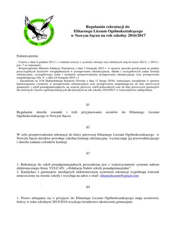 Regulamin rekrutacji do Elitarnego Liceum Ogólnokształcącego w Nowym Sączu na rok szkolny 2016/2017 Podstawa prawna: - Ustawa z dnia 6 grudnia 2013 r. o zmianie ustawy o systemie oświaty oraz niektórych innych ustaw (Dz.U. z 2014 r. poz. 7 ze zmianami) - Rozporządzenie Ministra Edukacji Narodowej z dnia 2 listopada 2015 r. w sprawie sposobu przeliczania na punkty poszczególnych kryteriów uwzględnianych w postępowaniu rekrutacyjnym, składu i szczegółowych zadań komisji rekrutacyjnej, szczegółowego trybu i terminów przeprowadzania postępowania rekrutacyjnego oraz postępowania uzupełniającego (Dz. U. z dnia 24 listopada 2015 r.). - Zarządzenie nr 2/16 Małopolskiego Kuratora Oświaty z dnia 11 lutego 2016r. zmieniające zarządzenie w sprawie harmonogramu czynności w postępowaniu rekrutacyjnym oraz postępowaniu uzupełniającym do klas pierwszych gimnazjów i szkół ponadgimnazjalnych, na semestr pierwszy szkół policealnych oraz do klas pierwszych gimnazjów dla dorosłych i liceów ogólnokształcących dla dorosłych na rok szkolny 2016/2017 w województwie małopolskim §1 Regulamin określa warunki i tryb Ogólnokształcącego w Nowym Sączu. przyjmowania uczniów do Elitarnego Liceum §2 W celu przeprowadzenia rekrutacji do klasy pierwszej Elitarnego Liceum Ogólnokształcącego w Nowym Sączu dyrektor powołuje szkolną komisję rekrutacyjną wyznaczając jej przewodniczącego i określa zadania członków komisji. §3 1. Rekrutacja do szkół ponadgimnazjalnych prowadzona jest z wykorzystaniem systemu naboru elektronicznego firmy VULCAN: „vEdukacja Nabór szkoły ponadgimnazjalne”. 2. Kandydaci z gimnazjów nieobjętych elektronicznym systemem rekrutacji wypełniają wniosek umieszczony na stronie szkoły i wysyłają na adres e-mail: [email protected] . §4 1. Prawo ubiegania się o przyjęcie do Elitarnego Liceum Ogólnokształcącego mają uczniowie, którzy w roku szkolnym 2015/2016 uzyskają świadectwo ukończenia gimnazjum. 2. Rekrutacja na rok szkolny 2016/2017 jest przeprowadzana do klas pierwszych: - IA Securitologia (przedmioty realizowane w zakresie rozszerzonym: język polski, język angielski, historia) • na punkty przeliczane są: język polski, język angielski, historia, wos - IB Technologie multimedialne (przedmioty realizowane w zakresie rozszerzonym: informatyka, matematyka, geografia) • na punkty przeliczane są: język polski, język angielski, geografia, matematyka - IC Lekarski (przedmioty realizowane w zakresie rozszerzonym: biologia, chemia, język angielski) • na punkty przeliczane są: język polski, język angielski, biologia, chemia - ID Klasyczna (przedmioty realizowane w zakresie rozszerzonym: język polski, wos, historia) • na punkty przeliczane są: język polski, język angielski, historia, wos - IE Prawo (przedmioty realizowane w zakresie rozszerzonym: język polski, język angielski, historia) • na punkty przeliczane są: język polski, język angielski, historia, wos - IF Architektura (przedmioty realizowane w zakresie rozszerzonym: matematyka, informatyka, geografia) • na punkty przeliczane są: język polski, język angielski, matematyka, geografia - IG Językowo – turystyczno – psychologiczna (przedmioty realizowane w zakresie rozszerzonym: język angielski, język hiszpański, geografia) • na punkty przeliczane są: język polski, język angielski, geografia, biologia - IH Futbol (przedmioty realizowane w zakresie rozszerzonym: geografia, biologia, język angielski) • na punkty przeliczane są: język polski, język angielski, geografia, biologia - IJ Obrona terytorialna (przedmioty realizowane w zakresie rozszerzonym: język polski, wos) • na punkty przeliczane są: język polski, język angielski, wos, historia - IK Penitencjarystyka (przedmioty realizowane w zakresie rozszerzonym: geografia, biologia) • na punkty przeliczane są: język polski, język angielski, geografia, biologia Każdy oddział liczy maksymalnie 24 uczniów. §5 1. O przyjęciu do szkoły decydują kryteria uwzględniające: 1) liczbę punktów możliwych do uzyskania za wyniki egzaminu gimnazjalnego, zawarte w zaświadczeniu o szczegółowych wynikach egzaminu – maksymalnie 100 punktów, 2) liczbę punktów możliwych do uzyskania za oceny z języka polskiego i trzech wybranych obowiązkowych zajęć edukacyjnych – maksymalnie 80 punktów, 3) szczególne osiągnięcia ucznia wymienione na świadectwie ukończenia gimnazjum, co najwyżej 13 punktów, 2. Warunkiem, uprawniającym do podlegania procedurze rekrutacyjnej do klasy pierwszej jest zgromadzenie co najmniej 100 pkt. * W przypadku rekrutacji uzupełniającej próg punktowy może zostać obniżony. 3. Wyniki egzaminu gimnazjalnego wyrażone w skali procentowej przelicza się na punkty według zasady, że z każdego zakresu można uzyskać maksymalnie 20 punktów licząc że jeden procent w każdym z zakresów odpowiada 0,2 punktu. 4. Przyjmuje się następujący sposób przeliczania na punkty ocen z języka polskiego i trzech wybranych obowiązkowych zajęć edukacyjnych: 1) celujący - 20 pkt. 2) bardzo dobry - 16 pkt. 3) dobry - 12 pkt. 4) dostateczny - 8 pkt. 5) dopuszczający -2 pkt. 5. Za ukończenie gimnazjum z wyróżnieniem – 5 punktów. 6. Za szczególne osiągnięcia wpisane na świadectwie kandydat może uzyskać maksymalnie 13 pkt. – tzn. z przeliczania na punkty szczególnych osiągnięć (art.20f ust.2 pkt.4 lit.a, art.20h ust.6 pkt.5 lit.a, art.20 i ust.2 pkt.4 lit.a i art.20j ust.2 pkt.5 lit.a ustawy) w zawodach wiedzy, artystycznych i sportowych (rozp. MEN z 2 listopada 2015r. § 7.1 - 7.2); 7. Z przeliczania na punkty kryterium za osiągnięcia w zakresie aktywności społecznej, w tym na rzecz środowiska szkolnego, w szczególności w formie wolontariatu (art.20f ust.2 pkt.4 lit.b, art.20h ust.6 pkt.5 lit.b, art.20i ust.2 pkt.4 lit.b i art.20j ust.2 pkt.5 lit.b ustawy) - 2 punkty. 8. Kandydatom do szkół ponadgimnazjalnych zwolni
