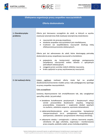 Efektywna organizacja pracy zespołów nauczycielskich Oferta doskonalenia 1. Charakterystyka problemu Oferta jest kierowana szczególnie do szkół, w których w wyniku ewaluacji wewnętrznej i/lub ewaluacji zewnętrznej stwierdzono: nauczyciele nie pracują zespołowo, działanie zespołów nauczycielskich jest nieefektywne, trudności we współdziałaniu nauczycieli skutkują niską efektywnością procesów edukacyjnych. Oferta jest też adresowana do szkół, które dostrzegają potrzebę doskonalenia pracy zespołowej nauczycieli w kontekście: 2. Cel realizacji oferty pojawienia się konieczności spójnego postępowania (współpracy nauczycieli) wobec dziecka o specjalnych potrzebach edukacyjnych, osiągania przez uczniów niskich efektów nauczania, braku spójności w pracy wychowawczej nauczycieli. Celem ogólnym realizacji oferty może byd na przykład zbudowanie/wzmocnienie modelu pracy rady pedagogicznej opartego na pracy zespołów nauczycielskich. Cele szczegółowe (zostaną doprecyzowane lub zmodyfikowane tak, aby uwzględniad specyfikę szkoły i jej potrzeby): świadome kształtowanie pozytywnych i bezpiecznych relacji wśród pracowników (budowanie zespołu), integracja pracowników, inicjowanie i wspieranie działao opartych na zaufaniu, udzielaniu wsparcia, wymianie doświadczeo, nabieranie/doskonalenie przez pracowników kompetencji interpersonalnych (m.in. umiejętności komunikacyjnych, asertywności, udzielanie i przyjmowanie informacji zwrotnej), nabywanie wiedzy i umiejętności z zakresu tworzenia zespołu, określania ról jego członków, organizacji i monitorowania pracy zespołu, podziału zadao, pracy metodą projektów, System doskonalenia nauczycieli oparty na ogólnodostępnym kompleksowym wspomaganiu szkół Projekt współfinansowany przez Unię Europejską w ramach Europejskiego Funduszu Społecznego przyjęcie organizacji współpracy nauczycieli w zespołach jako modelu działania dla zespołów uczniowskich, wypracowanie zasad powoływania zespołów zadaniowych. 3. Grupy docelowe Nauczyciele oraz dyrektor szkoły. 4. Efekty realizacji oferty Przykładowe efekty realizacji oferty: 1. Nauczyciele częściej inicjują spotkania zespołów, zgłaszają potrzebę pracy zespołowej (powoływania zespołów) w celu realizowania zadao, rozwiązywania pojawiających się problemów, podejmowania konsultacji, wymiany doświadczeo. 2. Nauczyciele umieją określid swoją rolę w zespole, znają i doceniają znaczenie wszystkich ról w zespole. 3. Zespoły nauczycielskie powoływane są zgodnie z wypracowanymi zasadami. 4. Zespoły nauczycielskie planują, monitorują i dokumentują swoją pracę. 5. Sposób realizacji oferty Realizacja oferty rozpoczyna się od diagnozy potrzeb angażującej wszystkich członków rady pedagogicznej i prowadzącej do sformułowania szczegółowego zakresu działao, wskazania osób odpowiedzialnych za ich wykonanie oraz opracowania rocznego planu wspomagania szkoły (RPW), którego minimalny zakres stanowi załącznik do każdej z ofert. Dopasowane do indywidualnych potrzeb szkoły działania mogą obejmowad w szczególności: 1. Warsztaty dla nauczycieli w zakresie komunikacji interpersonalnej. 2. Warsztaty dla nauczycieli w zakresie budowania zespołów, planowania i organizacji pracy w zespołach. 3. Wspólne opracowanie i realizację programu integrującego nauczycieli (do programu warto włączyd niepedagogicznych pracowników szkoły). 4. Szkolenie i warsztaty radzenia sobie ze stresem oraz konstruktywnego rozwiązywania konfliktów. 5. Racjonalizację istniejącej struktury rady pedagogicznej i pomoc w określeniu zadao dla każdego zespołu, a następnie w planowaniu działao i monitorowaniu realizacji. 6. Wspólne wypracowanie zasad powoływania zespołów oraz przydziału zadao. 7. Superwizję – ocena skuteczności wdrożonych rozwiązao. 8. Konsultacje. System doskonalenia nauczycieli oparty na ogólnodostępnym kompleksowym wspomaganiu szkół Projekt współfinansowany przez Unię Europejską w ramach Europejskiego Funduszu Społecznego Dyrektor: 6. Zasady korzystania z oferty Nadzoruje wszystkie działania. Udostępnia pomieszczenia i sprzęt do realizacji szkoleo, warsztatów, konsultacji dla nauczycieli. Motywuje pracowników do systematycznego i aktywnego udziału w szkoleniach, warsztatach, konsultacjach. Aktywnie uczestniczy w warsztatach i działaniach integrujących zespół. Koordynuje i promuje pracę zespołową w radzie pedagogicznej. Pracownicy pedagogiczni szkoły: 7. Czas i miejsce realizacji oferty Stosują w praktyce nabyte umiejętności, przestrzegają zasad ustalonych w zespołach. Aktywnie uczestniczą w szkoleniach, warsztatach oraz w innych formach doskonalenia i budowania relacji w zespole. Czas: w zależności od potrzeb, optymalnie 10 miesięcy. Miejsce realizacji: siedziba szkoły. Oferta będzie realizowana harmonogramem. etapowo, zgodnie z przyjętym W uzasadnionych przypadkach – w miejscach poza szkołą (np. wizyta studyjna lub benchmarking w innej szkole; wskazane jest również proponowanie pozaszkolnych form doskonalenia lub spotkao pozamerytorycznych w celu większej integracji zespołu). 8. Osoby realizujące szkolenia / warsztaty Imię, nazwisko, biografia zawodowa (w zależności od działao zaplanowanych w RPW może to byd na przykład specjalista w dziedzinie budowania zespołu, trener komunikacji interpersonalnej, socjolog) 9. Osoba udzielająca dalszych informacji Szkolny organizator rozwoju edukacji/animator: ……………………………………………………………………………………………………. Imię, nazwisko, e-mail, numer telefonu. System doskonalenia nauczycieli oparty na ogólnodostępnym kompleksowym wspomaganiu szkół Projekt współfinansowany przez Unię Europejską w ramach Europejskiego Funduszu Społecznego