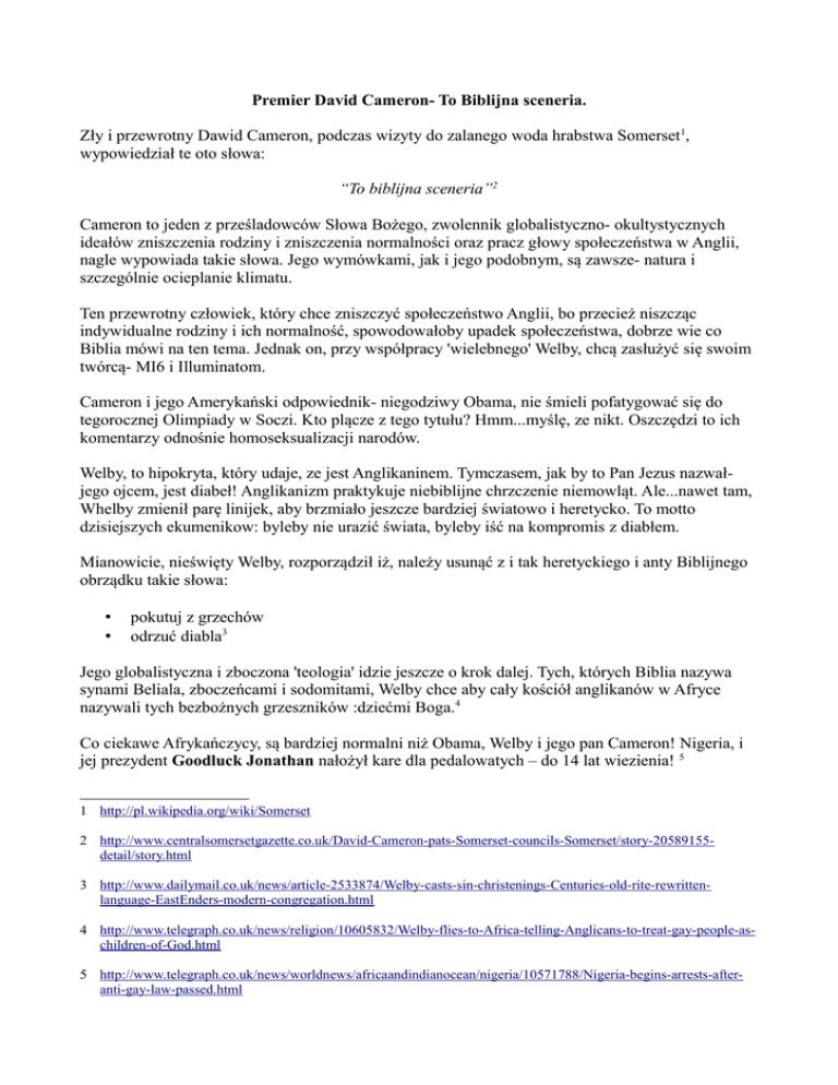 Premier David Cameron- To Biblijna sceneria. Zły i przewrotny Dawid Cameron, podczas wizyty do zalanego woda hrabstwa Somerset1, wypowiedział te oto słowa: “To biblijna sceneria”2 Cameron to jeden z prześladowców Słowa Bożego, zwolennik globalistyczno- okultystycznych ideałów zniszczenia rodziny i zniszczenia normalności oraz pracz głowy społeczeństwa w Anglii, nagle wypowiada takie słowa. Jego wymówkami, jak i jego podobnym, są zawsze- natura i szczególnie ocieplanie klimatu. Ten przewrotny człowiek, który chce zniszczyć społeczeństwo Anglii, bo przecież niszcząc indywidualne rodziny i ich normalność, spowodowałoby upadek społeczeństwa, dobrze wie co Biblia mówi na ten tema. Jednak on, przy współpracy 'wielebnego' Welby, chcą zasłużyć się swoim twórcą- MI6 i Illuminatom. Cameron i jego Amerykański odpowiednik- niegodziwy Obama, nie śmieli pofatygować się do tegorocznej Olimpiady w Soczi. Kto plącze z tego tytułu? Hmm...myślę, ze nikt. Oszczędzi to ich komentarzy odnośnie homoseksualizacji narodów. Welby, to hipokryta, który udaje, ze jest Anglikaninem. Tymczasem, jak by to Pan Jezus nazwałjego ojcem, jest diabeł! Anglikanizm praktykuje niebiblijne chrzczenie niemowląt. Ale...nawet tam, Whelby zmienił parę linijek, aby brzmiało jeszcze bardziej światowo i heretycko. To motto dzisiejszych ekumenikow: byleby nie urazić świata, byleby iść na kompromis z diabłem. Mianowicie, nieświęty Welby, rozporządził iż, należy usunąć z i tak heretyckiego i anty Biblijnego obrządku takie słowa: • • pokutuj z grzechów odrzuć diabla3 Jego globalistyczna i zboczona 'teologia' idzie jeszcze o krok dalej. Tych, których Biblia nazywa synami Beliala, zboczeńcami i sodomitami, Welby chce aby cały kościół anglikanów w Afryce nazywali tych bezbożnych grzeszników :dziećmi Boga.4 Co ciekawe Afrykańczycy, są bardziej normalni niż Obama, Welby i jego pan Cameron! Nigeria, i jej prezydent Goodluck Jonathan nałożył kare dla pedalowatych – do 14 lat wiezienia! 5 1 http://pl.wikipedia.org/wiki/Somerset 2 http://www.centralsomersetgazette.co.uk/David-Cameron-pats-Somerset-councils-Somerset/story-20589155detail/story.html 3 http://www.dailymail.co.uk/news/article-2533874/Welby-casts-sin-christenings-Centuries-old-rite-rewrittenlanguage-EastEnders-modern-congregation.html 4 http://www.telegraph.co.uk/news/religion/10605832/Welby-flies-to-Africa-telling-Anglicans-to-treat-gay-people-aschildren-of-God.html 5 http://www.telegraph.co.uk/news/worldnews/africaandindianocean/nigeria/10571788/Nigeria-begins-arrests-afteranti-gay-law-passed.html Uganda natomiast przewiduje dożywocie 6! Dodatkowo, rzecznik prasowy prezydenta Nigerii7 powiedział, ze u nich Nigeryjczycy w 90% sprzeciwiają się pedałom. Podobny stosunek do tych znienormalnialkow ma Rosja. Podczas dnia rozpoczęcia Sochi 2014, policja w Rosji aresztowała 10 demonstrujących pedalskich aktywistów.8 Zostali ostrzeżeni, ze Rosja nie będzie tolerować tego ohydnego zboczenia. Jednak oni nie słuchają. Wiec musi być reakcja. Pedały chcą przynieść wszędzie swoje zło. I tam gdzie są tolerowani, przynosi to zniszczenie- życia ludzi, huragany i powodzie. Rosjanie i Afrykanczycy, pokazali swoja normalność i troskę o człowieka. Diabelskie kłamcy i pasożyty, chcą włazić tam gdzie ich nie chcą. W Rosji istnieje prawo9, które karze, osobę indywidualna kara w wysokości 1500$ za szerzenie zarazy i propagandy zboczeńców. Jeśli jest to organizacja, to ucierpi 30 000$. Nawet bałwochwalca Kiryll powiedział, ze uznanie pedałowców, jest „Grzechem Apokalipsy”. Każdy Chrześcijanin w Polsce powinien protestować Google, ponieważ, to jeden z nośników i finansistów, nosicieli AIDS. To bazgrol Google na zachodnich jego stronach! To nie pierwszy już raz. Oni promują zagładę społeczeństwa. Ukrywają statystyki i oczywista prawdę na ten temat. Dzieki Cameronowi domy rodzinne są zatopione przez straszna powódź. Dzieci płyną do szkoły na lodkach! To boży bicz na KAZDY kraj bez wyjątku, który próbuje zmieniać odwieczne prawo do normalności dane przez Jezusa, każdemu człowiekowi. 6 http://www.telegraph.co.uk/news/worldnews/africaandindianocean/uganda/10531563/Uganda-passes-anti-gaybill.html 7 http://www.telegraph.co.uk/news/worldnews/africaandindianocean/nigeria/10571788/Nigeria-begins-arrests-afteranti-gay-law-passed.html 8 http://news.yahoo.com/gay-rights-activists-arrested-russia-182838305.html 9 http://rt.com/news/russia-gay-law-myths-951/ Pokutuj dziś! Odwróć się od zła, swych dróg i fałszywych filozofii. Tylko Jezus może wybaczyć twoje liczne grzechy. Jego krew wciąż obmywa i czyni normalnym! Kraje Europy i USA- Bóg pomści się za wasze zło. I to jest nieuniknione. Jedyna nadzieja jest wasza szczera pokuta i odrzucenie tych złych, kalających człowieka praktyk! Inaczej, oczekujcie na więcej! Liderzy Protestantyzmu- Bojaźń Jezusa to początek mądrości. Wielu z was jednak, powołując się na niebiblijna, niezdefiniowana 'miłość ' idzie w ekumenie z bałwanami, pokazuje miękki kręgosłup i przez strach gotowa jest zdradzać Jezusa przez porzucenie jasnych jego nauk ! Uważajcie, bo Bóg nie zna doktryny- raz zbawiony, albo nie tykaj bożych wybrańców. To wymysły CZLOWIEKA. Sad zacznie się od domu Bożego. Odstępstwo wasze poniesiecie nie tylko wy, ale i następne pokolenia. Chyba,ze …. będziecie pokutować. Amen. Potop w Anglii: UK floods: Somerset flood zone - video http://www.youtube.com/watch?v=YKLErRBQax0 Military Aid for Somerset Flood Disaster Victims 30.01.14 http://www.youtube.com/watch?v=mF7Mn-RavTQ Rescue boat takes flood-hit Muchelney's children to school http://www.bbc.co.uk/news/uk-england-somerset-25710861 Dramatic scenes as huge waves batter Dawlish sea wall and station. Beach huts smashed. http://www.youtube.com/watch?v=8rEXi81qjx8 Ekumenia w Kościele Zielonoświątkowym http://www.ska
