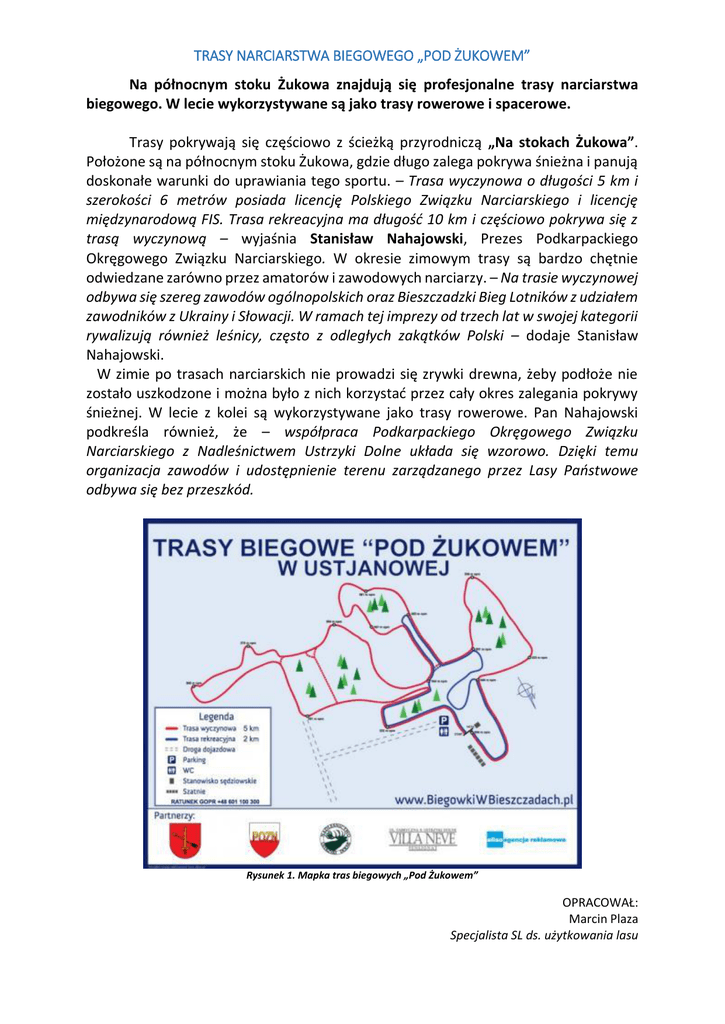 TRASY NARCIARSTWA BIEGOWEGO „POD ŻUKOWEM” Na północnym stoku Żukowa znajdują się profesjonalne trasy narciarstwa biegowego. W lecie wykorzystywane są jako trasy rowerowe i spacerowe. Trasy pokrywają się częściowo z ścieżką przyrodniczą „Na stokach Żukowa”. Położone są na północnym stoku Żukowa, gdzie długo zalega pokrywa śnieżna i panują doskonałe warunki do uprawiania tego sportu. – Trasa wyczynowa o długości 5 km i szerokości 6 metrów posiada licencję Polskiego Związku Narciarskiego i licencję międzynarodową FIS. Trasa rekreacyjna ma długość 10 km i częściowo pokrywa się z trasą wyczynową – wyjaśnia Stanisław Nahajowski, Prezes Podkarpackiego Okręgowego Związku Narciarskiego. W okresie zimowym trasy są bardzo chętnie odwiedzane zarówno przez amatorów i zawodowych narciarzy. – Na trasie wyczynowej odbywa się szereg zawodów ogólnopolskich oraz Bieszczadzki Bieg Lotników z udziałem zawodników z Ukrainy i Słowacji. W ramach tej imprezy od trzech lat w swojej kategorii rywalizują również leśnicy, często z odległych zakątków Polski – dodaje Stanisław Nahajowski. W zimie po trasach narciarskich nie prowadzi się zrywki drewna, żeby podłoże nie zostało uszkodzone i można było z nich korzystać przez cały okres zalegania pokrywy śnieżnej. W lecie z kolei są wykorzystywane jako trasy rowerowe. Pan Nahajowski podkreśla również, że – współpraca Podkarpackiego Okręgowego Związku Narciarskiego z Nadleśnictwem Ustrzyki Dolne układa się wzorowo. Dzięki temu organizacja zawodów i udostępnienie terenu zarządzanego przez Lasy Państwowe odbywa się bez przeszkód. Rysunek 1. Mapka tras biegowych „Pod Żukowem” OPRACOWAŁ: Marcin Plaza Specjalista SL ds. użytkowania lasu
