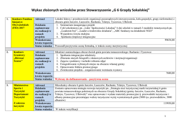 Wykaz złożonych wniosków przez Stowarzyszenie „G 6 Grzędy Sokalskiej” 1. 2. Konkurs Fundusz Inicjatyw Obywatelskich (FIO) 2017 Konkurs Grantowy „Równać Szanse” Adresaci Lokalni liderzy i przedstawiciele organizacji pozarządowych (stowarzyszenia, koła gospodyń, grupy nieformalne) z obszaru gmin Jarczów, Łaszczów, Rachanie, Telatyn, Tyszowce, Ulhówek 1. Seminarium inaugurujące projekt 2. Cykl szkoleniowy pn. „Lider Społeczności Lokalnej” 6 dni szkoleń w ramach 3 modułów tematycznych pn. „Leaderem być”, „Leader a środowisko działania”, „ABC funduszy na działalność NGO” 3. Wyjazdowa wizyta studyjna 4. Spotkania (imprezy) integracyjne 99654,00 Działania zaplanowane do realizacji w ramach projektu Wnioskowana kwota wsparcia Status wniosku Przeszedł pozytywnie ocenę formalną, w trakcie oceny merytorycznej Adresaci Działania zaplanowane do realizacji w ramach projektu Młodzież zamieszkująca obszar dwóch gmin powiatu tomaszowskiego: Rachanie i Tyszowce 1. Spotkania integracyjne młodzieży. 2. Zbieranie starych fotografii z domowych archiwów i instytucji/organizacji 3. Zajęcia z podstawy i techniki robienia zdjęć 4. Fotografowanie wybranych miejsc na obszarze własnej gminy 5. Opracowanie folderu promocyjnego 6. Zwieńczenie projektu - zorganizowanie wernisażu wystawy 7600,00 Wnioskowana kwota wsparcia Status wniosku Wybrany do dofinansowania – pozytywna ocena 3. Ministerstwo Sportu i Turystyki Departament Turystyki Z zakresu turystyki Adresaci Działania zaplanowane do realizacji w ramach projektu Wnioskowana kwota wsparcia Status wniosku Mieszkańcy obszaru 6 gmin Jarczów, Łaszczów, Rachanie, Telatyn, Tyszowce, Ulhówek Zostanie opracowana strategia rozwoju turystyki pn. „Strategia sieci turystycznej marki terytorialnej 6 gmin powiatu tomaszowskiego położonych na obszarze Grzędy Sokalskiej (gminy Jarczów, Łaszczów, Rachanie, Telatyn, Tyszowce, Ulhówek)” oraz opracowane i wydane materiały promocyjne tj. przewodniki turystyczne i albumy promocyjne prezentujące walory turystyczne wyżej wymienionych gmin (3000 tys. przewodników, 3000 albumów) 119950,00 W trakcie weryfikacji 1 Wykaz złożonych wniosków przez Stowarzyszenie „G 6 Grzędy Sokalskiej” 4. MINISTERSTW O KULTURY I DZIEDZICTWA NARODOWEG O KULTURA LUDOWA I TRADYCYJNA 2017 5. Status wniosku MINISTERSTW O KULTURY I DZIEDZICTWA NARODOWEG O Adresaci Działania zaplanowane do realizacji w ramach projektu Mieszkańcy gmin Jarczów, Łaszczów, Rachanie, Telatyn, Tyszowce, Ulhówek 1. Warsztat szkoleniowy pn. „Kultura ludowa podstawą utrzymania własnej tożsamości regionalnej” – wykłady prowadzone przez specjalistę z zakresu etnografii i historii sztuki. 2. Konkurs fotograficzny „Wsi spokojna, wsi wesoła - kultura ludowa Grzędy Sokalskiej” 3. Warsztaty rękodzielnictwa ludowego 4. Konkurs kulinarny pn. „Smaki Grzędy Sokalskiej’. 5. Opracowanie i wydrukowanie folderu pn. „Kultura ludowa Grzędy Sokalskiej” 6. Podsumowanie projektu „Wystawa Sztuki ludowej” 69130,00 Wnioskowana kwota wsparcia Status wniosku W trakcie weryfikacji Adresaci Działania zaplanowane do realizacji w ramach projektu Muzyka 2017 Mieszkańcy gmin Jarczów, Łaszczów, Rachanie, Telatyn, Tyszowce, Ulhówek) 1. „Majówka Maryjna” w Chodywańcach 2. „Koncert muzyki średniowiecznej” w Czermnie (gmina Tyszowce) 3. „Festiwal zespołów i orkiestr folklorystycznych ” w Łaszczowie 4. „V Letnia Akademia Artystyczna Chopin w Poturzynie” w Poturzynie (gmina Telatyn) 5. „Festiwal kultury kresowej w Rachaniach” w Rachaniach 6. „Festiwal pieśni maryjnych i patriotycznych w Ulhówku” Wnioskowana kwota wsparcia Status wniosku W trakcie weryfikacji 6. Ministerstwo Rodziny Pracy i Polityki Społecznej ASOS Adresaci Działania zaplanowane do realizacji w ramach projektu 170400,00 Mieszkańcy gmin Jarczów, Łaszczów, Rachanie, Telatyn, Tyszowce, Ulhówek w wieku 60+ 1. Warsztaty manualne z rękodzielnictwa 2. Zajęcia edukacyjne – szkoleniowe z zakresu prawa i zdrowia pn. „Osoby starsze w prawie rodzinnym i opiekuńczym”, „Prawo spadkowe”, „Marketingowe techniki perswazji jako zagrożenie dla seniora”, „Prawne możliwości działań osób starszych pokrzywdzonych w wyniku przestępstwa”, „Zdrowe odżywianie, zdrowe ciało i umysł”, „Rola aktywności ruchowej w życiu seniora”. 3. Zajęcia kreatywne - zajęcia twórczego myślenia, trening pamięci. Uczestnicy w ramach zajęć przygotują do przedstawienia wybraną sztukę, która zostanie wystawiona podczas Obchodów Światowego Dnia Seniora. 2 Wykaz złożonych wniosków przez Stowarzyszenie „G 6 Grzędy Sokalskiej” 4. 5. 6. 7. 8. Konsultacje z dietetykiem. Konsultacje ze specjalistą rehabilitacji ruchowej. Zajęcia ruchowe z instruktorem – wyjazd na krytą pływalnię do Zamościa. Wydarzenia okolicznościowe tj. Dzień Seniora. Konferencja podsumowująca realizację zadania publicznego Wnioskowana kwota wsparcia Status wniosku W trakcie weryfikacji 7. Ministerstwo Obrony Narodowej Adresaci Działania zaplanowane do realizacji w ramach projektu Wnioskowana kwota wsparcia Status wniosku 159680,00 Mieszkańcy gmin Jarczów, Łaszczów, Rachanie, Telatyn, Tyszowce, Ulhówek Organizacja Uroczystości patriotycznych na obszarze gmin Jarczów, Łaszczów, Rachanie, Telatyn, Tyszowce, Ulhówek 39880,00 W trakcie weryfikacji 3
