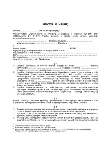 UMOWA O NAUK zawarta ............................... w Krakowie pomi dzy: Uniwersytetem Ekonomicznym w Krakowie, z siedzib w Krakowie (31-510) przy ul.Rakowickiej 27, 31-510 Kraków, zwanym w dalszej cz )ci umowy Uczelni , reprezentowanym przez: .................................................. – Dziekana Wydzia-u ………………………………. przy kontrasygnacie ................................. – Kwestora a Pani / Panem ………..…………….......………….……………..., PESEL ................................... legitymuj c /-cym si dowodem osobistym (seria, numer) …………………………….………… lub paszportem (seria, numer) ……………………………………………………………………... zam. ……………………………………….………………….....…………………………………….. tel. kontaktowy…………………………………………………… zwan /-ym w dalszej cz )ci Studentem §1 1. Uczelnia o)wiadcza, i5 Student zostaje przyj ty na studia ...................... 1 stopnia na Wydziale ......................................................, prowadzone w formie ........................... 2 w trybie ........................ 3, na kierunku ................................................................... 2. Uczelnia, dzia-aj c zgodnie z obowi zuj cymi przepisami prawa, w tym z ustaw z dnia 27 lipca 2005r. Prawo o szkolnictwie wy5szym (Dz.U. nr 164, poz.1365, z pó9n.zm.) oraz obowi zuj cymi w Uczelni: statutem, regulaminem studiów, planami studiów i programami nauczania, zobowi zuje si )wiadczy: na rzecz Studenta us-ug kszta-cenia od dnia ............................ i dalej do ko;ca trwania studiów, o których mowa w ust.1, a po spe-nieniu przez Studenta wszystkich wymaganych warunków – wyda: dyplom uko;czenia studiów. 3. Uczelnia zapewnia warunki do nauki poprzez: realizowanie programu nauczania zgodnego z obowi zuj cymi w tym zakresie wymogami, zatrudnienie wykwalifikowanej kadry pracowników naukowo-dydaktycznych, organizacj i obs-ug administracyjn procesu kszta-cenia. §2 Prawa i obowi zki Studenta wynikaj z powszechnie obowi zuj cych aktów prawnych oraz z przepisów wewn trznych Uczelni, w tym w szczególno)ci z regulaminu studiów. §3 1. Rodzaje pobieranych przez Uczelni op-at oraz zasady odp-atno)ci zwi zane z procesem kszta-cenia w Uczelni ustalane s przez Senat Uczelni w formie regulaminu. 2. Wysoko): op-at za kszta-cenie ustalana jest przez Rektora na ka5dy rok akademicki, zgodnie z obowi zuj cymi przepisami prawa. 3. W przypadku wyst pienia nadzwyczajnych zmian stosunków gospodarczych, które s niezale5ne od Uczelni, w tym w szczególno)ci zmiany zasad finansowania kszta-cenia 1 2 3 wpisa: odpowiednio „pierwszego” lub „drugiego” wpisa: odpowiednio „stacjonarnej” lub „niestacjonarnej” w przypadku studiów stacjonarnych wyra5enie „w trybie ...................” wykre)li:, a w przypadku studiów niestacjonarnych wpisa: odpowiednio „wieczorowym” lub „zaocznym” 4. 5. 6. 7. 8. 9. ze strony Pa;stwa lub zmiany wysoko)ci obci 5e; podatkowych od us-ug obj tych niniejsz umow , Uczelnia zastrzega sobie prawo zmiany wysoko)ci op-at, o których mowa w ust.2, w granicach ekwiwalencji )wiadcze;. Zasady ewentualnych zwolnie; z op-at, przesuni cia terminów ich uiszczenia i roz-o5enia na raty, a tak5e ewentualnych zwrotów (np. w przypadku rezygnacji ze studiów), zawarte s w regulaminie, o którym mowa w ust.1. Zasady wnoszenia i wysoko): op-at w przypadku powtarzania roku, semestru b d9 okre)lonych zaj : uregulowane s w przepisach, o których mowa w ust.1-2. Ewentualne zmiany w regulaminie odp-atno)ci oraz zmiany wysoko)ci op-at, w tym w sytuacji wyst pienia okoliczno)ci, o których mowa w ust.3, wymagaj akceptacji przez obie strony, wyra5onej poprzez podpisanie stosownego aneksu do niniejszej umowy. Odmowa podpisania aneksu traktowana b dzie jako wypowiedzenie umowy, z zachowaniem przepisów §6, z tym 5e termin wypowiedzenia liczony b dzie od dnia nast puj cego po dniu pisemnego lub ustnego z-o5enia o)wiadczenia o odmowie podpisania aneksu do umowy. Jako wypowiedzenie umowy traktowane b dzie równie5 uchylanie si od podpisania aneksu, z zachowaniem przepisów §6, z tym 5e termin wypowiedzenia liczony b dzie od 21. dnia od daty wys-ania przez Uczelni na wskazany przez studenta adres do korespondencji listu poleconego zawiadamiaj cego o konieczno)ci podpisania aneksu. Student o)wiadcza, 5e zapozna- si z regulaminem, o którym mowa w ust.1, obowi zuj cym zarz dzeniem Rektora w sprawie wysoko)ci op-at za kszta-cenie oraz innymi aktami wewn trznymi obowi zuj cymi w Uczelni, które reguluj jego prawa i obowi zki. §4 Student zobowi zany jest do ka5dorazowego pisemnego zawiadomienia Uczelni o zmianie swojego miejsca zamieszkania i adresu do korespondencji. W przypadku zaniechania tego obowi zku, korespondencj wys-an pod ostatni znany Uczelni adres do korespondencji uwa5a si za dor czon . §5 1. Niewniesienie przez Studenta op-aty lub raty op-aty przez okres 30 dni („okres karencji”) od terminu okre)lonego w regulaminie, o którym mowa w §3 ust.1, uniemo5liwia Studentowi korzystanie z us-ug edukacyjnych, co skutkuje skre)leniem Studenta z listy studentów. 2. W przypadku zaistnienia okoliczno)ci, o których mowa w ust.1, ponowne wpisanie na list studentów b dzie mo5liwe po uregulowaniu wszystkich zaleg-o)ci w op-atach wraz z odsetkami za nieterminow wp-at , a tak5e op-aty za ponowne wpisanie na list studentów, zgodnie z regulaminem, o którym mowa w §3 ust.1, w wysoko)ci okre)lonej w obowi zuj cym zarz dzeniu Rektora. 3. W sytuacji, o której mowa w ust.1, je)li w terminie kolejnych 30 dni od up-ywu „okresu karencji” okre)lonego w ust.1, Student nie ureguluje nale5nych Uczelni op-at i odsetek, o których mowa w ust.2 i nie wyst pi z wnioskiem o ponowne wpisanie na list studentów, umowa ulega automatycznemu rozwi zaniu bez okresu wypowiedzenia. 4