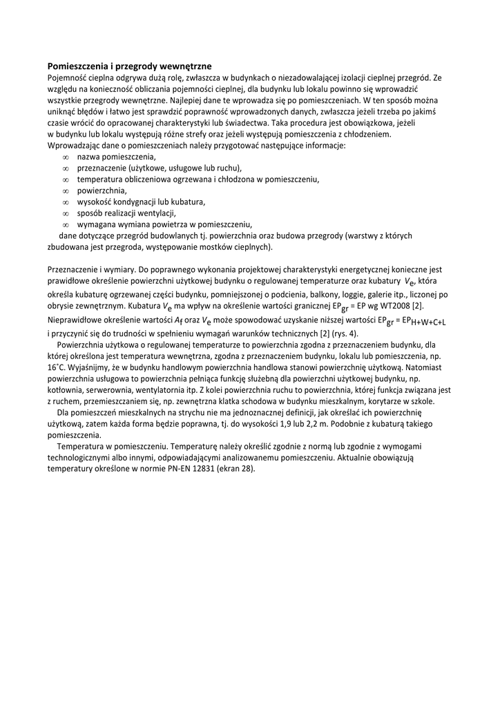 Pomieszczenia i przegrody wewnętrzne Pojemność cieplna odgrywa dużą rolę, zwłaszcza w budynkach o niezadowalającej izolacji cieplnej przegród. Ze względu na konieczność obliczania pojemności cieplnej, dla budynku lub lokalu powinno się wprowadzić wszystkie przegrody wewnętrzne. Najlepiej dane te wprowadza się po pomieszczeniach. W ten sposób można uniknąć błędów i łatwo jest sprawdzić poprawność wprowadzonych danych, zwłaszcza jeżeli trzeba po jakimś czasie wrócić do opracowanej charakterystyki lub świadectwa. Taka procedura jest obowiązkowa, jeżeli w budynku lub lokalu występują różne strefy oraz jeżeli występują pomieszczenia z chłodzeniem. Wprowadzając dane o pomieszczeniach należy przygotować następujące informacje: • nazwa pomieszczenia, • przeznaczenie (użytkowe, usługowe lub ruchu), • temperatura obliczeniowa ogrzewana i chłodzona w pomieszczeniu, • powierzchnia, • wysokość kondygnacji lub kubatura, • sposób realizacji wentylacji, • wymagana wymiana powietrza w pomieszczeniu, dane dotyczące przegród budowlanych tj. powierzchnia oraz budowa przegrody (warstwy z których zbudowana jest przegroda, występowanie mostków cieplnych). Przeznaczenie i wymiary. Do poprawnego wykonania projektowej charakterystyki energetycznej konieczne jest prawidłowe określenie powierzchni użytkowej budynku o regulowanej temperaturze oraz kubatury Ve, która określa kubaturę ogrzewanej części budynku, pomniejszonej o podcienia, balkony, loggie, galerie itp., liczonej po obrysie zewnętrznym. Kubatura Ve ma wpływ na określenie wartości granicznej EPgr = EP wg WT2008 [2]. Nieprawidłowe określenie wartości Af oraz Ve może spowodować uzyskanie niższej wartości EPgr = EPH+W+C+L i przyczynić się do trudności w spełnieniu wymagań warunków technicznych [2] (rys. 4). Powierzchnia użytkowa o regulowanej temperaturze to powierzchnia zgodna z przeznaczeniem budynku, dla której określona jest temperatura wewnętrzna, zgodna z przeznaczeniem budynku, lokalu lub pomieszczenia, np. 16˚C. Wyjaśnijmy, że w budynku handlowym powierzchnia handlowa stanowi powierzchnię użytkową. Natomiast powierzchnia usługowa to powierzchnia pełniąca funkcję służebną dla powierzchni użytkowej budynku, np. kotłownia, serwerownia, wentylatornia itp. Z kolei powierzchnia ruchu to powierzchnia, której funkcja związana jest z ruchem, przemieszczaniem się, np. zewnętrzna klatka schodowa w budynku mieszkalnym, korytarze w szkole. Dla pomieszczeń mieszkalnych na strychu nie ma jednoznacznej definicji, jak określać ich powierzchnię użytkową, zatem każda forma będzie poprawna, tj. do wysokości 1,9 lub 2,2 m. Podobnie z kubaturą takiego pomieszczenia. Temperatura w pomieszczeniu. Temperaturę należy określić zgodnie z normą lub zgodnie z wymogami technologicznymi albo innymi, odpowiadającymi analizowanemu pomieszczeniu. Aktualnie obowiązują temperatury określone w normie PN-EN 12831 (ekran 28). EKRAN 28. Temperatur w pomieszczeniach wg PN-EN 12831 Temperaturę chłodzenia należy przyjąć zgodnie z projektem lub zgodnie z określonymi wymogami. Najczęściej przyjmuje się 23–24˚C. Wentylacja Wentylacja w budynku, lokalu lub pomieszczeniu może być realizowana jako naturalna lub mechaniczna: nawiewna, wywiewna, nawiewno-wywiewna, nawiewno-wywiewna z odzyskiem ciepła oraz z przerwami w działaniu. Określenie wymaganej wymiany powietrza w pomieszczeniach oparte jest na normie PN-83/B03430/Az3:2000, w której rozróżnia się pomieszczenia w budownictwie mieszkaniowym oraz pozostałe. W budownictwie mieszkaniowym wentylacja naturalna realizowana jest z pomieszczeń czystych do brudnych, przy czym do wymaganej wymiany należy przyjąć wartość większą z dwóch: max(Vczyste; Vbrudne). Wymagana minimalna wymiana powietrza w pomieszczeniach czystych wynosi 1 wym/h. Wymagana wymiana w pomieszczeniach brudnych: kuchnia gazowa – 70 m3/h, kuchnia elektryczna – 50 m3/h, łazienka – 50 m3/h, WC – 30 m3/h. W rozporządzeniu [1] dla „kawalerek” do obliczeń należy przyjmować wartość łącznej wymiany 80 m3/h. Dla pomieszczeń użyteczności publicznej wymagana minimalna wymiana powietrza wynika z liczby przebywających w nich użytkowników. Dla 1 osoby dorosłej wymagana jest wymiana 20 m3/h, a w pomieszczeniach, gdzie wolno palić – 30 m3/h. Dla dziecka – 15 m3/h. W pomieszczeniu klimatyzowanym oraz wentylowanym o nieotwieralnych oknach dla każdej osoby – 30 m3/h, a w przypadku palenia – 50 m3/h. W budynkach innego typu wymagana wymiana powietrza (oraz zmienność wymiany powietrza w poszczególnych pomieszczeniach) powinna wynikać z innych przepisów i powinna być uzgodniona z odpowiednim rzeczoznawcą. Wartości te powinny być określone w projekcie i przeniesione do obliczanej charakterystyki energetycznej budynku oraz do świadectwa charakterystyki energetycznej budynku (formularz 7). Formularz 7. WENTYLACJA – PRZYGOTOWANIE DANYCH wymagana wymiana Lokal pomieszczenie typ wentylacji nawiew [m³/h] wywiew [m³/h] skuteczność rekuperatora [%] skuteczność wymiennika gruntowego [%] czas wyłączenia went. mech. [h] strumień tentacji przy wyłączonych wentylatorach (kanałowej) 3 [m /h] Przygotowując dane do wykonania projektowej charakterystyki energetycznej dla budynku chłodzonego należy dokładnie przeanalizować możliwość wprowadzenia przerw dla chłodzenia oraz dla ogrzewania. Brak przerw w przygotowaniu chłodu może spowodować, że spełnienie wymagań na EP będzie niemożliwe. Dlatego należy określić przerwy tygodniowe, weekendowe oraz inne. Należy podać wówczas długość przerwy, temperaturę w czasie trwania przerwy, powtarzalność przerwy (codziennie, dnie robocze, weekend lub inne). Przerwy mogą być różne dla poszczególnych miesięcy – patrz: formularz 8. FORMULARZ 8. PRZYGOTOWANIE DANYCH DO PRZERW W OKRESIE GRZEWCZYM I KLIMATYZACYJNYM miesiąc przerwa w