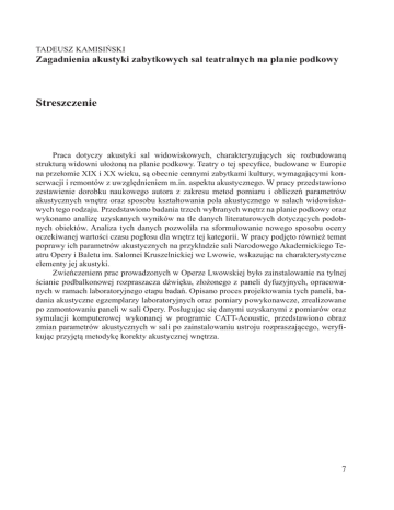 TADEUSZ KAMISIŃSKI Zagadnienia akustyki zabytkowych sal teatralnych na planie podkowy Streszczenie Praca dotyczy akustyki sal widowiskowych, charakteryzujących się rozbudowaną strukturą widowni ułożoną na planie podkowy. Teatry o tej specyfice, budowane w Europie na przełomie XIX i XX wieku, są obecnie cennymi zabytkami kultury, wymagającymi konserwacji i remontów z uwzględnieniem m.in. aspektu akustycznego. W pracy przedstawiono zestawienie dorobku naukowego autora z zakresu metod pomiaru i obliczeń parametrów akustycznych wnętrz oraz sposobu kształtowania pola akustycznego w salach widowiskowych tego rodzaju. Przedstawiono badania trzech wybranych wnętrz na planie podkowy oraz wykonano analizę uzyskanych wyników na tle danych literaturowych dotyczących podobnych obiektów. Analiza tych danych pozwoliła na sformułowanie nowego sposobu oceny oczekiwanej wartości czasu pogłosu dla wnętrz tej kategorii. W pracy podjęto również temat poprawy ich parametrów akustycznych na przykładzie sali Narodowego Akademickiego Teatru Opery i Baletu im. Salomei Kruszelnickiej we Lwowie, wskazując na charakterystyczne elementy jej akustyki. Zwieńczeniem prac prowadzonych w Operze Lwowskiej było zainstalowanie na tylnej ścianie podbalkonowej rozpraszacza dźwięku, złożonego z paneli dyfuzyjnych, opracowanych w ramach laboratoryjnego etapu badań. Opisano proces projektowania tych paneli, badania akustyczne egzemplarzy laboratoryjnych oraz pomiary powykonawcze, zrealizowane po zamontowaniu paneli w sali Opery. Posługując się danymi uzyskanymi z pomiarów oraz symulacji komputerowej wykonanej w programie CATT-Acoustic, przedstawiono obraz zmian parametrów akustycznych w sali po zainstalowaniu ustroju rozpraszającego, weryfikując przyjętą metodykę korekty akustycznej wnętrza. 7 TADEUSZ KAMISIŃSKI Acoustics Issues in Historic Horseshoe-Shaped Theatre Halls Summary The presented work deals with the problem of acoustics in auditoriums characterised by an elaborate horseshoe-shape plan. Theatres of that type, popularly erected in Europe at the turn of the 19th and 20th century, in our times constitute cultural monuments that require careful repair and conservation with, among other things, the acoustic aspect taken into account. The paper presents a summary of the author’s scientific achievements in the area of measurement and calculation methods specific for the room acoustics as well as techniques of the acoustic field shaping in interiors of that type. Research work on three selected rooms with horseshoe layout is presented together with analysis of the obtained results in comparison with data published in available literature on similar objects. The analysis allowed to formulate a new approach to assessment of the expected reverberation time value in interiors of that category. The issue of improving acoustic parameters in such auditoriums is illustrated by the example of the Salomea Kruszelnicka National Academic Theatre of Opera and Ballet in Lviv, Ukraine, with stress put on its specific acoustic features. The coping stone of the work carried out in Lviv Opera House consisted in installing, on rear wall of the auditorium, a sound-diffusing structure consisting of diffusion panels designed in the framework of the project’s laboratory stage. Description is presented of the panel designing process, acoustic tests carried out with laboratory samples, and as-built measurements performed after installation of the panels in the object. Using the data obtained from measurements and calculations performed in the CATT-Acoustic software environment, a comprehensive picture is presented of changes observed in acoustic parameters of the auditorium area after installation of the sound-diffusing structure, resulting in verification of the methodology adopted for the acoustic adjustment of the interior. 8