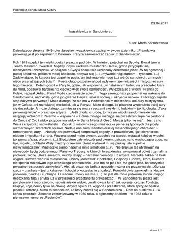 Pobrano z portalu Mapa Kultury 29.04.2011 Iwaszkiewicz w Sandomierzu ____________________________ autor: Marta Konarzewska Dziewiątego sierpnia 1949 roku Jarosław Iwaszkiewicz zapisał w swoim dzienniku: „Prawdziwą perwersją jest po zapiskach z Palermo i Paryża zamieszczać zapiski z Sandomierza”. Rok 1949 spędził ten wielki poeta i pisarz w podróży. W kwietniu pojechał na Sycylię. Bywał tam w Teatro Massimo, zwiedzał. Między innymi urokliwe miasteczko Cefalù, gdzie przyglądał się niezwykłemu obrzędowi. W Książce o Sycylii absolutnie urzeczony ceremonią pisał: „W tej ogromnej i pustej katedrze, gdzieś w małej kapliczce, odbywa się (...) umywanie nóg starcom – rybakom. (...) Zadziwiające, że katedra jest zupełnie pusta, ani jednego wiernego (...) wśród samotnych, zimnych i nieco przerażających ścian”. Poeta długo pozostawał pod wpływem tajemniczości i mistycznej aury tego miejsca. Potem gościł w Paryżu, gdzie, jak wspomina, „w hałaśliwym hotelu na przeciwko Gare du Nord, odczuwał bardziej niż kiedykolwiek swoją samotność”. Wyjeżdżając z Włoch i Francji do Polski, napisał „Adieu, Paris! Może rzeczywiście adieu”. Tego samego lata przyjechał na wakacje do Sandomierza, nad Wisłę, gdzie po gwarze Paryża, szukał spokoju i ukojenia nerwów. Dlaczego zapiski stąd nazywa perwersją? Może dlatego, że nie ma w nadwiślańskim miasteczku ani aury mistycyzmu, jak w Cefalù, ani rozhukanej wielkości, jak w Paryżu. Może dlatego, że pisarska wyobraźnia owej aury się doszukuje. A może dlatego, że miesza się ona z rzeczami zwykłymi, ludzkimi – jak fizjologia. „Taką perwersję lubię” – przyznaje artysta. „Jeśli chodzi o urodę, to niczym widoki sandomierskie nie ustępują widokom z Palermo – wspomina – z okna mojego rozciąga się przestrzeń zupełnie podobna do Conca d`Oro i widok przypomina widok w Santa Maria di Gesù. Morza tylko nie ma”. Jest za to Wisła i krajobraz nadwiślański. Zapiski z malowniczego miasteczka pełne są typowych dla poety rozmarzonych, literackich opisów. Nadają one ziemi sandomierskiej melancholijnego charakteru i romantycznej aury. „Nastały dni prawdziwej sierpniowej pogody, z prawdziwym, »jak sierpniowe« niebem i mgiełkami z rana. Wczoraj przed moim oknem, zupełnie na wprost, wstawał księżyc w pełni, jak pomarańcza, olbrzymi. (...) Siedziałem cały wieczór pod oknem, patrząc na to wschodzące cudo, na łąki, mgiełki, poblaski Wisły między drzewami. Świat wydawał mi się piękny, ale zupełnie niewytłumaczalny. Miasteczko samo napełnia mnie smutkiem (...)”. Nie brakuje też utyskiwań na niewygody życia codziennego. Państwo Trębscy, u których Iwaszkiewicz wynajmował pokój trzymali na podwórku kozę. „Koza śmierdzi, muchy latają” – narzekał niemłody już artysta. Narzekał także na brak wygód i surowe warunki mieszkania. Obiady „dostawał” z pobliskiej Gospody Ludowej, której kucharz nie spełnia oczekiwań jego wrażliwego podniebienia. „Nie ma co pić i nie ma gdzie jeść, bo wszystkie prywatne restauracje zamknięte”. Ale, jak pisze, do jadła z gospody można się przyzwyczaić. „Gorsza rzecz – utyskuje – jest z kakaniem [chodzi o korzystanie z toalety]. Komórki dwie zamknęli na kluczyk potworne, brudne i cuchnące. O siadaniu mowy nie ma. (...) To jest dla mnie potworna strona mojego mieszkania tutaj i chyba już w przyszłości przestanę tu przyjeżdżać”. W Sandomierzu pisarz jest poirytowany i rozdrażniony, nadwiślańskie widoki, „malinowaja łuna”, jak opisuje, cytując Tołstoja, księżyc, koją nerwy tylko na chwilę. Artysta tęskni za wygodą i przestrzenią, która sprzyjać będzie pisaniu i refleksji. Mimo to scenariusz, za który zabrał się w Sandomierzu – Dom na pustkowiu – w końcu powstaje. Zostanie zekranizowany w 1950 roku, a ogłoszony drukiem – w 1983 roku w pierwszym numerze „Regionów”. strona 1 / 1