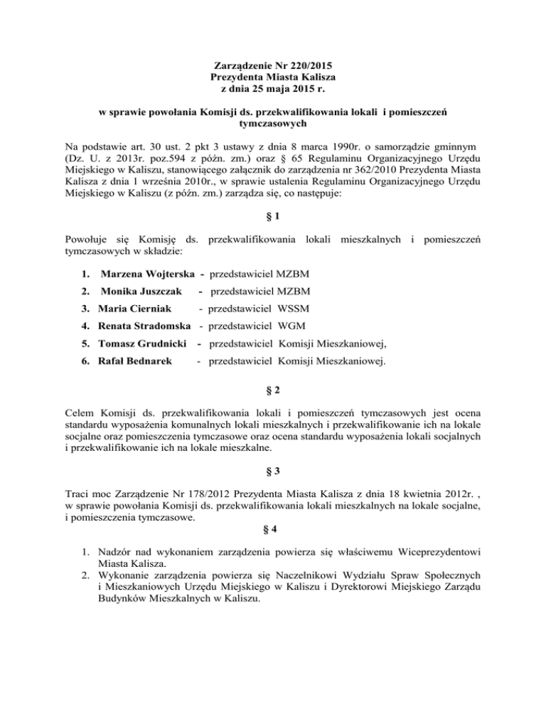 Zarządzenie Nr 220/2015 Prezydenta Miasta Kalisza z dnia 25 maja 2015 r. w sprawie powołania Komisji ds. przekwalifikowania lokali i pomieszczeń tymczasowych Na podstawie art. 30 ust. 2 pkt 3 ustawy z dnia 8 marca 1990r. o samorządzie gminnym (Dz. U. z 2013r. poz.594 z późn. zm.) oraz § 65 Regulaminu Organizacyjnego Urzędu Miejskiego w Kaliszu, stanowiącego załącznik do zarządzenia nr 362/2010 Prezydenta Miasta Kalisza z dnia 1 września 2010r., w sprawie ustalenia Regulaminu Organizacyjnego Urzędu Miejskiego w Kaliszu (z późn. zm.) zarządza się, co następuje: §1 Powołuje się Komisję ds. przekwalifikowania lokali mieszkalnych i pomieszczeń tymczasowych w składzie: 1. Marzena Wojterska - przedstawiciel MZBM 2. Monika Juszczak - przedstawiciel MZBM 3. Maria Cierniak - przedstawiciel WSSM 4. Renata Stradomska - przedstawiciel WGM 5. Tomasz Grudnicki - przedstawiciel Komisji Mieszkaniowej, 6. Rafał Bednarek - przedstawiciel Komisji Mieszkaniowej. §2 Celem Komisji ds. przekwalifikowania lokali i pomieszczeń tymczasowych jest ocena standardu wyposażenia komunalnych lokali mieszkalnych i przekwalifikowanie ich na lokale socjalne oraz pomieszczenia tymczasowe oraz ocena standardu wyposażenia lokali socjalnych i przekwalifikowanie ich na lokale mieszkalne. §3 Traci moc Zarządzenie Nr 178/2012 Prezydenta Miasta Kalisza z dnia 18 kwietnia 2012r. , w sprawie powołania Komisji ds. przekwalifikowania lokali mieszkalnych na lokale socjalne, i pomieszczenia tymczasowe. §4 1. Nadzór nad wykonaniem zarządzenia powierza się właściwemu Wiceprezydentowi Miasta Kalisza. 2. Wykonanie zarządzenia powierza się Naczelnikowi Wydziału Spraw Społecznych i Mieszkaniowych Urzędu Miejskiego w Kaliszu i Dyrektorowi Miejskiego Zarządu Budynków Mieszkalnych w Kaliszu. §5 Zarządzenie podlega publikacji w Biuletynie Informacji Publicznej. §6 Zarządzenie wchodzi w życie z dniem podpisania. Prezydent Miasta Kalisza /…/ Grzegorz Sapiński