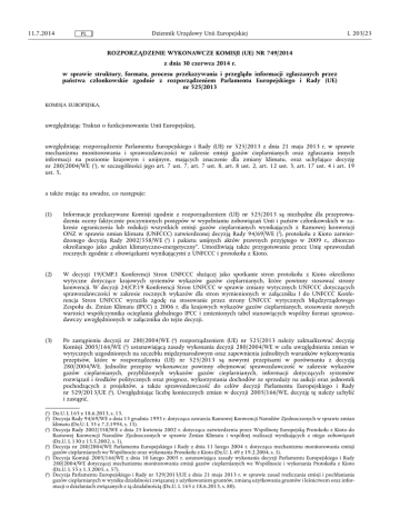 11.7.2014 Dziennik Urzędowy Unii Europejskiej PL L 203/23 ROZPORZĄDZENIE WYKONAWCZE KOMISJI (UE) NR 749/2014 z dnia 30 czerwca 2014 r. w sprawie struktury, formatu, procesu przekazywania i przeglądu informacji zgłaszanych przez państwa członkowskie zgodnie z rozporządzeniem Parlamentu Europejskiego i Rady (UE) nr 525/2013 KOMISJA EUROPEJSKA, uwzględniając Traktat o funkcjonowaniu Unii Europejskiej, uwzględniając rozporządzenie Parlamentu Europejskiego i Rady (UE) nr 525/2013 z dnia 21 maja 2013 r. w sprawie mechanizmu monitorowania i sprawozdawczości w zakresie emisji gazów cieplarnianych oraz zgłaszania innych informacji na poziomie krajowym i unijnym, mających znaczenie dla zmiany klimatu, oraz uchylające decyzję nr 280/2004/WE (1), w szczególności jego art. 7 ust. 7, art. 7 ust. 8, art. 8 ust. 2, art. 12 ust. 3, art. 17 ust. 4 i art. 19 ust. 5, a także mając na uwadze, co następuje: (1) Informacje przekazywane Komisji zgodnie z rozporządzeniem (UE) nr 525/2013 są niezbędne dla przeprowa dzenia oceny faktycznie poczynionych postępów w wypełnianiu zobowiązań Unii i państw członkowskich w za kresie ograniczenia lub redukcji wszystkich emisji gazów cieplarnianych wynikających z Ramowej konwencji ONZ w sprawie zmian klimatu (UNFCCC) zatwierdzonej decyzją Rady 94/69/WE (2), protokołu z Kioto zatwier dzonego decyzją Rady 2002/358/WE (3) i pakietu unijnych aktów prawnych przyjętego w 2009 r., zbiorczo określanego jako „pakiet klimatyczno-energetyczny”. Umożliwiają także przygotowanie przez Unię sprawozdań rocznych zgodnie z obowiązkami wynikającymi z UNFCCC i protokołu z Kioto. (2) W decyzji 19/CMP.1 Konferencji Stron UNFCCC służącej jako spotkanie stron protokołu z Kioto określono wytyczne dotyczące krajowych systemów wykazów gazów cieplarnianych, które powinny stosować strony konwencji. W decyzji 24/CP.19 Konferencji Stron UNFCCC w sprawie zmiany wytycznych UNFCCC dotyczących sprawozdawczości w zakresie rocznych wykazów dla stron wymienionych w załączniku I do UNFCCC Konfe rencja Stron UNFCCC wyraziła zgodę na stosowanie przez strony UNFCCC wytycznych Międzyrządowego Zespołu ds. Zmian Klimatu (IPCC) z 2006 r. dla krajowych wykazów gazów cieplarnianych, stosowanie nowych wartości współczynnika ocieplania globalnego IPCC i zmienionych tabel stanowiących wspólny format sprawoz dawczy uwzględnionych w załączniku do tejże decyzji. (3) Po zastąpieniu decyzji nr 280/2004/WE (4) rozporządzeniem (UE) nr 525/2013 należy zaktualizować decyzję Komisji 2005/166/WE (5) ustanawiającą zasady wykonania decyzji 280/2004/WE w celu uwzględnienia zmian w wytycznych uzgodnionych na szczeblu międzynarodowym oraz zapewnienia jednolitych warunków wykonywania przepisów, które w rozporządzeniu (UE) nr 525/2013 są nowymi przepisami w porównaniu z decyzją 280/2004/WE. Jednolite przepisy wykonawcze powinny obejmować sprawozdawczość w zakresie wykazów gazów cieplarnianych, przybliżonych wykazów gazów cieplarnianych, informacji dotyczących systemów rozwiązań i środków politycznych oraz prognoz, wykorzystania dochodów ze sprzedaży na aukcji oraz jednostek pochodzących z projektów, a także sprawozdawczość do celów decyzji Parlamentu Europejskiego i Rady nr 529/2013/UE (6). Uwzględniając liczbę koniecznych zmian w decyzji 2005/166/WE, decyzję tę należy uchylić i zastąpić. (1) Dz.U. L 165 z 18.6.2013, s. 13. (2) Decyzja Rady 94/69/WE z dnia 15 grudnia 1993 r. dotycząca zawarcia Ramowej Konwencji Narodów Zjednoczonych w sprawie zmian klimatu (Dz.U. L 33 z 7.2.1994, s. 11). (3) Decyzja Rady 2002/358/WE z dnia 25 kwietnia 2002 r. dotycząca zatwierdzenia przez Wspólnotę Europejską Protokołu z Kioto do Ramowej Konwencji Narodów Zjednoczonych w sprawie Zmian Klimatu i wspólnej realizacji wynikających z niego zobowiązań (Dz.U. L 130 z 15.5.2002, s. 1). (4) Decyzja nr 280/2004/WE Parlamentu Europejskiego i Rady z dnia 11 lutego 2004 r. dotycząca mechanizmu monitorowania emisji gazów cieplarnianych we Wspólnocie oraz wykonania Protokołu z Kioto (Dz.U. L 49 z 19.2.2004, s. 1). (5) Decyzja Komisji 2005/166/WE z dnia 10 lutego 2005 r. ustanawiająca zasady wykonania decyzji Parlamentu Europejskiego i Rady 280/2004/WE dotyczącej mechanizmu monitorowania emisji gazów cieplarnianych we Wspólnocie i wykonania Protokołu z Kioto (Dz.U. L 55 z 1.3.2005, s. 57). 6 ( ) Decyzja Parlamentu Europejskiego i Rady nr 529/2013/UE z dnia 21 maja 2013 r. w sprawie zasad rozliczania emisji i pochłaniania gazów cieplarnianych w wyniku działalności związanej z użytkowaniem gruntów, zmianą użytkowania gruntów i leśnictwem oraz infor macji o działaniach związanych z tą działalnością (Dz.U. L 165 z 18.6.2013, s. 80). L 203/24 PL Dziennik Urzędowy Unii Europejskiej 11.7.2014 (4) W celu zapewnienia, aby zgodność z decyzją Parlamentu Europejskiego i Rady nr 2009/406/WE (1) oceniana była w sposób wiarygodny, spójny, przejrzysty i terminowy w rozporządzeniu (UE) nr 525/2013 ustanowiono na poziomie Unii proces przeglądu wykazów gazów cieplarnianych przedłożonych przez państwa członkowskie. Należy określić terminy i czynności w zakresie przeprowadzania kompleksowych i rocznych przeglądów wykazów gazów cieplarnianych w państwach członkowskich w celu zapewnienia terminowego i skutecznego wdrażania procesu przeglądu. (5) W rozporządzeniu delegowanym Komisji (UE) nr C(2014) 1539 (2) ustanowiono wymogi materialne dotyczące unijnego systemu wykazów w celu wypełnienia obowiązków określonych w decyzji 19/CMP.1 Konferencji Stron UNFCCC służącej jako spotkanie stron protokołu z Kioto. W celu zapewnienia terminowej i skutecznej realizacji zobowiązań należy określić harmonogramy współpracy i koordynacji między Komisją a państwami członkow skimi w odniesieniu do przygotowywania sprawozdania dotyczącego unijnego wykazu gazów cieplarnianych. (6) W celu zapewnienia pe