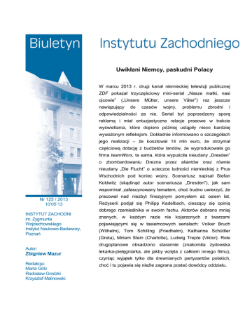 Uwikłani Niemcy, paskudni Polacy W marcu 2013 r. drugi kanał niemieckiej telewizji publicznej ZDF pokazał trzyczęściowy mini-serial „Nasze matki, nasi ojcowie” („Unsere nawiązujący do Mütter, czasów unsere Väter”) wojny, problemu raz jeszcze zbrodni i odpowiedzialności za nie. Serial był poprzedzony sporą reklamą i miał entuzjastyczne relacje prasowe w trakcie wyświetlania, które dopiero później ustąpiły nieco bardziej wyważonym refleksjom. Dokładnie informowano o szczegółach jego realizacji – że kosztował 14 mln euro, że otrzymał częściową dotację z budżetów landów, że wyprodukowała go firma teamWorx, ta sama, która wypuściła nieudany „Dresden” o zbombardowaniu Drezna przez aliantów oraz równie nieudany „Die Flucht” o ucieczce ludności niemieckiej z Prus Wschodnich pod koniec wojny. Scenariusz napisał Stefan Koldwitz (skądinąd autor scenariusza „Dresden”), jak sam wspominał ,zafascynowany tematem, choć trudno uwierzyć, że Nr 125 / 2013 10’05’13 INSTYTUT ZACHODNI im. Zygmunta Wojciechowskiego Instytut Naukowo-Badawczy, Poznań Autor: Zbigniew Mazur Redakcja: Marta Götz Radosław Grodzki Krzysztof Malinowski pracował nad niezbyt finezyjnym pomysłem aż osiem lat. Reżyserii podjął się Philipp Kadelbach, cieszący się opinią dobrego rzemieślnika w swoim fachu. Aktorów dobrano mniej znanych, w każdym razie nie kojarzonych z twarzami pojawiającymi się w tasiemcowych serialach: Volker Bruch (Wilhelm), Tom Schilling (Friedhelm), Katharina Schüttler (Greta), Miriam Stein (Charlotte), Ludwig Trepte (Viktor). Role drugoplanowe obsadzono starannie (znakomita żydowska lekarka-pielęgniarka, ale jakby wzięta z całkiem innego filmu), czyniąc wyjątek tylko dla drewnianych partyzantów polskich, choć i tu pojawia się nieźle zagrana postać dowódcy oddziału. Serial otoczono aurą niezwykle dokładnych studiów, jakie przeprowadzono, żeby obraz możliwie najbardziej przystawał do rzeczywistości historycznej. Aby to dodatkowo zaakcentować, fabułę wzbogacono czarno-białymi wstawkami dokumentacyjnymi z wojennych kronik filmowych, z tym że bez oryginalnego podkładu dźwiękowego. Obraz komentuje Wilhelm-narrator, zmieniając jego pierwotną triumfalistyczno-heroizującą wymowę na pesymistyczną refleksję o bezsensie wojny i nieuchronnie zbliżającej się klęsce. Jeszcze ważniejszą rolę spełniają dokumentalne dodatki, wyświetlone bezpośrednio po emisji dwóch odcinków. Dostarczają one swego rodzaju uwiarygodnienia wydarzeniom opowiedzianym w filmie, ukazują szerzej tło historyczne akcji filmowej, wzbogacają warstwę informacyjną i interpretacyjną. Występują w nich świadkowie historii, których losy były zbliżone do perypetii bohaterów serialu: niemiecki Żyd, który przeżył wojnę w ukryciu, żołnierz, który brał udział w kampanii przeciwko Związkowi Sowieckiemu, dezerter niemiecki skazany na batalion karny, pielęgniarka niemiecka i rosyjska, i naturalnie „wypędzony”. Mimo że w serialu wątek polski jest dość rozbudowany, nie pojawiają się w tym miejscu ani relacje, ani fotografie dotyczące podziemia polskiego. Owszem, wykorzystano zdjęcia z getta warszawskiego oraz nagranie rozmowy z jednym z braci Bielskich, którzy w czasie wojny utworzyli leśne zgrupowanie uciekinierów żydowskich. Wśród licznych instytucji, z których zaczerpnięto materiał dokumentacyjny, nie znalazła się ani jedna polska, również żaden historyk-konsultant serialu nie miał rozeznania w sprawach polskich. Akcja filmu rozgrywa się od momentu agresji na Związek Sowiecki do klęski Niemiec (1941-1945), równolegle na froncie wschodnim i w Berlinie. W jednym i drugim przypadku bieg wydarzeń zmierza w tym samym kierunku. Zaczyna się optymistycznie, w niemal beztroskim przekonaniu, że zwycięstwo jest w zasięgu ręki, potem przychodzi rozczarowanie, niepowodzenia na wschodzie i prześladowania w kraju, i na koniec wielowymiarowa klęska oraz ostatnie podrygi hitlerowskiego terroru. Niemiecki atak na Związek Sowiecki jest potraktowany jako moment przełomowy, uruchamiający lawinę zbrodni i katastrofę niemiecką. Odtąd wszystko wygląda „inaczej”, co akcentuje nie tylko narracja Wilhelma, ale również tytuły kolejnych odcinków: nadchodzą „inne czasy” („Eine andere Zeit”), toczy się „inna wojna” („Ein anderer Krieg”) i wyłania się „inny kraj” („Ein anderes Land”). To naturalnie prawda, że w 1941 r. zmieniło się położenie strategiczne Niemiec wraz z agresją na Związek Sowiecki i kilka miesięcy później wypowiedzeniem wojny Stanom Zjednoczonym. To również prawda, że wojna na wschodzie była inna niż na zachodzie, że uruchomiła masową eksterminację fizyczną ludności żydowskiej i nie mniej masową zagładę Biuletyn Instytutu Zachodniego • www.iz.poznan.pl 2 jeńców sowieckich, co w serialu zamarkowano, a dokładnie potraktowano w dwóch produkcjach dokumentalnych. W zasadzie nie ukrywa się aktywnego udziału lub współudziału Wehrmachtu w zbrodniach, co należy zaliczyć na plus całego przedsięwzięcia. Ale jednocześnie pojawia się niepokojące wrażenie chronologicznego skrótu tego, co najgorsze w historii niemieckiej, wyciszenia momentów, kiedy „inne” zwyciężało w Niemczech (1933 r.) i rozpoczynało podbój Europy (1939 r.). Jeśli dopiero w 1941 r. zaczęło być „inaczej”, to wcześniej było „normalnie”? Zdają się to potwierdzać główne postaci serialu, w założeniu paradygmatyczne dla indywidualnych losów pokolenia urodzonego na początku lat dwudziestych. Richard Herzinger słusznie zauważył, że serial nie tylko stwarza wrażenie, że wojna zaczęła się w 1941 r., ale również, że spora część społeczeństwa (piątka głównych bohaterów) pozostała impregnowana na osiem lat nazistowskiej indoktrynacji i zmasowanej propagandy antysemickieji. Wilhelm, porucznik Wehrmachtu,
