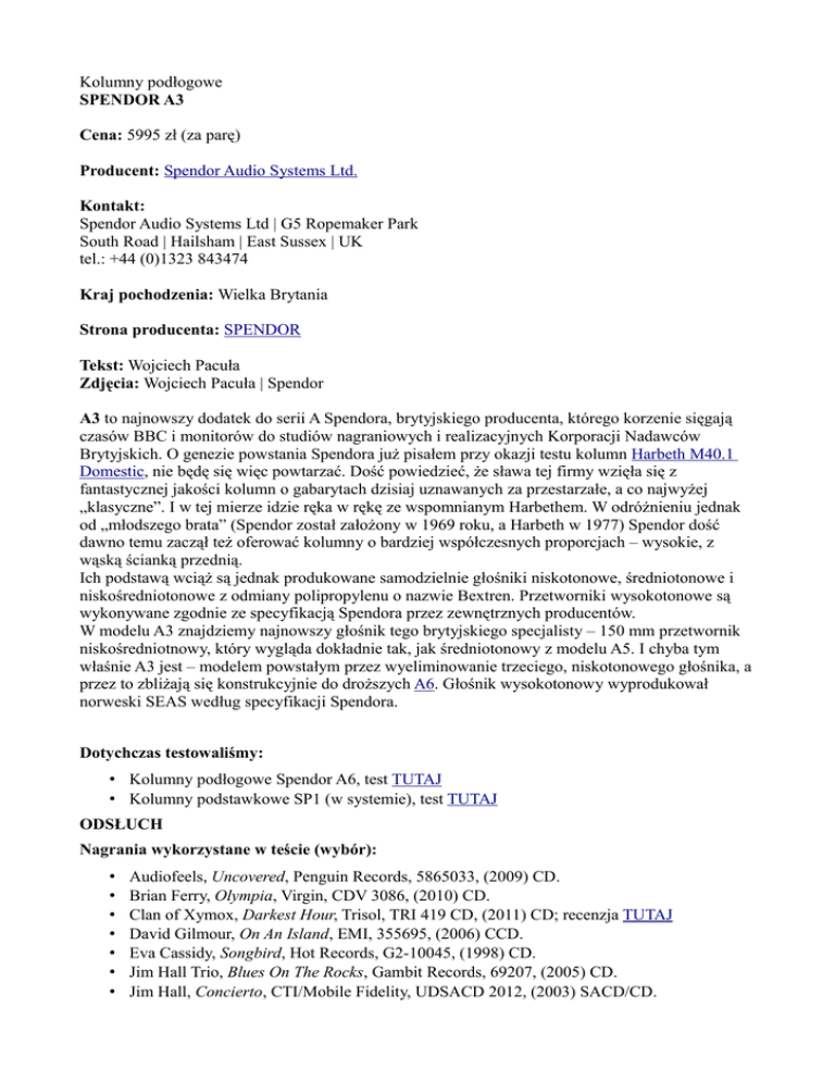 Kolumny podłogowe SPENDOR A3 Cena: 5995 zł (za parę) Producent: Spendor Audio Systems Ltd. Kontakt: Spendor Audio Systems Ltd | G5 Ropemaker Park South Road | Hailsham | East Sussex | UK tel.: +44 (0)1323 843474 Kraj pochodzenia: Wielka Brytania Strona producenta: SPENDOR Tekst: Wojciech Pacuła Zdjęcia: Wojciech Pacuła | Spendor A3 to najnowszy dodatek do serii A Spendora, brytyjskiego producenta, którego korzenie sięgają czasów BBC i monitorów do studiów nagraniowych i realizacyjnych Korporacji Nadawców Brytyjskich. O genezie powstania Spendora już pisałem przy okazji testu kolumn Harbeth M40.1 Domestic, nie będę się więc powtarzać. Dość powiedzieć, że sława tej firmy wzięła się z fantastycznej jakości kolumn o gabarytach dzisiaj uznawanych za przestarzałe, a co najwyżej „klasyczne”. I w tej mierze idzie ręka w rękę ze wspomnianym Harbethem. W odróżnieniu jednak od „młodszego brata” (Spendor został założony w 1969 roku, a Harbeth w 1977) Spendor dość dawno temu zaczął też oferować kolumny o bardziej współczesnych proporcjach – wysokie, z wąską ścianką przednią. Ich podstawą wciąż są jednak produkowane samodzielnie głośniki niskotonowe, średniotonowe i niskośredniotonowe z odmiany polipropylenu o nazwie Bextren. Przetworniki wysokotonowe są wykonywane zgodnie ze specyfikacją Spendora przez zewnętrznych producentów. W modelu A3 znajdziemy najnowszy głośnik tego brytyjskiego specjalisty – 150 mm przetwornik niskośredniotnowy, który wygląda dokładnie tak, jak średniotonowy z modelu A5. I chyba tym właśnie A3 jest – modelem powstałym przez wyeliminowanie trzeciego, niskotonowego głośnika, a przez to zbliżają się konstrukcyjnie do droższych A6. Głośnik wysokotonowy wyprodukował norweski SEAS według specyfikacji Spendora. Dotychczas testowaliśmy: • Kolumny podłogowe Spendor A6, test TUTAJ • Kolumny podstawkowe SP1 (w systemie), test TUTAJ ODSŁUCH Nagrania wykorzystane w teście (wybór): • • • • • • • Audiofeels, Uncovered, Penguin Records, 5865033, (2009) CD. Brian Ferry, Olympia, Virgin, CDV 3086, (2010) CD. Clan of Xymox, Darkest Hour, Trisol, TRI 419 CD, (2011) CD; recenzja TUTAJ David Gilmour, On An Island, EMI, 355695, (2006) CCD. Eva Cassidy, Songbird, Hot Records, G2-10045, (1998) CD. Jim Hall Trio, Blues On The Rocks, Gambit Records, 69207, (2005) CD. Jim Hall, Concierto, CTI/Mobile Fidelity, UDSACD 2012, (2003) SACD/CD. • Keith Jarrett, The Köln Concert, ECM/Universal Music Japan, UCCE-9011, (2007) goldCD. • Lisa Ekdahl, Give Me That Slow Knowing Smile, RCA/Sony Music, 46663-2, (2009) Opendisc. • Pat Martino, East!, Prestige/Mobile Fidelity, UDSACD 2018, (2006) SACD/CD. • Pink Floyd, The Wall, EMI Records/EMI Music Japan, TOCP-71142-43, (2011) 2 x CD. • The Dave Brubeck Quartet, Time Out, Columbia/Sony Music/Sony Entertainment Hong Kong, 8835321, No. 0055, (2011) K2HD CD. • Yes, Fragile, Atlantic/Mobile Fidelity, UDCD 766, (2006) gold-CD. Japońskie wersje płyt dostępne na CD Japan. Akt ustawienia A3 koło moich Harbethów równoważny był z ustawieniem koło siebie Adama Małysza i któregoś z braci Kliczków. Mimo że znamy zalety każdego z nich, wiemy, że „robią” w trochę innej branży (choć w pokrewnych) nie można przejść obojętnie koło rażącej dysproporcji w ich gabarytach. Tak jest i w przypadku testowanych kolumn. Kiedy jednak zagramy jakąkolwiek płytę, jakikolwiek utwór, to będziemy wiedzieli, że choć na zewnątrz się różnią, to w środku są tacy sami: to twardzi, walczący do końca zawodnicy. I mówią tym samym językiem. Najogólniej można bowiem powiedzieć, że A3 Spendora gra w nieco ciepły, bardzo naturalny sposób. Jego rozmiary wykluczają budowanie równie dużego wolumenu instrumentów, co z Harbethami i co do tego nie powinno być żadnych wątpliwości. Tyle tylko, że sposób traktowania sygnału, wybory dokonane przez konstruktorów sprawiają, że dźwięk, jaki się dobywa z A3 jest sporo większy niż innych kolumn tych rozmiarów. To dla mnie bardzo istotny element, ponieważ bardzo, ale to bardzo denerwuje mnie mały, cienki, pudełkowy obraz dźwiękowy. Dobra realizacja tego elementu to dla mnie wyznacznik tego, że dana konstrukcja w ogóle nadaje się do słuchania muzyki. Jak mówię, A3 grają trochę ciepło. Dzieje się to nieco inaczej niż zwykle, tj. góra nie jest jakoś specjalnie wycofana, ani też dolny środek nie jest podbarwiony, nie jest wypchnięty itp. Tutaj jest to funkcją nasyconego, gęstego środka. Ponownie można by więc powiedzieć, że Spendor gra jak Harbeth, tj. jego dźwięk promuje głosy ludzkie. Oczywiście – to w dużej mierze będzie prawda, trudno oczekiwać, żeby koń nagle zaczął latać. Ale w tym przypadku wcale nie jest tak, że siadamy i mówimy: „ale ciepło!” Dochodzimy do tego powoli, po przesłuchaniu sporej ilości płyt. I ciepło, i wolumen przejawiają się przede wszystkim w dobrym skalowaniu nagrań. Duże składy, duże przedsięwzięcia będą pokazywane z rozmachem. Małe – bardzo intymnie. Pięknie pokazane to było przy nowym remasterze płyty The Wall Pink Floyd, który sam z siebie niebywale pozytywnie zaskakuje i daj nadzieję na przyszłość; szczególnie po porażce zwanej remasterem dyskografii Johna Lennona i dyskusyjnym remasterze dyskografii The Beatles. W każdym razie, Spendory dobrze, precyzyjnie, zmysłowo przekazały detale około muzyczne wpisane w ten album. Głos Watersa był ciepły, spory, ale pozostało w nim lekkie echo mocniejszych sybilantów, które znam ze wszystkich wydań Pink Floyd i które są najwyraźniej częścią samej rejestracji. A to oznacza, że A3 wcale nie gubią detali, nie zacierają szczegółów. Oczywiście – środek, głównie wyższy, nie jest tak rozdzielczy jak z głośników ceramicznych, metalowych, a nawet niektórych papierowych – to ostatecznie polipropylen i bast