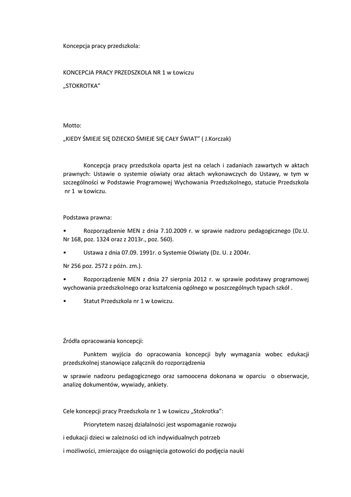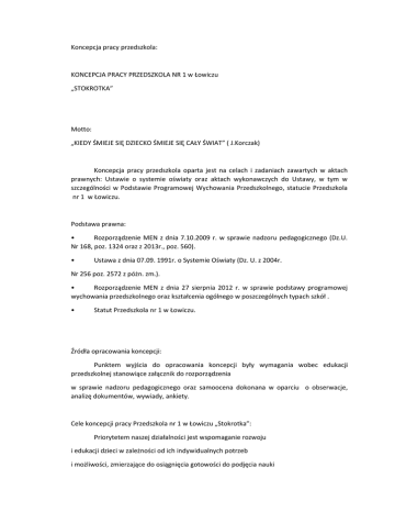Koncepcja pracy przedszkola: KONCEPCJA PRACY PRZEDSZKOLA NR 1 w Łowiczu „STOKROTKA” Motto: „KIEDY ŚMIEJE SIĘ DZIECKO ŚMIEJE SIĘ CAŁY ŚWIAT” ( J.Korczak) Koncepcja pracy przedszkola oparta jest na celach i zadaniach zawartych w aktach prawnych: Ustawie o systemie oświaty oraz aktach wykonawczych do Ustawy, w tym w szczególności w Podstawie Programowej Wychowania Przedszkolnego, statucie Przedszkola nr 1 w Łowiczu. Podstawa prawna: • Rozporządzenie MEN z dnia 7.10.2009 r. w sprawie nadzoru pedagogicznego (Dz.U. Nr 168, poz. 1324 oraz z 2013r., poz. 560). • Ustawa z dnia 07.09. 1991r. o Systemie Oświaty (Dz. U. z 2004r. Nr 256 poz. 2572 z póżn. zm.). • Rozporządzenie MEN z dnia 27 sierpnia 2012 r. w sprawie podstawy programowej wychowania przedszkolnego oraz kształcenia ogólnego w poszczególnych typach szkół . • Statut Przedszkola nr 1 w Łowiczu. Źródła opracowania koncepcji: Punktem wyjścia do opracowania koncepcji były wymagania wobec edukacji przedszkolnej stanowiące załącznik do rozporządzenia w sprawie nadzoru pedagogicznego oraz samoocena dokonana w oparciu o obserwacje, analizę dokumentów, wywiady, ankiety. Cele koncepcji pracy Przedszkola nr 1 w Łowiczu „Stokrotka”: Priorytetem naszej działalności jest wspomaganie rozwoju i edukacji dzieci w zależności od ich indywidualnych potrzeb i możliwości, zmierzające do osiągnięcia gotowości do podjęcia nauki w szkole podstawowej; zapewnienie naszym wychowankom wszechstronnego rozwoju, bezpieczeństwa, akceptacji i poszanowania ich praw; doskonalenie jakości pracy przedszkola przez ścisłą współpracę z rodzicami, specjalistami i środowiskiem lokalnym, poszukiwanie nowatorskich metod pracy z dziećmi, rozwój zawodowy nauczycieli, wzbogacanie bazy. WIZJA PRZEDSZKOLA Nasze Przedszkole “Stokrotka” jest placówką nastawioną na szeroko rozumiany rozwój dziecka, tak aby poznało radość płynącą z zabawy, nauczyło się nawiązywać relacje z innymi dziećmi, z przyjemnością odkrywało i rozumiało otaczający go świat, nauczyło się samodzielności, zasad bezpieczeństwa oraz radzenia sobie z trudnościami, poznało nowe doświadczenia i odnosiło sukcesy. Każdemu dziecku stwarzamy szansę na miarę jego możliwości . Dążymy do tego , aby nasi wychowankowie osiągnęli gotowość szkolną i odnosili sukcesy w szkole. Dbamy o potrzeby dzieci i rodziców. Rodzice są partnerami uczestniczącymi w życiu przedszkola. Przedszkole jest placówką przyjazną, innowacyjną, uwzględnia w swoich działaniach potrzeby środowiska.. Atmosfera sprzyja akceptacji każdego dziecka, przeciwdziała izolacji społecznej i nietolerancji wobec wszelkich „inności”. Zatrudnia wykwalifikowaną, kompetentną, zaangażowaną i odpowiedzialną kadrę pedagogiczna. Przedszkole stwarza dzieciom możliwość samorealizacji, kreatywnego myślenia, działania i przeżywania, uczestniczenia w ciekawych zajęciach, poznawania otaczającej rzeczywistości z zachowaniem wartości uniwersalnych: dobra, prawdy i piękna. Wszyscy przestrzegają praw dziecka, dbają o dobre stosunki międzyludzkie i skuteczną komunikacje interpersonalną. Przedszkole promuje swoje osiągnięcia w środowisku lokalnym. MISJA PRZEDSZKOLA Nasze Przedszkole: 1.Zapewnia dzieciom opiekę oraz bezpieczeństwo psychiczne i fizyczne. 2.Wspiera działania wychowawcze i edukacyjne rodziców. 3.Tworzy warunki do nabywania przez dziecko umiejętności zgodnie z jego możliwościami rozwojowymi. 4.Kieruje się zasadami wynikającymi z Konwencji Praw Dziecka oraz powszechnie przyjętymi normami społecznymi i moralnymi. 5.Organizuje sprawne funkcjonowanie organów przedszkola i zarzadzania placówką. 6.Analizuje i ocenia efekty swojej pracy, a uzyskane wyniki wykorzystuje do ciągłego doskonalenia się. 7. Tworzymy warunki do harmonijnego rozwoju , do bycia samodzielnym , i otwartym na nowe doświadczenia. O NASZEJ PLACÓWCE Przedszkole zlokalizowane jest w centrum miasta. Mieści się w wolno stojącym, dużym, jednopiętrowym budynku. Ogród przedszkolny jest duży zielony oraz wyposażony jest w sprzęt do zajęć i zabaw ruchowych. Dzieci uczęszczające do przedszkola zamieszkują głównie okolice przedszkola. W przedszkolu funkcjonuje 6 grup, mieszanych wiekowo (dzieci 3,4,5, 6, 5-6 letnie), Przedszkole stwarza możliwości uczęszczania do niej dzieci ze specjalnymi potrzebami żywieniowymi oraz dzieci obcokrajowców. Przedszkole zatrudnia 26pracowników, w tym 16 nauczycieli (w tym dyrektor ,logopeda , psycholog) i 10 pracowników administracji i obsługi. BAZA PRZEDSZKOLA Placówka posiada 6 sal dydaktycznych (wyposażonych w atestowane, nowoczesne meble dostosowane do wzrostu dzieci i do właściwego ułożenia na nich pomocy). Mała sala do prowadzenia zajęć logopedycznych, , pracy indywidualnej. Ogród przedszkolny bogaty w różnorodne krzewy i drzewa, wyposażony w przyrządy do ćwiczeń i zabaw na świeżym powietrzu. Zaplecze kuchenne, sanitarne i administracyjne Wszystkie sale przedszkolne posiadają zestawy pomocy dydaktycznych, gier, planszy, zabawek, klocków i innych. W salach zorganizowane są kąciki tematyczne i stałe, np. kącik do obserwacji przyrodniczych, kącik czytelniczy itp. WARUNKI PRACY Nasze przedszkole jest kolorowe i bajeczne. Ciągle doskonalimy swoją bazę lokalową. Sale wyposażone są w nowoczesny sprzęt, meble, pomoce dydaktyczne i bezpieczne zabawki. Nasz plac zabaw zaspokaja potrzeby ruchowe dzieci na świeżym powietrzu kolorowe i bezpieczne urządzenia rekreacyjne zachęcają do zabawy. Dzięki skutecznej promocji nasze przedszkole ma dobra opinię w środowisku lokalnym. Dobra baza, wyposażenie, estetyka pomieszczeń i otoczenia dopełnia działania dydaktyczno wychowawcze i wpływa na wysoką ocenę. Placówka inwestuje w nauczycieli, pracowników, bazę lokalową, a zyskują na tym przede wszystkim dzieci. Przedszkole jest zarządzane w sposób sprawny i nowocze