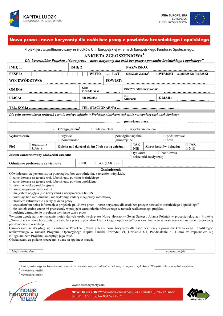 ANKIETA ZGŁOSZENIOWA1 Dla Uczestników Projektu „Nowa praca – nowe horyzonty dla osób bez pracy z powiatów kraśnickiego i opolskiego” IMIĘ 1: ……………………. IMIĘ 2: PESEL: WOJEWÓDZTWO: GMINA: ULICA: …………………….. WIEK: …. LAT …………………..………………… KOD POCZTOWY: …………………………….. POWIAT: … - …… NR DOMU: …………………………………… TEL. KOM.: ........................................................ …… NAZWISKO: ………………………………………. OBSZAR ZAM.:2 1.WIEJSKI 2. MIEJSKO-WIEJSKI ……………………………………………………… POCZTA/MIEJSCOWOŚĆ: NR MIESZK.: ………………………………. E-MAIL: …... ……………………….. TEL. STACJONARNY: ………………………………………………. Dla celu ewentualnych rozliczeń z tytułu mojego udziału w Projekcie niniejszym wskazuje następujący rachunek bankowy ………………………………..………………………………………………….…………..... …………………………...……..…., którego jestem3 1. właścicielem prowadzony przez ………………………………….……………………. 2. współwłaścicielem ponadgimnazjalne podstawowe gimnazjalne brak TAK TAK męŜczyzna Płeć Opieka nad dziećmi do lat 7 lub osobą zaleŜną: Zwrot kosztów dojazdu: kobieta NIE NIE tynkarza handlowca Jestem zainteresowany zdobyciem zawodu: sekretarki medycznej Wykształcenie wyŜsze pomaturalne Odmienne preferencje Ŝywieniowe: NIE TAK (JAKIE?) ……………………………………………………………. Oświadczenia Oświadczam, Ŝe jestem osobą pozostającą bez zatrudnienia, z terenów wiejskich, zameldowaną na terenie woj. lubelskiego, powiatu kraśnickiego zameldowaną na terenie woj. lubelskiego, powiatu opolskiego jestem w wieku produkcyjnym posiadam prawo jazdy kat. B nie jestem objęty/a (nie korzystam) z ubezpieczenia KRUS pozostaję bez zatrudnienia i nie wykonuję Ŝadnej innej pracy zarobkowej utraciłem zatrudnienie z winy zakładu pracy uzyskałem/am pełną informację o projekcie pt. „Nowa praca – nowe horyzonty dla osób bez pracy z powiatów kraśnickiego i opolskiego” nie istnieją Ŝadne znane mi przeszkody w podjęciu zatrudnienia oferowanego w ramach realizowanego projektu podejmę zatrudnienie w pełnym wymiarze czasu pracy WyraŜam zgodę na przetwarzanie moich danych osobowych przez Nowe Horyzonty Świat Sukcesu Jolanta Poźniak w procesie rekrutacji Projektu „Nowa praca – nowe horyzonty dla osób bez pracy z powiatów kraśnickiego i opolskiego” oraz ewentualnego umieszczenia ich na liście rezerwowej po zakończeniu rekrutacji. Oświadczam, Ŝe decyduję się na udział w Projekcie „Nowa praca – nowe horyzonty dla osób bez pracy z powiatów kraśnickiego i opolskiego” realizowanego w ramach Programu Operacyjnego Kapitał Ludzki, Priorytet VI, Działanie 6.1, Poddziałanie 6.1.1 oraz Ŝe zapoznałem się z Regulaminem Projektu i akceptuję jego treść. Oświadczam, Ŝe podane przeze mnie dane są zgodne z prawdą. ___________________ Miejscowość, data 1 2 3 ______________________ czytelny podpis Ankietę moŜna wypełnić komputerowo, odręcznie literami drukowanymi; podpisać we wskazanych miejscach; wydrukować. Wszystkie pola powinny być wypełnione. Niewłaściwe skreślić. Niewłaściwe skreślić. Tynkarz: Handlowiec: Nauczysz się: Nauczysz się: • wykonywania mechanicznego i ręcznego tynków róŜnych kategorii na róŜnorodnych podłoŜach • obsługi maszyn i urządzeń do robót tynkarskich • zasad pracy na budowie • skutecznych technik sprzedaŜy • prowadzenia efektywnych rozmów handlowych z analizą potrzeb klientów • budowania relacji i prezentowania korzyści dla klienta • technik poszukiwania klientów • elementów negocjacji handlowych Po odbyciu szkolenia otrzymasz pracę w firmie budowlanej lub innej o podobnym charakterze. Po odbyciu szkolenia otrzymasz pracę w firmie na stanowisku handlowca/sprzedawcy lub innej o podobnym charakterze. Sekretarka medyczna: Nauczysz się: • sprawnego posługiwania podstawowymi programami pakietu biurowego MS Office • poruszania w zakresie oprogramowania medycznego - m.in. zasady rejestracji, tworzenie kartotek • organizacji pracy nowoczesnego sekretariatu – obsługa podstawowych urządzeń biurowych, tworzenie dokumentacji słuŜbowej oraz korespondencji • zasad profesjonalnej obsługi klienta • sposobów na odzyskanie zaufania niezadowolonego interesanta • przedstawienia swoich racji w sposób precyzyjny i taktowny • organizowania efektywnych spotkań, zebrań itp. • pozytywnego oddziaływania na słuchaczy • róŜnych wzorów prezentacji • prawnych aspektów funkcjonowania placówki medycznej Po odbyciu szkolenia otrzymasz pracę w placówce medycznej lub innej o podobnym charakterze. Wpisz w luki poniŜej szkolenie zawodowe, które najbardziej Cię interesuje oraz Twój drugi wybór w przypadku braku miejsc. Pierwszy wybór: ……………………………………………. Drugi wybór: ………………………………………………... ___________________ Miejscowość, data ____________________ czytelny podpis