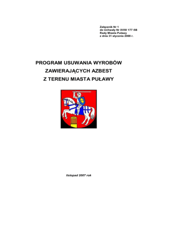 Załącznik Nr 1 do Uchwały Nr XVIII/ 177 /08 Rady Miasta Puławy z dnia 31 stycznia 2008 r. PROGRAM USUWANIA WYROBÓW ZAWIERAJĄCYCH AZBEST Z TERENU MIASTA PUŁAWY listopad 2007 rok PROGRAM USUWANIA WYROBÓW ZAWIERAJĄCYCH AZBEST Z TERENU MIASTA PUŁAWY spis treści 1. WSTĘP 3 1.1. W PROWADZENIE 3 1.2. OGÓLNA CHARAKTERYSTYKA MIASTA PUŁAWY 4 1.3. CEL I ZADANIA „PROGRAMU USUWANIA WYROBÓW ZAWIERAJĄCYCH AZBEST NA OBSZARZE MIASTA PUŁAWY” 5 1.4. KONCEPCJA ZARZĄDZANIA „PROGRAMEM USUWANIA WYROBÓW ZAWIERAJĄCYCH AZBEST NA OBSZARZE MIASTA PUŁAWY” 6 1.5. OPIS ZAWARTOŚCI DOKUMENTU „PROGRAMU...” 8 2. CHARAKTERYSTYKA WYROBÓW ZAWIERAJĄCYCH AZBEST I ODDZIAŁYWANIE AZBESTU NA ZDROWIE CZŁOWIEKA 9 2.1. W YSTĘPOWANIE I ZASTOSOWANIE AZBESTU 9 2.2. W PŁYW AZBESTU NA ORGANIZM LUDZKI 11 2.3. INFORMOWANIE O RYZYKU ZWIĄZANYM Z NARAśENIEM NA AZBEST WYSTĘPUJĄCY W ŚRODOWISKU 12 2.4. OGRANICZENIE NEGATYWNYCH SKUTKÓW ODDZIAŁYWANIA AZBESTU 12 3. STAN PRAWNY W ZAKRESIE UśYTKOWANIA I USUWANIA WYROBÓW I ODPADÓW ZAWIERAJĄCYCH AZBEST 13 3.1. REGULACJE USTAWOWE 13 3.2. AKTY WYKONAWCZE 14 3.3. ZASADY POSTĘPOWANIA Z WYROBAMI ZAWIERAJĄCYMI AZBEST W ASPEKCIE OBOWIĄZUJĄCEGO PRAWA 16 3.4. OBOWIĄZKI WŁAŚCICIELI I ZARZĄDZAJĄCYCH OBIEKTAMI, INSTALACJAMI 16 3.5. OBOWIĄZKI WYKONAWCY PRAC POLEGAJĄCYCH NA USUWANIU 19 4. ZADANIA JEDNOSTEK SAMORZĄDU TERYTORIALNEGO 31 4.1. „PROGRAM USUWANIA AZBESTU I WYROBÓW ZAWIERAJĄCYCH AZBEST 31 4.4. PROGRAM ZRÓWNOWAśONEGO ROZWOJU I OCHRONY ŚRODOWISKA DLA MIASTA PUŁAWY 35 5. HARMONOGRAM REALIZACJI „PROGRAMU USUWANIA WYROBÓW 36 ZAWIERAJĄCYCH AZBEST Z TERENU MIASTA PUŁAWY” 6. ODBIORCY ODPADÓW, KTÓRZY POSIADAJĄ DECYZJE ZATWIERDZAJĄCE PROGRAM GOSPODARKI ODPADAMI NIEBEZPIECZNYMI ZAWIERAJĄCYMI AZBEST I SĄ UPRAWNIENI DO PRZEPROWADZANIA PRAC ROZBIÓRKOWYCH ZWIĄZANYCH Z USUWANIEM AZBESTU NA TERENIE MIASTA PUŁAWY. 38 7. OSZACOWANIE KOSZTÓW USUWANIA WYROBÓW ZAWIERAJĄCYCH AZBEST Z TERENU MIASTA PUŁAWY 39 8. MOśLIWOŚCI POZYSKANIA ŚRODKÓW FINANSOWYCH NA DZIAŁANIA ZWIĄZANE Z USUWANIEM AZBESTU Z TERENU MIASTA PUŁAWY ORAZ SKŁADOWANIEM ODPADÓW ZAWIERAJĄCYCH AZBEST 40 9. PODSUMOWANIE 43 10. LITERATURA 44 11. ZAŁĄCZNIKI 45 Załącznik nr 1 – Ocena stanu i moŜliwości bezpiecznego uŜytkowania wyrobów zawierających azbest. Załącznik nr 2 - Informacja o wyrobach zawierających azbest i miejscu ich wykorzystania. Załącznik nr 3 - Informacja o wyrobach zawierających azbest, wykorzystywanie zostało zakończone. Załącznik nr 4 - Wzór oznakowania dla miejsc zawierających azbest lub wyroby zawierające azbest. Załącznik nr 5 - Wzór " Karty Ewidencji Odpadu". Załącznik nr 6 - Wzór " Karty Przekazania Odpadu". Załącznik nr 7 - Zgłoszenie przystąpienia do prac polegających na zabezpieczeniu/usunięciu* wyrobów zawierających azbest. Załącznik nr 8 - Nazwy wyrobów azbestowych i kody odpowiadających im odpadów wraz z przelicznikami. 2007 rok 2 PROGRAM USUWANIA WYROBÓW ZAWIERAJĄCYCH AZBEST Z TERENU MIASTA PUŁAWY 1. WSTĘP 1.1. Wprowadzenie Niniejszy „Program usuwania wyrobów zawierających azbest z terenu Miasta Puławy” opracowano dla potrzeb Miasta Puławy. Celem Programu jest wybór i wskazanie optymalnej drogi postępowania w zakresie gospodarki odpadem niebezpiecznym, jakim jest azbest, występujący na terenie Miasta Puławy. Przedstawione cele i działania są zgodne z obowiązującym ustawodawstwem oraz kierunkami działań i celami określonymi w programach róŜnych szczebli (krajowym, wojewódzkim). W niniejszym Programie, w oparciu o wyniki analiz stanu istniejącego i prognozowanych zmian, opracowano program działań i wytyczono cele oraz zadania strategiczne (z podaniem harmonogramów realizacji i określeniem kosztów eksploatacyjnych systemu oraz kosztów inwestycyjnych zadań). Realizacja tych działań, umoŜliwi spełnienie obowiązujących i przewidywanych wymogów prawnych, uporządkowanie i scentralizowanie gospodarki odpadem niebezpiecznym jakim jest azbest, oraz poprawę jakości środowiska na terenie miasta. Azbest znany jest od kilku tysięcy lat. Szerokie jego zastosowanie w stosunkowo duŜych ilościach nastąpiło w okresie ostatnich 100 lat. Z uwagi na swoje niewątpliwe zalety, jak odporność na wysokie temperatury, na działanie mrozu, na działanie kwasów, elastyczność, dobre właściwości mechaniczne i małe przewodnictwo cieplne wykorzystywany był chętnie jako cenny surowiec równieŜ w Polsce. Azbest stosowany był w produkcji około 3000 wyrobów przemysłowych, lecz przede wszystkim (co najmniej około 85%) do produkcji wyrobów budowlanych, szczególnie płyt dachowych i elewacyjnych, a takŜe, w mniejszych ilościach do produkcji rur, rozmaitych kształtek do kanałów wentylacyjnych, instalacyjnych i innych. Produkcja płyt azbestowo cementowych na ziemiach polskich rozpoczęła się w 1907 roku i trwała do roku 1998 roku. W wyniku szerokiego zastosowania praktycznego materiały zawierające azbest naleŜą do substancji stwarzających szczególne zagroŜenie dla zdrowia ludzi i z tego powodu powinny podlegać sukcesywnej eliminacji. Odpady zawierające azbest naleŜą do odpadów niebezpiecznych a gospodarka nimi wymaga prawidłowego podejścia oraz szczególnej kontroli. Szczególne zasady postępowania z odpadami zawierającymi azbest reguluje szereg przepisów m.in. ustawa o zakazie stosowania azbestu, ustawa prawo ochrony środowiska, ustawa o odpadach oraz związane z nimi rozporządzenia wykonawcze. Ostatnia nowelizacja ustawy o zakazie stosowania azbestu z 22 grudnia 2004 roku. praktycznie zamknęła okres stosowania wyrobów zawierających azbest w Polsce. Do rozwiązania pozostaje natomiast – bardzo waŜny ze względu na zdrowie ludzi i stan środowiska – problem sukcesywnego usuwania zuŜytych wyrobów zawierających azbest. Groźne dla zdrowia są włókna respirabilne, wystarczająco drobne by przeniknąć głęboko do płuc. Włókna powstaj