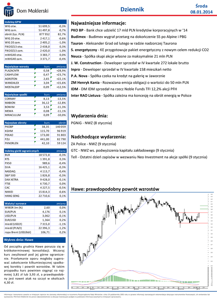 Środa 08.01.2014 Dziennik Indeksy GPW WIG otw. WIG zam. obrót (tys. PLN) WIG 20 otw. WIG 20 zam. FW20Z13 otw. FW20Z13 zam. mWIG40 otw. mWIG40 zam. 51 699,5 51 497,8 877 952 2 417,1 2 405,2 2 438,0 2 420,0 3 383,7 3 371,7 -0,3% -0,7% 82,7% -0,6% -1,0% 0,3% -1,0% 0,0% -0,4% Największe wzrosty PLAZACNTR CASHFLOW AGROTON WANDALEX MOSTALEXP kurs 0,58 0,47 2,65 3,04 0,09 zmiana +28,9% +23,7% +22,1% +15,6% +12,5% Największe spadki CORMAY MABION BOWIM MEWA MIRACULUM kurs 8,13 36,12 3,53 0,08 0,09 zmiana -13,5% -12,8% -11,3% -11,1% -10,0% Najwyższe obroty PKOBP KGHM PEKAO PZU PKNORLEN kurs 38,35 115,70 173,00 441,00 42,10 obrót 140 059 96 919 91 803 82 790 59 124 Indeksy giełd zagranicznych BUX 18 572,8 RTS 1 391,8 PX50 989,6 DJIA 16 425,1 NASDAQ 4 113,7 S&P 500 1 826,8 DAX XETRA 9 428,0 FTSE 6 730,7 CAC 4 227,5 NIKKEI 15 814,3 HANG SENG 22 710,6 zmiana -0,3% 0,3% -0,4% -0,3% -0,4% -0,3% -0,1% 0,0% -0,5% -0,6% 0,1% Najważniejsze informacje: PKO BP - Bank chce udzielić 17 mld PLN kredytów korporacyjnych w ‘14 Budimex - Budimex wygrał przetarg na dokończenie S5 po Alpine i PBG Tauron - Aleksander Grad od lutego w radzie nadzorczej Taurona S. energetyczny - KE przygotowuje pakiet energetyczny z nowym celem redukcji CO2 Neuca - Spółka skupi akcje własne za maksymalnie 21 mln PLN J. W. Construction - Deweloper sprzedał w IV kwartale 272 lokale brutto Inpro - Deweloper sprzedał w IV kwartale 158 mieszkań netto P.A. Nova - Spółka czeka na kredyt na galerię w Jaworznie ZM Henryk Kania - Rozważana emisja obligacji o wartości do 50 mln PLN IDM - DM IDM sprzedał na rzecz Noble Funds TFI 12,2% akcji PFH Inter RAO Lietuva - Spółka zależna ma koncesję na obrót energią w Polsce Wydarzenia dnia: PGNiG - NWZ (8 stycznia) Nadchodzące wydarzenia: ZA Police - NWZ (9 stycznia) GTC - NWZ ws. podwyższenia kapitału zakładowego (9 stycznia) Tell - Ostatni dzień zapisów w wezwaniu Neo Investment na akcje spółki (9 stycznia) Hawe: prawdopodobny powrót wzrostów 4.4 4.3 4.2 4.1 Waluty i surowce WIBOR 3m (%) EUR/PLN USD/PLN EUR/USD miedź (USD/t) miedź (PLN/t) ropa Brent (USD/bbl) 2,60 4,176 3,062 1,364 7 315,0 22 396,3 106,71 zmiana 0,0% 0,1% -0,1% 0,2% -1,1% -1,2% 0,2% 4.0 3.9 3.8 3.7 3.6 3.5 3.4 3.3 3.2 3.1 3.0 2.9 Wykres dnia: Hawe 2.8 2.7 Od początku grudnia Hawe porusza się w krótkoterminowej konsolidacji. Wczoraj kurs zwyżkował pod jej górne ograniczenie. Przełamanie oporu mogłoby sugerować zakończenie kilkumiesięcznej spadkowej korekty i powrót wzrostów. W takim przypadku kurs powinien sięgnąć co najmniej 3,81 zł lub 3,93 zł, a prawdopodobny jest nawet atak na szczyt w okolicach 4,30 zł. 2.6 2.5 2.4 2.3 2.2 50 45 40 35 30 25 20 15 10 5 0 -5 -10 -15 8 15 22 29 5 August 12 19 26 2 9 September 16 23 30 7 October 14 21 28 4 12 November 18 25 2 9 December 16 23 30 7 2014 13 Informacje i komentarze zawarte w niniejszym raporcie nie stanowią rekomendacji w rozumieniu Rozporządzenia Rady Ministrów z dnia 19 października 2005 roku w sprawie informacji stanowiących rekomendacje dotyczące instrumentów finansowych, ich emitentów lub wystawców. PKO Dom Maklerski nie ponosi odpowiedzialności za decyzje inwestycyjne podjęte na podstawie informacji zawartych w niniejszym opracowaniu. Dziennik Najważniejsze informacje PKO BP Bank chce udzielić 17 mld PLN kredytów korporacyjnych w ‘14 Jarosław Myjak, wiceprezes PKO BP, poinformował, że w ocenie banku w 2014 roku wolumen kredytów korporacyjnych PKO BP wzrośnie o 8%, czyli szybciej niż na rynku, gdzie wzrosnąć może o 6%. Oznaczałoby to, że bank udzieli do 17 mld PLN nowych kredytów dla przedsiębiorstw. Wiceprezes poinformował także, że bank liczy na stabilizację kosztów ryzyka w segmencie kredytów korporacyjnych w 2014 r. Dodał też, że bank oczekuje spadku udziału wzrostu wolumenu kredytów zagrożonych we wzroście wolumenu kredytów ogółem. Wiceprezes ocenił także, że przy zakładanym scenariuszu makroekonomicznym, w 2014 r. bank pozyska 2 tys. nowych klientów korporacyjnych. Budimex Budimex wygrał przetarg na dokończenie S5 po Alpine i PBG GDDKiA wybrała ofertę Budimeksu jako najkorzystniejszą w przetargu na dokończenie 29-kilometrowego odcinka drogi ekspresowej S5 Kaczkowo - Korzeńsko. Jego pierwotnym wykonawcą było konsorcjum Alpine Bau, PBG i Hydrobudowy Polska. Przy wyborze najkorzystniejszej oferty brano pod uwagę cenę (90%) oraz długość gwarancji jakości (10%). Najtańszą ofertę złożył Budimex, który wycenił swoje usługi na 244,52 mln PLN brutto przy siedmioletniej gwarancji. Dwie pozostałe oferty, które złożono w przetargu, należą do konsorcjum Strabag, Heilit+Woerner (276,11 mln PLN brutto oraz 10 lat gwarancji), a także konsorcjum hiszpańskiego OHL i czeskiego OHL ZS (436,22 mln zł brutto oraz 5 lat gwarancji), przy czym oferta tego ostatniego została odrzucona przez GDDKiA. (P. Łopaciuk) Tauron Aleksander Grad od lutego w radzie nadzorczej Taurona NWZ Taurona podjęło uchwałę o powołaniu Aleksandra Grada do rady nadzorczej spółki. W RN spółki Grad zasiądzie z dniem 1 lutego. Od lipca 2012 roku Grad jest prezesem spółki PGE EJ 1, gdzie odpowiada za proces przygotowania i budowy pierwszej elektrowni jądrowej w Polsce. (S. Ozga) Sektor energetyczny KE przygotowuje pakiet klimatyczno-energetyczny z nowym celem redukcji CO2 Komisja Europejska 22 stycznia ma opublikować propozycję klimatycznej i energetycznej polityki UE do 2030 r., która ma zawierać co najmniej jeden nowy cel - redukcji emisji CO2. W tym samym dniu KE ma przedstawić także propozycję w sprawie gazu łupkowego i analizę cen energii w UE. (S. Ozga) Neuca Spółka skupi akcje własne za maksymalnie 21 mln PLN Neuca poinformowała w komunikacie, że akcjonariusze spółki uchwalili skup akcji własnych za łączną kwotę nie przekraczającą 21 mln PLN. Maksymalna cena nabycia akcji w ramach skupu została wyznaczona na 300 PLN. Upoważnienie zarządu do skup