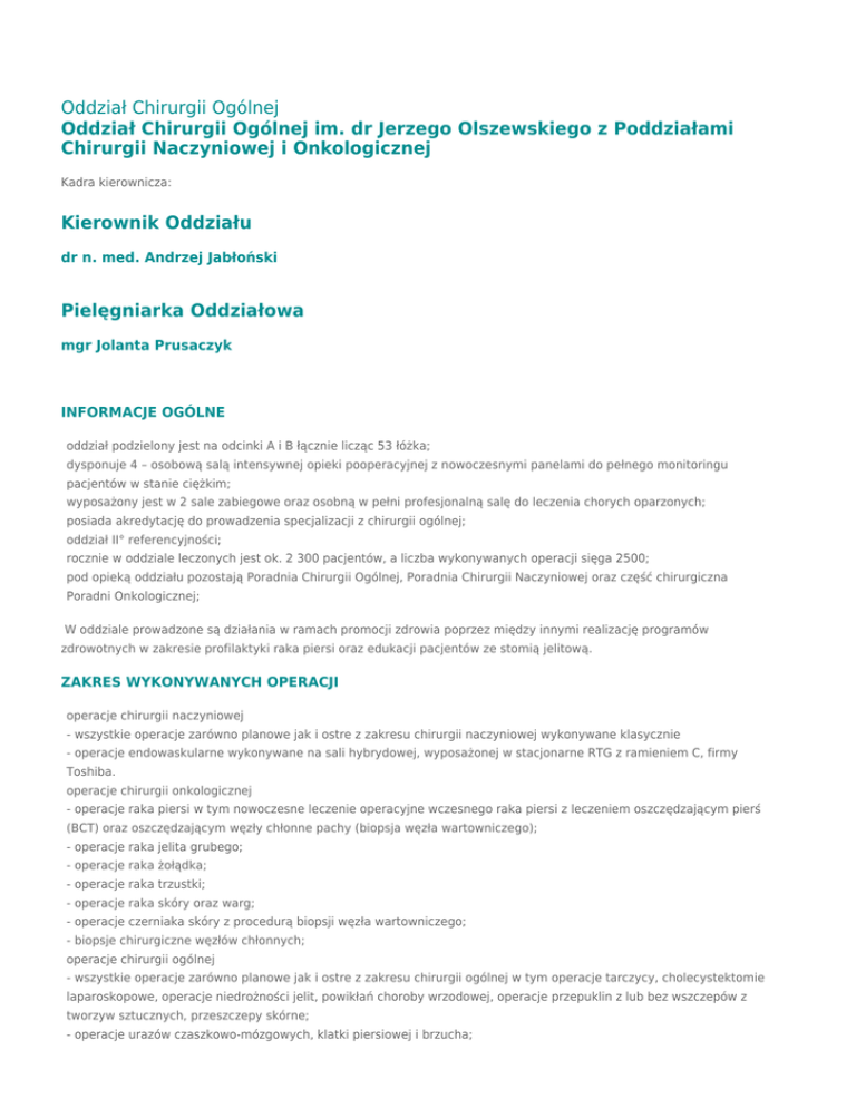 Oddział Chirurgii Ogólnej Oddział Chirurgii Ogólnej im. dr Jerzego Olszewskiego z Poddziałami Chirurgii Naczyniowej i Onkologicznej Kadra kierownicza: Kierownik Oddziału dr n. med. Andrzej Jabłoński Pielęgniarka Oddziałowa mgr Jolanta Prusaczyk INFORMACJE OGÓLNE oddział podzielony jest na odcinki A i B łącznie licząc 53 łóżka; dysponuje 4 – osobową salą intensywnej opieki pooperacyjnej z nowoczesnymi panelami do pełnego monitoringu pacjentów w stanie ciężkim; wyposażony jest w 2 sale zabiegowe oraz osobną w pełni profesjonalną salę do leczenia chorych oparzonych; posiada akredytację do prowadzenia specjalizacji z chirurgii ogólnej; oddział II° referencyjności; rocznie w oddziale leczonych jest ok. 2 300 pacjentów, a liczba wykonywanych operacji sięga 2500; pod opieką oddziału pozostają Poradnia Chirurgii Ogólnej, Poradnia Chirurgii Naczyniowej oraz część chirurgiczna Poradni Onkologicznej; W oddziale prowadzone są działania w ramach promocji zdrowia poprzez między innymi realizację programów zdrowotnych w zakresie profilaktyki raka piersi oraz edukacji pacjentów ze stomią jelitową. ZAKRES WYKONYWANYCH OPERACJI operacje chirurgii naczyniowej - wszystkie operacje zarówno planowe jak i ostre z zakresu chirurgii naczyniowej wykonywane klasycznie - operacje endowaskularne wykonywane na sali hybrydowej, wyposażonej w stacjonarne RTG z ramieniem C, firmy Toshiba. operacje chirurgii onkologicznej - operacje raka piersi w tym nowoczesne leczenie operacyjne wczesnego raka piersi z leczeniem oszczędzającym pierś (BCT) oraz oszczędzającym węzły chłonne pachy (biopsja węzła wartowniczego); - operacje raka jelita grubego; - operacje raka żołądka; - operacje raka trzustki; - operacje raka skóry oraz warg; - operacje czerniaka skóry z procedurą biopsji węzła wartowniczego; - biopsje chirurgiczne węzłów chłonnych; operacje chirurgii ogólnej - wszystkie operacje zarówno planowe jak i ostre z zakresu chirurgii ogólnej w tym operacje tarczycy, cholecystektomie laparoskopowe, operacje niedrożności jelit, powikłań choroby wrzodowej, operacje przepuklin z lub bez wszczepów z tworzyw sztucznych, przeszczepy skórne; - operacje urazów czaszkowo-mózgowych, klatki piersiowej i brzucha; - posiada duże doświadczenie w leczeniu ostrego zapalenia trzustki, żywienia pozajelitowego oraz leczenia oparzeń; PORADNIA CHIRURGII OGÓLNEJ zajmuje się diagnostyką i leczeniem chorób zakresu chirurgii ogólnej, kwalifikacją do leczenia operacyjnego oraz kontrolą pacjentów po operacjach; czynna jest od poniedziałku do środy oraz w piątek w godzinach 8.00 - 15.30; czwartek 8.00 - 18.00 PORADNIA CHIRURGII NACZYNIOWEJ zajmuje się diagnostyką i leczeniem schorzeń obwodowego układu naczyniowego, kwalifikacją do leczenia operacyjnego z zakresu chirurgii naczyniowej oraz kontrolą pacjentów po operacjach naczyniowych; czynna jest od wtorku do piątku w godzinach 7.30 – 16.00; w poniedziałek 7.30-18.00 PORADNIA ONKOLOGICZNA zajmuje się diagnostyką i leczeniem chorób zakresu chirurgii onkologicznej, kwalifikacją do leczenia operacyjnego oraz kontrolą pacjentów po operacjach; mieści się w MSS przy Al. Jana Pawła II 120A; czynna jest w różnych godzinach: poniedziałek 7.30-20.00, wtorek 7.30-14.00, środa 7.30-15.00, czwartek 10.00-14.00, piątek 7.30-15.35; KOMPLEKSOWE LECZENIE RAN PRZEWLEKŁYCH · zajmuje się objęciem pacjentów z ranami przewlekłymi (trudno gojącymi się), kompleksową opieką zapewniającą leczenie samej rany – ambulatoryjne lub szpitalne (operacyjne) w zależności od stanu klinicznego świadczeniobiorcy oraz koordynacją leczenia choroby wyjściowej, będącej pierwotną przyczyną rany. · do objęcia leczeniem w ramach świadczenia kwalifikuje się pacjenta z raną przewlekłą występującą ponad 6 tygodni bez postępu gojenia od pierwszej udokumentowanej wizyty u lekarza związanej z raną i rozpoczynającej proces leczenia.Wyjątek stanowi pacjent z raną rozpoznaną, w ramach zespołu stopy cukrzycowej od II stopnia w skali PEDIS występującą ponad 2 tygodnie bez postępu gojenia, od pierwszej udokumentowanej wizyty u lekarza związanej z raną i rozpoczynającej proces leczenia. · poradnia czynna jest w: poniedziałek 7.30-18.00, wtorek-piątku 7.30-16.00 PATRON Dr Jerzy Olszewski ukończył Akademię Medyczną w Białymstoku w roku 1971. Specjalizację z chirurgii ogólnej ukończył w roku 1980. W marcu 1999 obronił pracę doktorską pt. "Ocena wyników leczenia choroby wrzodowej resekcją sposobem Rydygiera-Zaorskiego przy zastosowaniu szwu dwu- i jednowarstwowego", uzyskując tytuł doktora nauk medycznych. Życiem zawodowym był w całości związany z ostrołęckim Szpitalem. Pracował początkowo pod okiem swego mistrza i zarazem przyjaciela, doktora Jędrzeja Gajdy. Następnie od 1983 roku jako ordynator Oddziału Chirurgicznego oraz Specjalista Wojewódzki ds. Chirurgii Ogólnej. Był również Przewodniczącym Komitetu Wojewódzkiego NFOZ w Ostrołęce. Zyskał uznanie jako bardzo zręczny operator, rozważny i dociekliwy chirurg. Wykształcił wielu specjalistów różnych dziedzin chirurgii. Był autorem 14 i współautorem 13 publikacji m.in. w Polskim Przeglądzie Chirurgicznym, Urologii Polskiej i Chirurgii Narządu Ruchu i Ortopedii Polskiej, a także autorem 10 i współautorem 18 referatów wygłoszonych na zjazdach i konferencjach naukowych w wielu miastach w Polsce. Wysoko cenię Jego umiejętność klinicznego rozumowania, dociekliwość i spostrzegawczość łączone z dobrze opanowaną techniką operacyjną, a także Jego walory osobiste: spokój, opanowanie, życzliwość okazywane zarówno chorym jak i współpracownikom.- prof. dr hab. A.Kawalski Odszedł od nas nagle w pełni sił Człowiek zdolny, uczciwy i prawy. Mój znakomity Uczeń i Przyjaciel. Zawsze spokojny i taktowny zyskał sobie szacunek kolegów, współpracowników i pacjentów. Odszedł od n