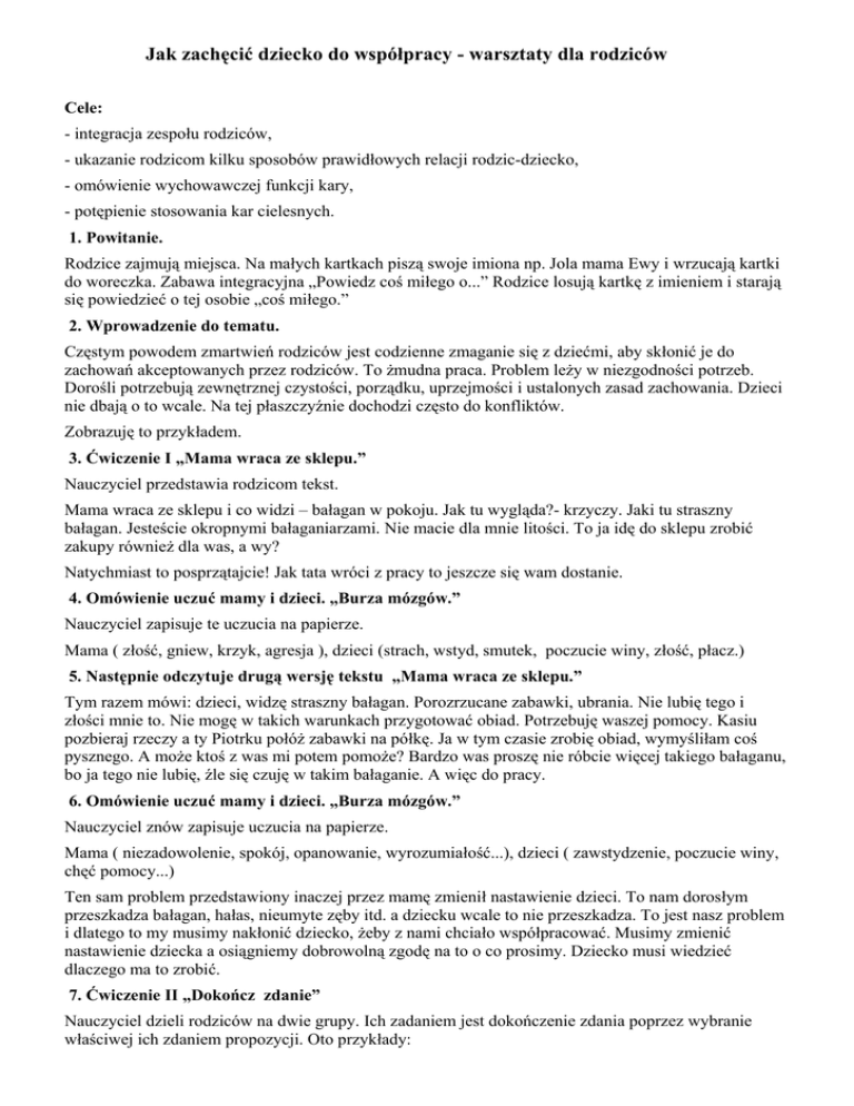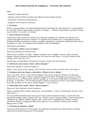 Jak zachęcić dziecko do współpracy - warsztaty dla rodziców Cele: - integracja zespołu rodziców, - ukazanie rodzicom kilku sposobów prawidłowych relacji rodzic-dziecko, - omówienie wychowawczej funkcji kary, - potępienie stosowania kar cielesnych. 1. Powitanie. Rodzice zajmują miejsca. Na małych kartkach piszą swoje imiona np. Jola mama Ewy i wrzucają kartki do woreczka. Zabawa integracyjna „Powiedz coś miłego o...” Rodzice losują kartkę z imieniem i starają się powiedzieć o tej osobie „coś miłego.” 2. Wprowadzenie do tematu. Częstym powodem zmartwień rodziców jest codzienne zmaganie się z dziećmi, aby skłonić je do zachowań akceptowanych przez rodziców. To żmudna praca. Problem leży w niezgodności potrzeb. Dorośli potrzebują zewnętrznej czystości, porządku, uprzejmości i ustalonych zasad zachowania. Dzieci nie dbają o to wcale. Na tej płaszczyźnie dochodzi często do konfliktów. Zobrazuję to przykładem. 3. Ćwiczenie I „Mama wraca ze sklepu.” Nauczyciel przedstawia rodzicom tekst. Mama wraca ze sklepu i co widzi – bałagan w pokoju. Jak tu wygląda?- krzyczy. Jaki tu straszny bałagan. Jesteście okropnymi bałaganiarzami. Nie macie dla mnie litości. To ja idę do sklepu zrobić zakupy również dla was, a wy? Natychmiast to posprzątajcie! Jak tata wróci z pracy to jeszcze się wam dostanie. 4. Omówienie uczuć mamy i dzieci. „Burza mózgów.” Nauczyciel zapisuje te uczucia na papierze. Mama ( złość, gniew, krzyk, agresja ), dzieci (strach, wstyd, smutek, poczucie winy, złość, płacz.) 5. Następnie odczytuje drugą wersję tekstu „Mama wraca ze sklepu.” Tym razem mówi: dzieci, widzę straszny bałagan. Porozrzucane zabawki, ubrania. Nie lubię tego i złości mnie to. Nie mogę w takich warunkach przygotować obiad. Potrzebuję waszej pomocy. Kasiu pozbieraj rzeczy a ty Piotrku połóż zabawki na półkę. Ja w tym czasie zrobię obiad, wymyśliłam coś pysznego. A może ktoś z was mi potem pomoże? Bardzo was proszę nie róbcie więcej takiego bałaganu, bo ja tego nie lubię, źle się czuję w takim bałaganie. A więc do pracy. 6. Omówienie uczuć mamy i dzieci. „Burza mózgów.” Nauczyciel znów zapisuje uczucia na papierze. Mama ( niezadowolenie, spokój, opanowanie, wyrozumiałość...), dzieci ( zawstydzenie, poczucie winy, chęć pomocy...) Ten sam problem przedstawiony inaczej przez mamę zmienił nastawienie dzieci. To nam dorosłym przeszkadza bałagan, hałas, nieumyte zęby itd. a dziecku wcale to nie przeszkadza. To jest nasz problem i dlatego to my musimy nakłonić dziecko, żeby z nami chciało współpracować. Musimy zmienić nastawienie dziecka a osiągniemy dobrowolną zgodę na to o co prosimy. Dziecko musi wiedzieć dlaczego ma to zrobić. 7. Ćwiczenie II „Dokończ zdanie” Nauczyciel dzieli rodziców na dwie grupy. Ich zadaniem jest dokończenie zdania poprzez wybranie właściwej ich zdaniem propozycji. Oto przykłady: Nie skacz po tapczanie bo........... Możliwe odpowiedzi: bo tak nie wolno lub bo możesz poskakać po podłodze. Posprzątaj zabawki bo....... Zaraz przyjdzie tata lub bo w ten sposób zrobisz tacie niespodziankę. Nie rysuj po ścianie kredkami bo.......... Bo ściany nie są do rysowania tylko kartki lub bo będziesz te rysunki zmywać. Wniosek: Dzieci powinny wiedzieć dlaczego należy się tak a nie inaczej zachowywać. To nie są kaprysy dorosłych lecz nauka szanowania potrzeb i uczuć innych. Następnie nauczyciel dzieli się swoimi metodami zachęcania dzieci do sprzątania i do współpracy. Zwraca uwagę na wystrzeganie się takich metod postępowania z dziećmi jak : groźba, przekupstwo, obietnice, krytyka i sarkazm. Krótko charakteryzuje je podkreślając ich szkodliwość dla procesu wychowania. 8. Wprowadzenie do zagadnienia kary. Wypowiedzi rodziców „Burza mózgów.” Każdy lubi być chwalony, nagradzany. Ale wychowywanie to nie tylko pochwały ale niestety czasami kara. Spełnia ona swoją rolę jeśli jest to „ mądra kara,” czyli taka która prowadzi do pożądanych zmian w zachowaniu dziecka. 9. Ćwiczenie IV „Spóźnienie.” Nauczyciel przedstawia rodzicom tekst. Wyobraź sobie, że jesteś dzieckiem. Po południu lubisz się bawić z koleżankami. Wiesz, że musisz wrócić do domu na kolację na godz. 18°°, ale czasami o tym zapominasz. Wczoraj też się spóźniłaś. Mama była zła. Dzisiaj bawiąc się u koleżanki, co chwilę sprawdzasz która jest godzina. Zabawa była świetna. Koleżanka powiedziała, że już minęła godzina 18 ,więc przerwałaś zabawę i całą drogę biegłaś do domu. Powiedziałaś, mamo pamiętałam by zapytać o godzinę, ale było już za późno. Nie chciałam się spóźnić. Przepraszam. Co zrobi mama? (3 możliwości do wyboru) • Mam dosyć twoich tłumaczeń. Wiem, że nie można ci wierzyć. Zostaniesz ukarana. Do końca tego tygodnia nie wyjdziesz do koleżanki. Możesz iść do swojego pokoju, bo jest już po kolacji. • Ojej, ale się spociłaś. Przyrzeknij mi, że już nigdy się nie spóźnisz. Jestem taka zdenerwowana. Umyj ręce szybko a ja podgrzeję ci pizzę. Pospiesz się bo zaraz będzie bajka w telewizji. • Mówisz, że nie chciałaś się spóźnić i to mnie cieszy. Ale i tak jestem zmartwiona z tego powodu. Nie chcę się już więcej martwić. Oczekuję od ciebie, że gdy powiesz, że wrócisz o godz. 18°° to tak będzie. Na kolację była pizza, ale już wystygła. Jeśli chcesz, możesz zjeść zimną lub kanapkę. Rodzice po wysłuchaniu wszystkich wersji wybierają ich zdaniem właściwą. Wywiązuje się dyskusja. Wniosek: Kara musi być adekwatna do popełnionego czynu. Nauczyciel nawiązuje do problemu kary cielesnej, która nie przynosi większego efektu. Taka kara przeszkadza dziecku w rozwoju sumienia. Kiedy dziecko jest w ten sposób karane nie ma ono czasu, żeby przyjrzeć się temu co złego zrobiło. Tak zastosowana kara czyli bicie, 
