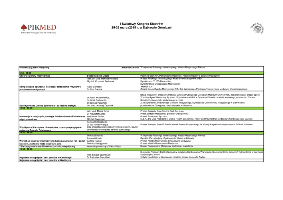 I Światowy Kongres Klastrów 25-26 marca2015 r. w Dąbrowie Górniczej Prowadzący panel medyczny 9:30 - 11:30 Otwarcie panelu medycznego Kompleksowe spojrzenie na obszar zarządzania ryzykiem w placówkach medycznych Koordynowana Opieka Zdrowotna - od idei do praktyki 12:00 - 13:30 Anna Kaczmarek Wiceprezes Polskiego Innowacyjnego Klastra Medycznego Pikmed Beata Małecka-Libera Prof. Dr. Med. Mariusz Piechota Mgr inż. Krzysztof Bednarek Rafał Biernacki Dr Piotr Daniluk Poseł na Sejm RP, Pełnomocnik Rządu ds. Projektu Ustawy o Zdrowiu Publicznym Prezes Polskiego Innowacyjnego Klastra Medycznego PIKMED Dyrektor ds. IT, ITQ Datacenter Dyrektor Biura Ubezpieczeń Medycznych Mentor S A Zespół Oceny Ryzyka Medycznego PZU SA, Wiceprezes Polskiego Towarzystwa Medycyny Ubezpieczeniowej dr Adam Kozierkiewicz, dr Jacek Grabowski, dr Bartosz Pędziński, lek. med. Andrzej Zapaśnik lekarz medycyny, pracownik Instytutu Zdrowia Publicznego Collegium Medicum Uniwersytetu Jagiellońskiego, prezes spółki Wspólny Rynek Medyczny Sp z o.o. Wykładowsca MBA w Ochronie Zdrowia Uczelni Łazarskiego, ekspert ds. Zdrowia Kanclerz Uniwersytetu Medycznego w Łodzi Z-ca Dyrektora Łomżyńskiego Centrum Medycznego, wykładowca Uniwersytetu Medycznego w Białymstoku przedstawiciel Okręgowej Izby Lekarskiej w Gdańsku Lek. med. Marek Girek Dr Krzysztof Łanda Innowacje w medycynie, strategie i doświadczenia Polskie oraz Waldemar Wolak Mitchell Sugarman międzynarodowe Tomasz Szelągowski Dr inż. Paweł Wielgus oraz przedstawiciele globalnych korporacji IT, nauki i Współpraca Start-up'ów i inwestorów, szansą na pozytywne decydentów w obszarze zdrowia publicznego zmiany w Zdrowiu Publicznym 14:30 - 16:00 Tomasz Lesniak Romuald Litwin, Workshop klastrów medycznych; dyskusja na temat roli i zadań Bartosz Hajncz Tomasz Szelągowski klastrów, platformy meta-klastrowe, cele "Start-up'y medyczne i inwestorzy - kulisy współpracy Warsztat prowadzący Wiktor Pałys 16:30 - 18:00 Najlepsze osiągnięcia i best practics w Kardiologii Najlepsze osiągnięcia i best practics w Okulistyce Prof. Łukasz Szumowski Dr Radosław Sierpiński Prezes Zarządu, Data Techno Park Sp. z o.o. Przez Zarządu MedicaNet, prezes Fundacji WHC Prezes Panaceum Sp. z o.o. M.B.A., the Vice President of Global Health Economics, Policy and Payment for Medtronic's CardioVascular Division Prezes Zarządu, Start-IT Fund;Członek Panelu Eksperckiego ds. Oceny Projektów Inwestycyjnych, DTPark Ventures Wiceprezes Polskiego Innowacyjnego Klastra Medycznego Pikmed Dyrektor Zarządzający, Ogólnopolski Klaster e-Zdrowie Prezes Klastra Medycznego Innowacyjna Medycyna Prezes Klastra Nowoczesna Medycyna Klaster Nowoczesna Medycyna, partnerzy i inwestorzy Kierownik Pracowni Elektrofizjologii w Instytucie Kardiologii w Warszawie, Kierownik Kliniki Zaburzeń Rytmu Serca w Instytucie Kardiologii w Aninie Instytut Kardiologii w Warszawie, redaktor portalu Serce dla Arytmii