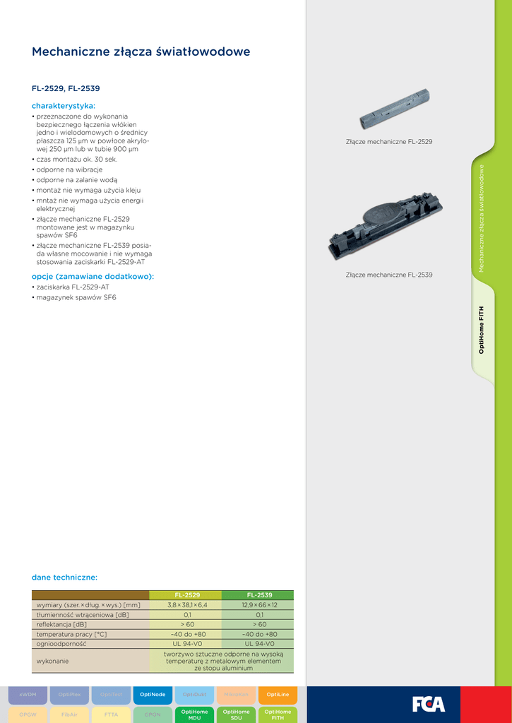Mechaniczne złącza światłowodowe FL-2529, FL-2539 charakterystyka: •przeznaczone do wykonania bezpiecznego łączenia włókien jedno i wielodomowych o średnicy płaszcza 125 µm w powłoce akrylowej 250 µm lub w tubie 900 µm •czas montażu ok. 30 sek. •odporne na wibracje •odporne na zalanie wodą •montaż nie wymaga użycia kleju •mntaż nie wymaga użycia energii elektrycznej •złącze mechaniczne FL-2529 montowane jest w magazynku spawów SF6 •złącze mechaniczne FL-2539 posiada własne mocowanie i nie wymaga stosowania zaciskarki FL-2529-AT Złącze mechaniczne FL-2539 OptiHome FITH OptiNode opcje (zamawiane dodatkowo): •zaciskarka FL-2529-AT •magazynek spawów SF6 dane techniczne: wymiary (szer. × dług. × wys.) [mm] tłumienność wtrąceniowa [dB] reflektancja [dB] temperatura pracy [°C] ognioodporność FL-2529 FL-2539 3,8 × 38,1 × 6,4 12,9 × 66 × 12 0,1 0,1 > 60 > 60 –40 do +80 –40 do +80 UL 94-V0 UL 94-V0 tworzywo sztuczne odporne na wysoką temperaturę z metalowym elementem ze stopu aluminium wykonanie Mechaniczne złącza światłowodowe Złącze mechaniczne FL-2529 xWDM OptiPlex OptiTest OptiNode OptiDukt MikroKan OptiLine OPGW FibAir FTTA GPON OptiHome MDU OptiHome SDU OptiHome FITH