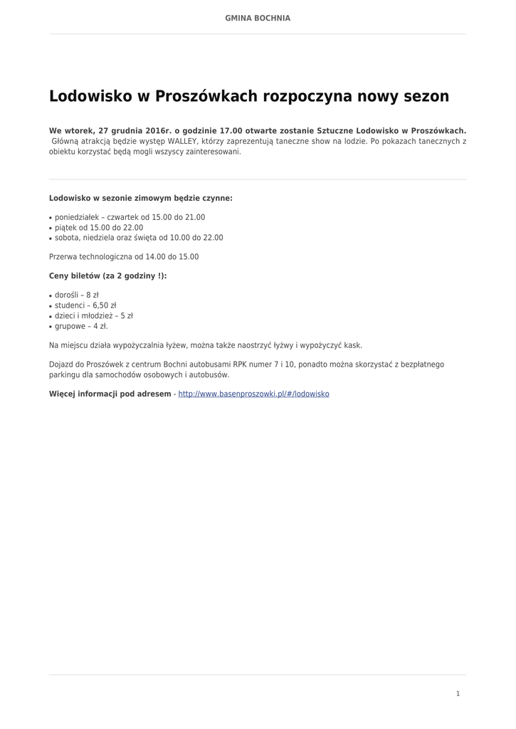 GMINA BOCHNIA Lodowisko w Proszówkach rozpoczyna nowy sezon We wtorek, 27 grudnia 2016r. o godzinie 17.00 otwarte zostanie Sztuczne Lodowisko w Proszówkach. Główną atrakcją będzie występ WALLEY, którzy zaprezentują taneczne show na lodzie. Po pokazach tanecznych z obiektu korzystać będą mogli wszyscy zainteresowani. Lodowisko w sezonie zimowym będzie czynne: ● ● ● poniedziałek – czwartek od 15.00 do 21.00 piątek od 15.00 do 22.00 sobota, niedziela oraz święta od 10.00 do 22.00 Przerwa technologiczna od 14.00 do 15.00 Ceny biletów (za 2 godziny !): ● ● ● ● dorośli – 8 zł studenci – 6,50 zł dzieci i młodzież – 5 zł grupowe – 4 zł. Na miejscu działa wypożyczalnia łyżew, można także naostrzyć łyżwy i wypożyczyć kask. Dojazd do Proszówek z centrum Bochni autobusami RPK numer 7 i 10, ponadto można skorzystać z bezpłatnego parkingu dla samochodów osobowych i autobusów. Więcej informacji pod adresem - http://www.basenproszowki.pl/#/lodowisko 1 GMINA BOCHNIA 2