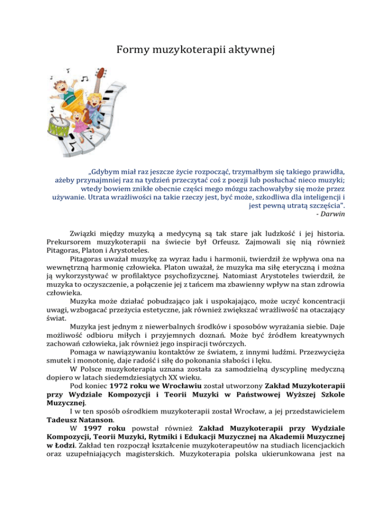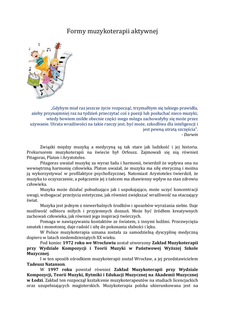 Formy muzykoterapii aktywnej „Gdybym miał raz jeszcze życie rozpocząć, trzymałbym się takiego prawidła, ażeby przynajmniej raz na tydzień przeczytać coś z poezji lub posłuchać nieco muzyki; wtedy bowiem znikłe obecnie części mego mózgu zachowałyby się może przez używanie. Utrata wrażliwości na takie rzeczy jest, być może, szkodliwa dla inteligencji i jest pewną utratą szczęścia". - Darwin Związki między muzyką a medycyną są tak stare jak ludzkość i jej historia. Prekursorem muzykoterapii na świecie był Orfeusz. Zajmowali się nią również Pitagoras, Platon i Arystoteles. Pitagoras uważał muzykę za wyraz ładu i harmonii, twierdził że wpływa ona na wewnętrzną harmonię człowieka. Platon uważał, że muzyka ma siłę eteryczną i można ją wykorzystywać w profilaktyce psychofizycznej. Natomiast Arystoteles twierdził, że muzyka to oczyszczenie, a połączenie jej z tańcem ma zbawienny wpływ na stan zdrowia człowieka. Muzyka może działać pobudzająco jak i uspokajająco, może uczyć koncentracji uwagi, wzbogacać przeżycia estetyczne, jak również zwiększać wrażliwość na otaczający świat. Muzyka jest jednym z niewerbalnych środków i sposobów wyrażania siebie. Daje możliwość odbioru miłych i przyjemnych doznań. Może być źródłem kreatywnych zachowań człowieka, jak również jego inspiracji twórczych. Pomaga w nawiązywaniu kontaktów ze światem, z innymi ludźmi. Przezwycięża smutek i monotonię, daje radość i siłę do pokonania słabości i lęku. W Polsce muzykoterapia uznana została za samodzielną dyscyplinę medyczną dopiero w latach siedemdziesiątych XX wieku. Pod koniec 1972 roku we Wrocławiu został utworzony Zakład Muzykoterapii przy Wydziale Kompozycji i Teorii Muzyki w Państwowej Wyższej Szkole Muzycznej. I w ten sposób ośrodkiem muzykoterapii został Wrocław, a jej przedstawicielem Tadeusz Natanson. W 1997 roku powstał również Zakład Muzykoterapii przy Wydziale Kompozycji, Teorii Muzyki, Rytmiki i Edukacji Muzycznej na Akademii Muzycznej w Łodzi. Zakład ten rozpoczął kształcenie muzykoterapeutów na studiach licencjackich oraz uzupełniających magisterskich. Muzykoterapia polska ukierunkowana jest na rozwój badań. Badania te obejmują muzykę, medycynę, psychologię, pedagogikę jak i socjologię. Wg Natansona u podstaw muzykoterapii leży zasada oddziaływania muzyki na sferę psychiczną człowieka. Muzykoterapię można stosować w formie czynnej biernej. Forma czynna polega na graniu muzyki, śpiewaniu, improwizowaniu, ruchu, relaksacji. Forma bierna polega na słuchaniu muzyki proponowanej przez terapeutę. Termin muzykoterapii został wprowadzony do światowej terminologii około 1950 roku. Muzykoterapia to leczenie dźwiękiem i muzyką, czyli uporządkowanymi dźwiękami. Muzyka, dźwięk leczy zarówno duszę i ciało. Można więc powiedzieć, że muzykoterapia to dyscyplina naukowa u podstaw której leży holistyczna koncepcja człowieka i jego zdrowia. Muzykoterapia wykorzystywana jest w rehabilitacji, kardiologii, ortopedii, oddziałach rodzenia oddziałach dziecięcych. Muzykoterapią, w rozumieniu działalności praktycznej, jest postępowanie zmierzające do realizacji konkretnych celów terapeutycznych. Może ona doprowadzić do wyników jedynie wówczas, gdy będzie prowadzona w sposób systematyczny i metodyczny. Początkowo muzykoterapię najczęściej stosowano w odniesieniu do działań psychoterapeutycznych, w których podstawową rolą muzyki była pomoc w nawiązywaniu komunikacji z pacjentem, a następnie dokonywanie zmian w jego zaburzonych formach zachowania. W miarę upływu lat zakres oddziaływania muzykoterapii został znacznie rozszerzony, co wpłynęło również na modyfikację terminologiczną. Wg Elżbiety Galińskiej muzykoterapia to naukowo uzasadnione użycie dźwięku i muzyki w celach diagnostycznych i terapeutycznych. Muzykoterapia może być przeprowadzana indywidualnie grupowo. Przez muzykoterapię indywidualną należy rozumieć leczenie muzyką osobno każdego pacjenta przez dłuższy lub krótszy okres czasu. Stosowanie muzykoterapii grupowej wymaga przeprowadzenia odpowiedniego doboru grupy, co do ilości osób (zwykle od 6 do 12), płci, wykształcenia, diagnozy cech osobowości, poziomu kultury muzycznej, upodobań muzycznych itp. Muzykoterapia grupowa może być ukierunkowana (tzw. dyrektywna), bądź nieukierunkowana (tzw. niedyrektywna). Do elementów strukturalnych muzyki należą rytm, melodia, dynamika, harmonia, barwa, tempo i inne. Oddziaływanie tych elementów muzycznych na człowieka może mieć znaczenie dla stymulowania funkcji psychomotorycznych, kształtowania przebiegu napięć i odprężeń psychofizycznych. W poszczególnych technikach muzykoterapii wykorzystuje się różne elementy w celu uzyskania efektów leczniczych. Bogata literatura muzyczna pozwala na wybór utworów muzycznych zróżnicowanych pod względem okresu, stylu, typu i kierunku melodii, faktury i aparatu wykonawczego. Występują pewne zasady obowiązujące w muzykoterapii: 1. IZO – zasada porównywania: Mówi ona, że utwór muzyczny należy dobierać do aktualnego nastroju pacjenta. 2. LEVEL – należy podwyższać nastrój: Osobie smutnej proponujemy utwór wesoły, dla podniesienia jej nastroju. Celem muzykoterapii jest: - - integracja grupy, nawiązanie kontaktu; aktywizacja emocjonalna pacjenta (dziecka); - rozwijanie wrażliwości estetycznej; - kreatywny rozwój twórczy pacjenta; Metody muzykoterapii: 1. treningowe – relaks; 2. projekcyjne (przenoszenia) – psychorysunek przy muzyce, pantomima muzyczna; 3. improwizacja instrumentalna Carla Orffa; 4. śpiewoterapia; 5. choreoterapia – ruch i taniec; W literaturze polskiej Galińska podjęła próbę uporządkowania metod muzykoterapii. Autorka wyróżnia siedem grup metod ze względu na funkcje, jakie pełni muzyka w psychoterapii. 1. Odreagowująco-wyobrażeniowe