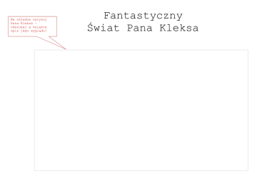 Na okładce narysuj Pana Kleksa – odszukaj w ksiąŜce opis jego wyglądu! Fantastyczny Świat Pana Kleksa Adaś Niezgódka to chłopiec, który bardzo lubił czytać ksiąŜki. W domu i szkole nic mu się nie udawało, więc wysłano go do Akademii Pana Kleksa. Chodzili tam chłopcy, których imiona zaczynały się na literkę A. Oprócz Pana Kleksa był tam takŜe szpak Mateusz. 1 Nazywam się Adam Niezgódka, mam dwanaście lat i juŜ od pół roku jestem w Akademii Pana Kleksa 2 Oszę, u emia ana eksa! Akademia Pana Kleksa mieści się na końcu ulicy Czekoladowej i sąsiaduje z róŜnymi bajkami - są tam bajki braci Grimm i Andersena. Adaś trafił kiedyś do bajki o dziewczynce z zapałkami, by poŜyczyć pudełko zapałek dla pana Kleksa oraz do bajki o śpiącej królewnie i siedmiu braciach. 3 4 Nie poznajesz mnie? Nazywam się Andresen. Po co tutaj przyszedłeś? Przyszedłem, proszę pana, po zapałki. Pan Kleks mnie przysłał. Zapraszam was, chłopcy na podwieczorek. MoŜecie jeść, ile chcecie, bo Ŝadna ilość wam nie zaszkodzi. Szpak Mateusz opowiedział Adasiowi swoją historię. Okazało się, Ŝe tak naprawdę jest zaklętym w ptaka księciem. Aby wrócić do swojej prawdziwej postaci, musi odnaleźć guzik od cudownej czapki. 5 W imieniu króla rozkazuję ci, wilku, abyś dał mi wolną drogę! Doktorze Paj-Chi-Wo, ratuj mego syna! 6 Adaś zastanawiał się, dlaczego pan Kleks nie znalazł jeszcze guzika od cudownej czapki. PrzecieŜ pan Kleks potrafi wszystko - unosić się w powietrzu, przyrządzać potrawy z kolorowych szkiełek oraz zmniejszać się i powiększać. 7 8 Pomyślałeś sobie teraz, Ŝe mam pewno ze sto lat, prawda? A tymczasem jestem o dwadzieścia lat młodszy od ciebie. Co dzień o północy pan Kleks zaczyna się zmniejszać, aŜ staje się mały, jak niemowlę, a rano wkłada do ucha powiększającą pompkę i odzyskuje swoją zwykłą postać. Pan Kleks potrafi takŜe naprawiać rozmaite przedmioty - np. wyleczyć zepsuty tramwaj, a takŜe wysłać swoje oko tam, gdzie chce - choćby i na księŜyc. 9 10 Chłopcy, otoczcie tramwaj, tak Ŝeby nikt nie miał do niego dostępu, a ja go wyleczę. Wysyłam moje oko na księŜyc. Muszę się dowiedzieć, kto mieszka na księŜycu, bo chcę napisać dla was bajkę o księŜycowych ludziach. Codziennie rano uczniowie Akademii dają panu Kleksowi swoje senne lusterka, na których zapisane są ich sny. Potem następują lekcje, które są bardzo ciekawe -np. nauka kleksografii i przędzenie liter. 11 12 Adasiu, bardzo podoba mi się twój sen o siedmiu szklankach. Odznaczam cię za to dwiema piegami. Przepuszczam litery przez palce i mogę w ten sposób przeczytać całą ksiąŜkę, nie męcząc wzroku. Drugie piętro Akademii zajmuje szpital chorych sprzętów. Pan Kleks leczy tam zepsute zegary, krzesła, stoły, szafy i lustra. Ciekawa jest teŜ w akademii nauka geografii - polegająca na graniu w piłkę globusem i odgadywaniu nazw kopniętych miejsc. 13 14 Czy bardzo jeszcze kaszlesz? Chyba nie. Wkrótce juŜ będziesz zdrowa. Australia! Radom! Wisła! Adaś był jedynym z uczniów, którzy mogli pomagać panu Kleksowi w przygotowaniu potraw, które złoŜone były z kolorowych szkiełek, kwiatów, proszków, farb i płomyków świec. Gotowe potrawy pan Kleks oblewał z polewaczki specjalnymi sosami o róŜnych właściwościach. 15 16 Myślę, Ŝe zupa pomidorowa będzie dzisiaj doskonała! Odpowiednie połączenie farby zielonej z białą i z odrobiną szarej daje smak waniliowy, brązowy z Ŝółtą posiada smak czekoladowy, srebrna, domieszana do czarnej i z lekka zakropiona seledynową, smakuje jak ananas. Jedną z popołudniowych zabaw w akademii było poszukiwanie skarbów. Adaś z kolegą odnaleźli tak Królewnę śabkę, która dała im prezenty - Adasiowi złoty kluczyk, a Arturowi gwizdek. 17 Jestem Królewną śabką, jeśli mnie dotkniecie, natychmiast przemienicie się w Ŝaby i zostaniecie tutaj na zawsze. 18 A wy coście znaleźli? Złoty gwizdek i kluczyk. To są nieocenione skarby. Kluczyk ten otwiera wszystkie zamki, a kiedy zagwiŜdŜe się na gwizdku, moŜna znaleźć się tam, gdzie się pragnie. Adaś nauczył się latać, tak jak to robił pan Kleks. Dostał się do psiego raju, po którym oprowadził go jego dawny pies mops Reks. Adaś nie wiedział, jak wrócić, ale na szczęście pan Kleks posłał Mateusza ze wskazówkami. 19 20 Reks! To ty? Jesteśmy właśnie przed moim pałacykiem. Zapraszam cię do mnie na szklankę mleka. Hau, hau! hau! Popołudniu chłopcy odwiedzili teŜ fabrykę dziur i dziurek. Niestety po wycieczce czekała na nich niemiła niespodzianka - plaga much w akademii. 21 22 W hali tej wyrabiane są dziurki od kluczy, dziurki w nosie i dziurki w uszach, jak równieŜ inne jeszcze dziurki mniejszego kalibru. Wymyśliłem specjalny rodzaj muchołapki, która uwolni naszą Akademię od plagi much. Pan Kleks miał zmartwienia i widać było, Ŝe coś dziwnego dzieje się w Akademii. Pewnego dnia Pan Kleks wypuścił całą wodę ze stawu by ugasić płomyki świec, które nagle zaczęły go parzyć. 23 24 Filip domaga się, abym przyjął do Akademii dwóch jego synów. Grozi mi, Ŝe w razie ich nieprzyjęcia odbierze nam wszystkie piegi. Pan Kleks z niewiadomych powodów zabrał całą wodę ze stawu, pozostawiając wszystkie Ŝaby, ryby i raki na pastwę losu. Z księŜyca wrócił balonik z okiem pana Kleksa. Opowieść o tym, co znajduje się na księŜycu pan Kleks zostawił na później, tymczasem przeczytał uczniom Sen o siedmiu szklankach, który przyśnił się Adasiowi, a zapisany był w księdze najpiękniejszych snów. 25 26 Moje oko wraca z księŜyca! Coś ty narobił! ukradłeś chmurę. Odtąd juŜ nigdy nie będzie deszczu ani śniegu, ani nawet wiatru. W Akademii pojawili się synowie fryzjera Filipa Anatol i Alojzy. Okazało się, Ŝe Alojzy tak naprawdę jest lalką, a panu Kleksowi udało się go oŜywić. 27 28 Jestem Anatol K