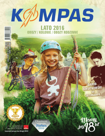 LATO 2016 Nr 1/2016 cena 9,90 zł (w tym 8% VAT) ISSN 1895-6882 OBOZY / KOLONIE / OBOZY RODZINNE DAWID I KWIATKOWSK NA INTERKAMPIE Laureat już po raz drugi 2013 KOMPAS O nas KOMPAS HISTORIA BIURA Na początku, w 1998 roku, było… hobby. Z jednej strony wspinaczka, podróże dalsze i bliższe, survival, samochody terenowe. Z drugiej – teatr, sztuka, taniec, muzyka. Kiedy te sprzeczności połączyły się w całość, powstało Biuro Turystyki Aktywnej Kompas. To, co do tej pory było naszym hobby, postanowiliśmy uczynić pracą. Według nas jest to jedyny skuteczny sposób na robienie rzeczy porywających i zapierających dech w piersiach. Już od 18 lat robimy to, co lubimy. Wszystko po to, aby nasi Klienci mogli cieszyć się wypoczynkiem korzystając z naszych usług. Tworzymy innowacyjne programy obozów, dla wielu będące inspiracją. 18 lat temu stworzyliśmy pierwszy w Polsce Obóz Przygody, promujący aktywności outdoorowe, które obecnie dla wielu osób stały się stylem życia. W 2003 roku powstały twórcze obozy Interkamp, a w 2014 roku zaczęliśmy organizować wyjątkowe Fanowskie Obozy z Dawidem Kwiatkowskim. RANKINGORGANIZATORÓW Kilkakrotnie zajmowaliśmy czołowe miejsca w ogólnopolskim rankingu organizatorów turystyki młodzieżowej 2008 – 1 miejsce, 2009 – 1 miejsce, 2010 – 2 miejsce, 2011 – 1 miejsce, 2012 – 2 miejsce. Jesteśmy jednym z najbardziej uznanych organizatorów na rynku, o ugruntowanej i stabilnej pozycji finansowej. Jesteśmy równocześnie organizatorem o największej ofercie autorskich pomysłów na ciekawe i inspirujące obozy FACEBOOK Zapraszamy do dołączenia do naszej grupy KOMPAS BTA na www.facebook.com. Poznaj nas lepiej, dowiedz się pierwszy o najnowszych wydarzeniach i projektach, aktualnych promocjach oraz naszych kolejnych pomysłach. Serdeczniezapraszamy! DLACZEGO ROBIMY DOBRE IMPREZY • jesteśmy prekursorami, wyznaczamy nowe standardy, • mamyprofesjonalnepodejściedowszystkiego, corobimy, • naszaofertajestkompleksowa, • mamyindywidualnepodejściedoKlienta, • największą wagę przywiązujemy do bezpieczeństwa, • wszelkie detale przygotowujemy z dużym realizmem, • używamy sprzętu tylko z atestami bezpieczeństwa, • wswoichmagazynachmamydużoróżnorodnegosprzętu,rekwizytówiakcesoriów. • wszystkocorobimy,robimyzPasją! NASZEOŚRODKI Od 2010 roku mamy własną bazę noclegową. Zapraszamy do obiektów: • SchroniskoPasterka www.przystanekpasterka.pl, • SchroniskoNaSzczelińcu www.naszczelincu.pl, • DWSzczelinkawPasterce www.przystanekpasterka.pl, • ApartamentFamiliawLądkuZdroju www.apartamentfamilia.pl. GAZELA BIZNESU 2013 I 2014 Dwukrotnie znaleźliśmy się w gronie Gazel Biznesu! Elitarny ranking, tworzony przez „Puls Biznesu” od 14 lat, zrzesza w swoim gronie najdynamiczniej rozwijające się firmy z sektora małych i średnich przedsiębiorstw. To wyróżnienie cieszy nas tym bardziej, że jesteśmy jedynym organizatorem turystyki wyróżnionym w województwie pomorskim i jednym z niewielu w Polsce. DIAMENTYFORBESA2016 Zostaliśmy również uhonorowani prestiżową nagrodą Diamenty Forbesa – dla firm, które w ostatnich trzech latach dynamicznie zwiększały swoją wartość. Dzięki temu dołączyliśmy do zacnego grona najlepszych firm na polskim rynku! Lubięto! INSTAGRAM Śledź nas również na instagram.com/btakompas. 1 BiuroTurystykiAktywnejKompassp.zo.o. 80-119 Gdańsk, Asesora 72 tel./fax (+48) 58 303 18 78 e-mail: [email protected] www.kompas.pl Jesteśmy wpisani do Rejestru Organizatorów Turystyki i Pośredników Turystycznych Wojewody Pomorskiego nr 191. Polisyubezpieczeniowe: • gwarancja ubezpieczeniowa AXA nr 01.866.818 • polisa OC deliktowo-kontraktowa w PZU SA nr Z01/06/6124/06/01 NIP583-286-21-05 REGON193042862 Kapitałzakładowy62000zł Spółka zarejestrowana w Sądzie Rejonowym GdańskPółnocwGdańsku VIIWydziałGospodarczyKRS0000208369. Konto: BankOchronyŚrodowiskaS.A. nr: 62 1540 1098 2109 5553 0057 0001 konto w PLN SWIFT CODE: EBOSPLPW Adresbanku: BOŚ Bank Centrum Korporacyjne w Gdańsku 80-824 Gdańsk, ul. Podwale Przedmiejskie 30 Jesteśmy członkiem: Kompas 7 Informacje dla Rodziców 8 Obóz Rodzinny nad Biebrzą 9-12 Kolonie dla Najmłodszych w Dłutowie 13-15 Kolonie dla Najmłodszych na Jurze 16-17Kolonie dla Najmłodszych na Kaszubach - Sycowa Huta 18-20Kolonie dla Najmłodszych w Górach - Wisła 21 Moja Pierwsza Kolonia nad Morzem 51 Obóz Pływacki 52 Obóz Tenisowy 53 Obóz Fitness&Zumba 54 Letnia Akademia Sylwetki 55 Obóz CrossFit&Przygoda 56 Obóz Cheerleaderek – NOWOŚĆ 57 Oldskulowy obóz na Mazurach – NOWOŚĆ 58 Obóz Windsurfingowy 59 Obóz FitStyle nad Morzem 60 Górska Przygoda Artystyczna - młodzież 61 Górski Obóz Przygody w Tatrach 62 Projekt Skrzydła - obóz motywacyjny dla licealistów 63 Obóz Przygody z Fotografią – NOWOŚĆ 64 Obóz Przygody ze Śpiewem – NOWOŚĆ 65 Obóz Przygody z Gitarą – NOWOŚĆ 66 Obóz Przygody z Tańcem – NOWOŚĆ KLUB URWISA - OBOZY I KOLONIE PRZYGODOWE, FABULARNE I SPORTOWE DLA DZIECI 7-12 LAT OBOZY FABULARNE, MANGA I COSPLAY DLA MŁODZIEŻY 12-20 LAT 3-4 Nasza Kadra 5 Dlaczego my? Nasze zalety OBOZY RODZINNE I MALUSZKOWE IDEALNE DLA TYCH, KTÓRZY PIERWSZY RAZ JADĄ NA OBOZY 5-9 LAT 23 Przygoda dla Najmłodszych na Jurze 24 Obóz Małego Detektywa na Jurze 25O bóz Konstruktorów Lego na Jurze – NOWOŚĆ 26 Kolonia z elemenatmi Survivalu 27 Dziewczęca Kolonia z Elementami Survivalu 28 Obóz Podróżników na Mazurach – NOWOŚĆ 29 Przygodowy Obóz Piłkarski na Mazurach – NOWOŚĆ 30 Mazurska Przygoda Artystyczna 31 Wodny Obóz Przygody na Kaszubach 32 Obóz Przyrodniczy na Kaszubach – NOWOŚĆ 33 Kaszubska Kolonia Młodego Survivalowca 34 Obóz Małego Detektywa nad Morzem 35 Morska Przygoda dla Najmłodszych 36 Obóz Naukowy nad Morzem 37 Górska Przygoda Artystyczna dla Najmłodszych 38 Obóz Lonstruktorów Lego w Górach – NOWOŚĆ 39 Obóz dla Fanów Odleg