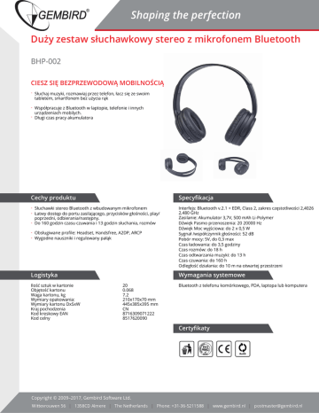 Duży zestaw słuchawkowy stereo z mikrofonem Bluetooth BHP-002 CIESZ SIĘ BEZPRZEWODOWĄ MOBILNOŚCIĄ - Słuchaj muzyki, rozmawiaj przez telefon, łacz się ze swoim tabletem, smartfonem bez użycia rąk - Współpracuje z Bluetooth w laptopie, telefonie i innych urządzeniach mobilych. - Długi czas pracy akumulatora Cechy produktu Specyfikacja - Słuchawki stereo Bluetooth z wbudowanym mikrofonem - Łatwy dostęp do portu zasilającego, przycisków głośności, play/ poprzedni, odbierania/następny. - Do 160 godzin czasu czuwania i 13 godzin słuchania, rozmów - Obsługiwane profile: Headset, Handsfree, A2DP, ARCP - Wygodne nauszniki i regulowany pałąk Interfejs: Bluetooth v.2.1 + EDR, Class 2, zakres częstotliwości 2,4026 2,480 GHz Zasilanie: Akumulator 3,7V, 500 mAh Li-Polymer Dźwięk Pasmo przenoszenia: 20 20000 Hz Dźwięk Moc wyjściowa: do 2 x 0,5 W Sygnał /współczynnik głośności: 52 dB Pobór mocy: 5V, do 0,3 max Czas ładowania: do 3,5 godziny Czas rozmów: do 18 h Czas odtwarzania muzyki: do 13 h Czas czuwania: do 160 h Odległość działania: do 10 m na otwartej przestrzeni Logistyka Wymagania systemowe Ilość sztuk w kartonie Objętość kartonu Waga kartonu, kg Wymiary opakowania: Wymiary kartonu DxSxW Kraj pochodzenia Kod kreskowy EAN Kod celny 20 0.068 7.2 210x170x70 mm 445x385x395 mm CN 8716309071222 8517620090 Bluetooth z telefonu komórkowego, PDA, laptopa lub komputera Certyfikaty Copyright © 2009–2017, Gembird Software Ltd. ! " # $ ! "
