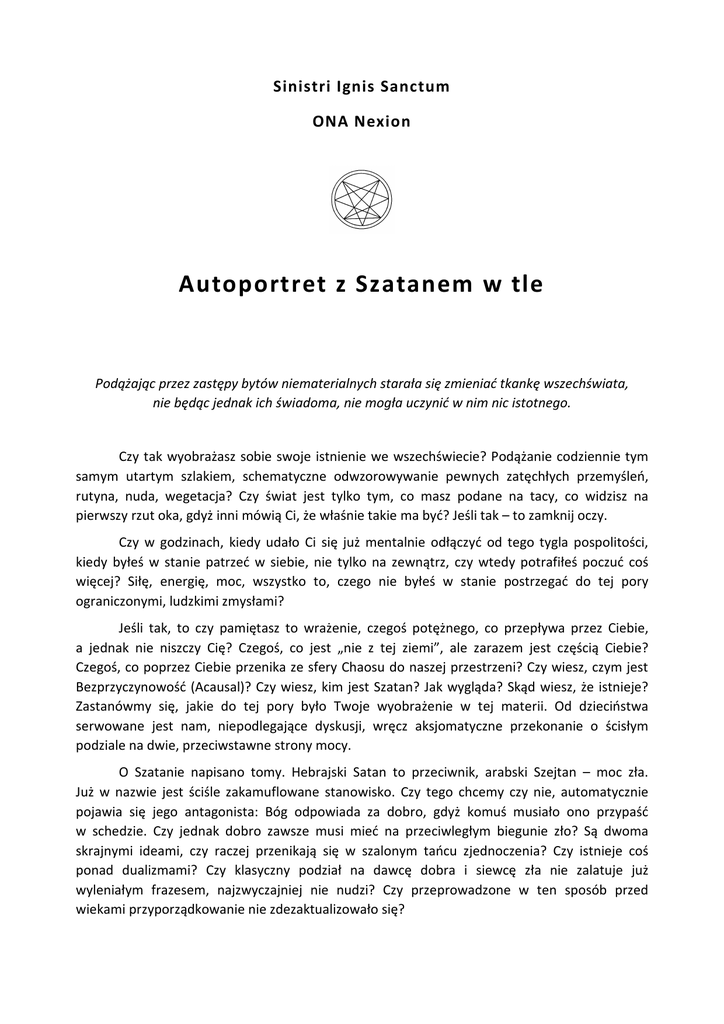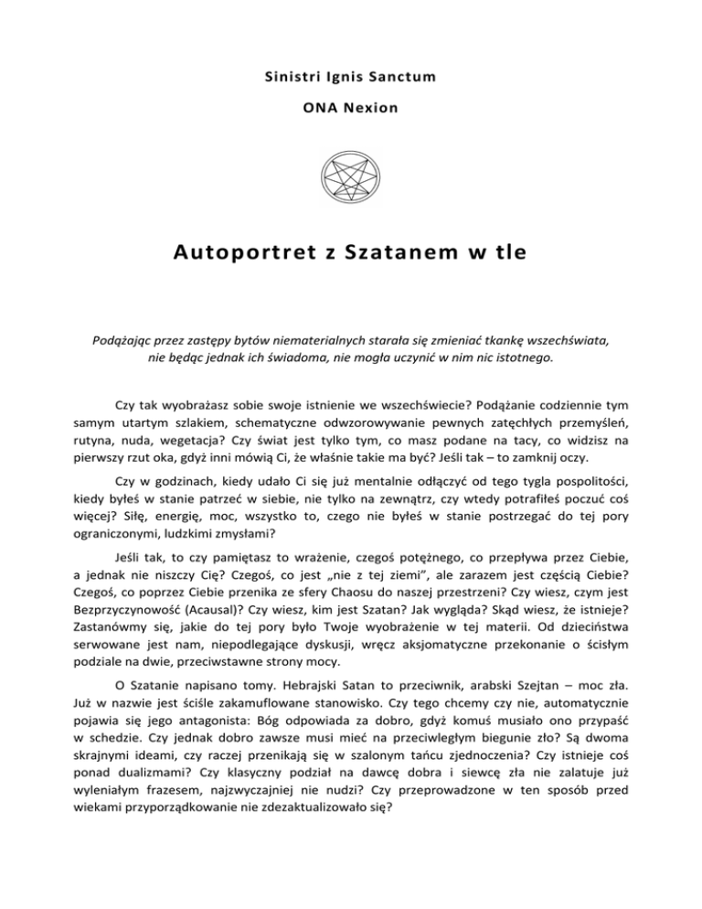 Sinistri Ignis Sanctum ONA Nexion Autoportret z Szatanem w tle Podążając przez zastępy bytów niematerialnych starała się zmieniać tkankę wszechświata, nie będąc jednak ich świadoma, nie mogła uczynić w nim nic istotnego. Czy tak wyobrażasz sobie swoje istnienie we wszechświecie? Podążanie codziennie tym samym utartym szlakiem, schematyczne odwzorowywanie pewnych zatęchłych przemyśleń, rutyna, nuda, wegetacja? Czy świat jest tylko tym, co masz podane na tacy, co widzisz na pierwszy rzut oka, gdyż inni mówią Ci, że właśnie takie ma być? Jeśli tak – to zamknij oczy. Czy w godzinach, kiedy udało Ci się już mentalnie odłączyć od tego tygla pospolitości, kiedy byłeś w stanie patrzeć w siebie, nie tylko na zewnątrz, czy wtedy potrafiłeś poczuć coś więcej? Siłę, energię, moc, wszystko to, czego nie byłeś w stanie postrzegać do tej pory ograniczonymi, ludzkimi zmysłami? Jeśli tak, to czy pamiętasz to wrażenie, czegoś potężnego, co przepływa przez Ciebie, a jednak nie niszczy Cię? Czegoś, co jest „nie z tej ziemi”, ale zarazem jest częścią Ciebie? Czegoś, co poprzez Ciebie przenika ze sfery Chaosu do naszej przestrzeni? Czy wiesz, czym jest Bezprzyczynowość (Acausal)? Czy wiesz, kim jest Szatan? Jak wygląda? Skąd wiesz, że istnieje? Zastanówmy się, jakie do tej pory było Twoje wyobrażenie w tej materii. Od dzieciństwa serwowane jest nam, niepodlegające dyskusji, wręcz aksjomatyczne przekonanie o ścisłym podziale na dwie, przeciwstawne strony mocy. O Szatanie napisano tomy. Hebrajski Satan to przeciwnik, arabski Szejtan – moc zła. Już w nazwie jest ściśle zakamuflowane stanowisko. Czy tego chcemy czy nie, automatycznie pojawia się jego antagonista: Bóg odpowiada za dobro, gdyż komuś musiało ono przypaść w schedzie. Czy jednak dobro zawsze musi mieć na przeciwległym biegunie zło? Są dwoma skrajnymi ideami, czy raczej przenikają się w szalonym tańcu zjednoczenia? Czy istnieje coś ponad dualizmami? Czy klasyczny podział na dawcę dobra i siewcę zła nie zalatuje już wyleniałym frazesem, najzwyczajniej nie nudzi? Czy przeprowadzone w ten sposób przed wiekami przyporządkowanie nie zdezaktualizowało się? Bóg od dłuższego czasu kona, znika, rozmywa się albo zostaje zastąpiony przez innych bogów. Skoro nie wiemy, kim jest teraz Bóg, jaką możemy mieć pewność w kreowaniu wizerunku Szatana na dotychczasowych zasadach? Zbyt często mylimy Szatana z szatanem. Pojawia się pytanie, kim/czym jest On naprawdę i czy prawda w prezentowaniu Jego koncepcji może być oczywista. Ilu znasz już Szatanów? Pytanie raczej nie po to żeby zacząć tu wyliczanie. Nie chodzi o podanie maksymalnej liczby Jego imion. I też nie o wszystkie możliwe Jego przejawy, czy postacie, pod którymi się ukrywał lub były mu przypisywane. Liczy się pojmowanie archetypiczne. Samo określenie „archetypiczne”, etymologicznie kojarzone głównie z psychologiczną teorią typów Junga, tutaj ma zastosowanie bardziej ezoteryczne – jest pewnym sposobem obrazowania i przetwarzaniem na warstwę symboliczną, a zarazem próbą nadania formy i opisu pierwotnej energii bezprzyczynowej. Wyobraź sobie taką strukturę: Świat Przyczynowy (Causal) – to, co nas otacza, widzialne, ale też niewidzialne. Niewidzialne – ale już przez nas upostaciowione, ujarzmione, nazwane. Czy na tym poziomie wychwycisz Szatana? Jak najbardziej. Będzie przejawem pewnej konkretnej energii, panem mrocznej strony mocy, wszystkim tym, co drzemie w cieniu naszej podświadomości, co przy niższym stopniu wglądu w siebie nie będzie nam dane nawet dostrzec i odczytać, a często będzie zaprzeczeniem tego, co sublimujemy w życiu codziennym. Cieniem nazwiemy obszar, w którym pozostają uśpione, bądź ukryte aspekty naszej jednostkowej podświadomości. Jest to zakres o tyle istotny, że „nieuświadomiony”. Nieuświadomienie nie polega tu jednak na niewiedzy, a na niemożności wytłumaczenia i zobrazowania tych aspektów wprost. Dlatego zrozumienie jest tu procesem intuicyjnym, a archetypy na tym poziomie nie są nazywane bezpośrednio – rezydują w nas i przez nas są odczuwane. Na wyższym poziomie świadomości Szatan urośnie do rangi symbolu, archetypu owocu zakazanego, a przez to szczególnie hołubionego. Ego jest tym aspektem nas samych, które skupia się na Ja – nasza percepcja ogranicza się tu do natychmiastowych i bezpośrednich potrzeb oraz prób ich zaspokojenia. Tyczy się to również sposobów kreowania otaczającej nas rzeczywistości. To z tego poziomu dochodzi do aktów personalizacji pewnych form energii. Pojawiają się bogowie i demony. Pojawiają się próby tłumaczenia ich „przesłania” – przyczynowe formy dostosowane do różnego typu odbiorcy: tak tarot, jak i Biblia, tak tłumaczenie snów, jak i wróżenie z fusów. Jeszcze wyżej dojdziemy do poziomu Self – jest to moment dostrzeżenia naszego jednostkowego Wyrdu (przeznaczenia), a zarazem umiejętności pojęcia istoty rzeczy w wersji pierwotnej. Odrzucane jest nazewnictwo, odrzucana jest forma (skorupa) – Szatan traci swe imię. Świadomie integrujemy wszystko, czym był On dla nas do tej pory wraz z tym, co już wcześniej w sobie akceptowaliśmy. To jest krok w kierunku pozbycia się dualizmów i krok w kierunku procesu indywiduacji, który w efekcie ma stworzyć jednostkę całościową i niepodzielną. Ostatecznym celem procesu będzie tu wykształcenie Jaźni. Jednak tak samo istotna jak cel jest też droga prowadząca ku niemu. Wszelkie procesy twórcze, poszukiwania 2 duchowe – będą elementem tej drogi. Przebywszy ją – zyskujemy siebie na poziomie wyższym, zintegrowanego i urzeczywistnionego na poziomie Jaźni. Wyrazem zjednoczenia z wyższym Ja jest świadome doznanie zarówno jasnej, jak i ciemnej (archetyp Cienia) strony natury ludzkiej. Człowiek, aby odczuć pełnię musi przyjąć do siebie zarówno „dobro 