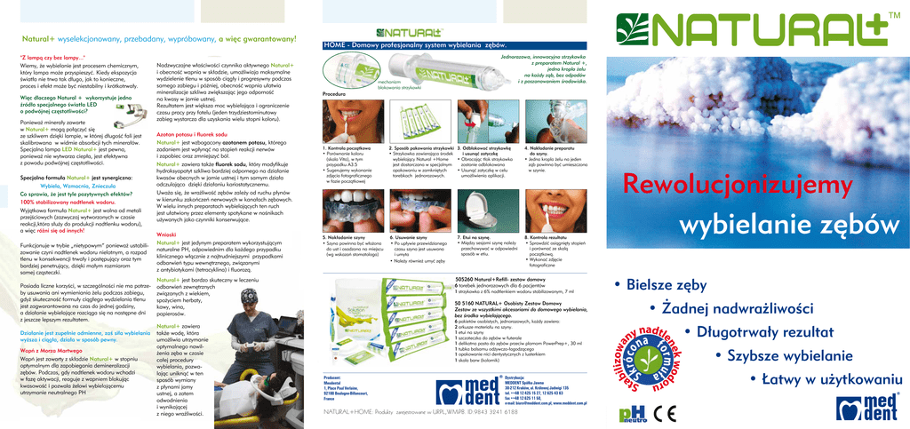 Natural+ wyselekcjonowany, wyselekcjonowany, przebadany, przebadany, wypróbowany, wypróbowany, aa więc więc gwarantowany! gwarantowany! Natural+ 5. Nakładanie Nakładanie szyny szyny 5. • Szyna powinna być włożona włożona • Szyna powinna być do ust ust ii osadzona osadzona na na miejscu miejscu do (wg wskazań wskazań stomatologa) stomatologa) (wg 6. Usuwanie Usuwanie szyny szyny 6. • Po upływie przewidzianego • Po upływie przewidzianego czasu szyna szyna jest jest usuwana usuwana czasu umyta ii umyta Należy również również umyć umyć zęby zęby •• Należy 7. Etui Etui na na szynę. szynę. 7. Między sesjami sesjami szynę szynę należy należy •• Między przechowywać ww odpowiedni odpowiedni przechowywać sposób ww etiu. etiu. sposób 8. Kontrola Kontrola rezultatu rezultatu 8. • Sprawdzić osiągnięty stopień stopień • Sprawdzić osiągnięty porównać ze ze skalą skalą ii porównać początkową. początkową. Wykonać zdjęcie zdjęcie •• Wykonać fotograficzne fotograficzne 50 5160 5160 NATURAL+ NATURAL+ Osobisty Osobisty Zestaw Zestaw Domowy Domowy 50 Zestaw ze ze wszystkimi wszystkimi akcesoriami akcesoriami do do domowego domowego wybielania, wybielania, Zestaw bez środka środka wybielającego. wybielającego. bez pakietów osobistych, osobistych, jednorazowych, jednorazowych, każdy każdy zawiera: zawiera: 66 pakietów arkusze materiału materiału na na szyny. szyny. 22 arkusze etui na na szyny szyny 11 etui szczoteczka do do zębów zębów ww futerale futerale 11 szczoteczka delikatna pasta pasta do do zębów zębów przeciw przeciw plamom plamom PowerPrep+, PowerPrep+, 30 30 ml ml 11 delikatna 1 tubka balsamu odżywczo-łagodzącego 1 tubka balsamu odżywczo-łagodzącego opakowanie nici nici dentystycznych dentystycznych zz lusterkiem lusterkiem 11 opakowanie skala barw barw (kolornik) (kolornik) 11 skala Producent: Meodental 1, Place Paul Verlaine, 92100 Boulogne-Billancourt, France Dystrybucja: MEDDENT Spółka Jawna 30-212 Kraków, ul. Królowej Jadwigi 135 tel. ++48 12 425 15 27, 12 625 43 63 fax ++48 12 625 11 50, e-mail: [email protected], www.meddent.com.pl NATURAL+HOME: Produkty zarejestrowane w URPL,WMiPB. ID:9843 3241 6188 …jeszcze jeden jeden raz raz …jeszcze wybielanie • Bielsze zęby zębów • Żadnej nadwrażliwości nadtle y n • Długotrwały rezultat nnaaddtt nnyyna f llee n ek w od strzykawka zz 6% 6% nadtlenkiem nadtlenkiem wodoru wodoru stabilizowanym, stabilizowanym, 77 ml ml 11 strzykawka Rewolucjonizujemy d ne or mu 505260 Natural+RefillNatural+Refill- zestaw zestaw domowy domowy 505260 torebek jednorazowych jednorazowych dla dla 66 pacjentów pacjentów 66 torebek Rewolucjonizujemy kr o 4. Nakładanie Nakładanie preparatu preparatu 4. do szyny. szyny. do Jedna kropla kropla żelu żelu na na jeden jeden •• Jedna ząb powinna powinna być być umieszczona umieszczona ząb szynie. ww szynie. zow bili óc a r o 3. Odblokować Odblokować strzykawkę strzykawkę 3. usunąć zatyczkę zatyczkę ii usunąć Obracając tłok tłok strzykawka strzykawka •• Obracając zostanie odblokowana odblokowana zostanie Usunąć zatyczkę zatyczkę ww celu celu •• Usunąć umożliwienia aplikacji. aplikacji. umożliwienia •Bielsze zęby szybsze wybielanie •Żadnej• Szybsze nadwrażliwości wybielanie •Łatwy w użytkowaniu •Długotrwały • Łatwy rezultat w użytkowaniu w nek od Natural+ jest jest bardzo bardzo skuteczny skuteczny w w leczeniu leczeniu Natural+ Posiada liczne liczne korzyści, korzyści, w w szczególności szczególności nie nie ma ma potrzepotrze- odbarwień Posiada odbarwień zewnętrznych zewnętrznych by usuwania usuwania ani ani wymieniania wymieniania żelu żelu podczas podczas zabiegu, zabiegu, by związanych zz wiekiem, wiekiem, związanych gdyż skuteczność formuły ciągłego wydzielania tlenu gdyż skuteczność formuły ciągłego wydzielania tlenu spożyciem herbaty, herbaty, spożyciem jest zagwarantowana zagwarantowana na na czas czas do do jednej jednej godziny, godziny, jest kawy, wina, wina, kawy, działanie wybielające wybielające rozciąga rozciąga się się na na następne następne dni dni aa działanie papierosów. papierosów. z jeszcze lepszym rezultatem. z jeszcze lepszym rezultatem. Natural+ zawiera zawiera Natural+ Działanie jest jest zupełnie zupełnie odmienne, odmienne, zaś zaś siła siła wybielania wybielania także także wodę, wodę, która która Działanie wyższa ii ciągła, ciągła, działa działa w w sposób sposób pewny. pewny. umożliwia utrzymanie utrzymanie wyższa umożliwia optymalnego nawilnawiloptymalnego Wapń zz Morza Morza Martwego Martwego Wapń żenia zęba zęba w w czasie czasie żenia Wapń jest jest zawarty zawarty zz składzie składzie Natural+ Natural+ w w stopniu stopniu Wapń całej procedury procedury całej optymalnym dla dla zapobiegania zapobiegania demineralizacji demineralizacji optymalnym wybielania, pozwapozwawybielania, zębów. Podczas, Podczas, gdy gdy nadtlenek nadtlenek wodoru wodoru wchodzi wchodzi zębów. lając uniknąć uniknąć w w ten ten lając w fazę fazę aktywacji, aktywacji, reaguje reaguje zz wapniem wapniem blokując blokując w sposób wymiany wymiany sposób kwasowość ii pozwala pozwala żelowi żelowi wybielającemu wybielającemu kwasowość płynami jamy jamy zz płynami utrzymanie neutralnego neutralnego PH PH utrzymanie ustnej, aa zatem zatem ustnej, odwodnienia odwodnienia wynikającej ii wynikającej z niego wrażliwości. wrażliwości. z niego 2. Sposób Sposób pakowania pakowania strzykawki strzykawki 2. Strzykawka zawierająca zawierająca środek środek •• Strzykawka wybielający Natural Natural +Home +Home wybielający jest dostarczana dostarczana ww specjalnym specjalnym jest opakowaniu ww zamkniętych zamkniętych opakowaniu torebkach jednorazowych. jednorazowych. torebkach zowa bili Funkcjonuje w w trybie trybie „nietypowym” 