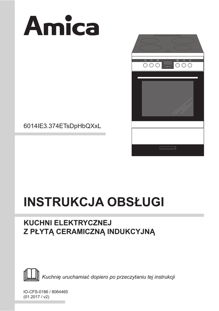 O C 6014IE3.374ETsDpHbQXxL INSTRUKCJA OBSŁUGI KUCHNI ELEKTRYCZNEJ Z PŁYTĄ CERAMICZNĄ INDUKCYJNĄ Kuchnię uruchamiać dopiero po przeczytaniu tej instrukcji IO-CFS-0186 / 8064465 (01.2017 / v2) SZANOWNY KLIENCIE, Kuchnia Amica to połączenie wyjątkowej łatwości obsługi i doskonałej efektywności. Po prze czytaniu instrukcji, obsługa kuchni nie będzie problemem. Kuchnia, która opuściła fabrykę była dokładnie sprawdzona przed zapakowaniem pod względem bezpieczeństwa i funkcjonalności na stanowiskach kontrolnych. Prosimy Państwa o uważną lekturę instrukcji obsługi przed uruchomieniem urządzenia. Przestrzeganie zawartych w niej wskazówek uchroni Państwa przed niewłaściwym użytko waniem. Instrukcję należy zachować i przechowywać tak, aby mieć ją zawsze pod ręką. Należy dokładnie przestrzegać instrukcji obsługi w celu uniknięcia nieszczęśliwych wypadków. Uwaga! Kuchnię obsługiwać tylko po zapoznaniu się z niniejszą instrukcją. Kuchnia przeznaczona jest wyłącznie do użytku domowego. Producent zastrzega sobie możliwość dokonywania zmian niewpływających na dzia łanie urządzenia. Masz wątpliwości? Nie wszystko, co przeczytałeś w instrukcji jest zrozumiałe zadzwoń do Centrum Serwisowego, gdzie uzyskasz wszechstronną pomoc. tel. 801 801 800 2 SPIS TREŚCI Podstawowe informacje.......................................................................................2 Wskazówki dotyczące bezpieczeństwa użytkowania...............................................4 Jak oszczędzać energię..........................................................................................6 Wycofanie z eksploatacji.........................................................................................7 Opis wyrobu..........................................................................................................9 Charakterystyka wyrobu......................................................................................10 Instalacja................................................................................................................12 Ustawienie kuchni...................................................................................................12 Przyłączenie kuchni do instalacji elektrycznej.........................................................13 Wskazówki dla instalatora.......................................................................................13 Obsługa................................................................................................................15 Przed pierwszym włączeniem kuchni....................................................................15 Obsługa płyty grzejnej..........................................................................19 Funkcje piekarnika i jego obsługa.........................................................................27 Pieczenie w piekarniku-porady praktyczne......................................................30 Czyszczenie i konserwacja kuchni....................................................................32 Postępowanie w sytuacjach awaryjnych..........................................................38 Dane techniczne..................................................................................................40 Gwarancja, obsługa posprzedażna...................................................................41 3 WSKAZÓWKI DOTYCZĄCE BEZPIECZEŃSTWA UŻYTKOWANIA Uwaga.Urządzenie i jego dostępne części stają się gorące podczas użycia. Możliwość dotknięcia elementów grzejnych powinno być objęte szczególną troską. Dzieci poniżej 8 roku życia powinny trzymać się z daleka, chyba że są pod stałą opieką. Niniejszy sprzęt może być używany przez dzieci w wieku od 8 lat i wyżej i osoby z ograniczeniami fizycznymi, czuciowymi albo umysłowymi albo brakiem doświadczenia i wiedzy, jeśli odbywa się pod nadzorem lub zgodnie z instrukcją użytkowania sprzętu, przekazanej przez osoby odpowiadające za ich bezpieczeństwo. Należy zwracać uwagę na dzieci, aby nie bawiły się sprzętem. Sprzątanie i czynności obsługowe nie powinny być robione przez dzieci bez nadzoru. Uwaga. Gotowanie bez nadzoru tłuszczu lub oleju na płycie kuchennej może być niebezpieczne i doprowadzić do pożaru. NIGDY nie próbuj gasić ognia wodą, ale wyłącz urządzenie i wtedy przykryj płomień np. pokrywką lub niepalnym kocem. Uwaga. Niebezpieczeństwo pożaru: nie gromadź rzeczy na powierzchni do gotowania. Uwaga. Jeżeli powierzchnia płyty jest pęknięta, wyłączyć prąd, aby uniknąć porażenia prądem elektrycznym. Przedmiotów metalowych, takich jak noże, widelce, łyżki i pokrywki oraz folii aluminiowej nie zaleca się kłaść na powierzchni płyty kuchennej, gdyż mogą się one stać gorące. 4 WSKAZÓWKI DOTYCZĄCE BEZPIECZEŃSTWA UŻYTKOWANIA Po użyciu wyłącz element grzejny płyty wyłącznikiem i nie polegaj na wskazaniach detektora naczyń. Podczas użytkowania sprzęt staje się gorący. Zaleca się zachowanie ostrożności, aby unikać dotykania gorących elementów wewnątrz piekarnika. Dostępne części mogą stać się gorące podczas użytkowania. Zaleca się trzymanie małych dzieci z dala od urządzenia. Uwaga. Nie używać szorstkich środków czyszczących lub ostrych metalowych przedmiotów do czyszczenia szkła drzwi, gdyż mogą porysować powierzchnię, co może doprowadzić do popękania szkła. Uwaga. Aby uniknąć możliwości porażenia prądem elektrycznym, przed wymianą lampki należy upewnić się, czy sprzęt jest wyłączony. Do czyszczenia kuchni nie wolno używać sprzętu do czyszczenia parą. Niebezpieczeństwo poparzenia! Podczas otwierania drzwi piekarnika może wydostawać się gorąca para. W trakcie lub po zakończeniu gotowania należy ostrożnie otwierać drzwi piekarnika. Przy otwieraniu nie nachylać się nad drzwiami. Należy pamiętać, że para w zależnoś