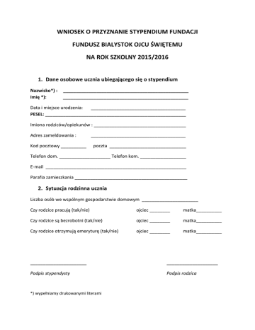 WNIOSEK O PRZYZNANIE STYPENDIUM FUNDACJI FUNDUSZ BIALYSTOK OJCU ŚWIĘTEMU NA ROK SZKOLNY 2015/2016 1. Dane osobowe ucznia ubiegającego się o stypendium Nazwisko*) : Imię *): _________________________________________________ _________________________________________________ Data i miejsce urodzenia: _____________________________________ PESEL: _______________________________________________________ Imiona rodziców/opiekunów : ____________________________________ Adres zameldowania : Kod pocztowy __________ _____________________________________ poczta ______________________________ Telefon dom. ____________________ Telefon kom. __________________ E-mail _______________________________________________________ Parafia zamieszkania ____________________________________________ 2. Sytuacja rodzinna ucznia Liczba osób we wspólnym gospodarstwie domowym ______________________ Czy rodzice pracują (tak/nie) ojciec ________ matka__________ Czy rodzice są bezrobotni (tak/nie) ojciec ________ matka__________ Czy rodzice otrzymują emeryturę (tak/nie) ojciec ________ matka__________ ______________________ ____________________ Podpis stypendysty Podpis rodzica *) wypełniamy drukowanymi literami 3. Dane szkoły Nazwa szkoły: __________________________________________________________ Adres szkoty: _________________________________________________________ Telefon, fax., e-mail _________________________________________________________ _________________________________________________________ W roku szkolnym 2014/2015 uczeni ukończył klasę/szkołę : ___________________________________________________________________________ Średnia ocen _______ Ocena z zachowania _________ Osiągniecia ucznia w roku szkolnym 2014/2015: należy je dostarczyć na osobnej kartce Opinia wychowawcy i pedagoga szkolnego: prosimy o dostarczenie na oddzielnej kartce Złączniki które należy dołączyć do wniosku: 1. Formularz: Informacja o sytuacji rodzinnej i materialnej ucznia ubiegającego się o przyznanie stypendium w Fundacji Funduszu Białystok Ojcu Świętemu wraz z dokumentami potwierdzającymi dochody w rodzinie (m.in. PIT-y m rok 2014, zaświadczenia z zakładu pracy o dochodach, aktualna decyzja o wysokości emerytury, renty, zaświadczenie o dochodach z gospodarstwa rolnego itp.) 2. Kopia ostatniego świadectwa szklonego. Wniosek wraz ze wszystkimi załącznikami należy dostarczyć na adres: Fundusz Białystok Ojcu Świętemu ul. Mickiewicza 54a, 15-232 Białystok Dokumenty należy dostarczyć do dnia 12.09.2015 Załącznik do wniosku o przyznanie stypendium Informacja o sytuacji rodzinnej i materialnej ucznia ubiegającego się o przyznanie stypendium w Fundacji Funduszu Białystok Ojcu Świętemu Rodzina kandydata do stypendium składa się z niżej wymienionych osób. Pozostających we wspólnym gospodarstwie domowym:**) Lp. 1 2 3 4 5 6 7 Nazwisko i imię Miejsce pracy/ nauki 1. Moja rodzina posiada lub użytkuje indywidualne gospodarstwo rolne o ogólnej powierzchni ha przeliczeniowych ________ Nie posiada i nie użytkuje indywidualnego gospodarstwa rolnego ***) 2. Średni dochód miesięczny ( netto) na jedną osobę w rodzinie wynosi__________ ****) Świadomy odpowiedzialności karnej w przypadku podania nieprawdziwych danych oświadczam, że przedstawione są zgodne ze stanem faktycznym Białystok, dnia ______________ _______________________ podpis rodzica/opiekuna prawnego **) W tabeli należy wymienić wszystkie osoby wspólnie zamieszkujące i gospodarujące. W pozycji nr 1 należy wpisać ucznia, ubiegającego się o stypendium, a następnie pozostałych członków rodziny ***) Niepotrzebne skreślić ****) Wysokość średniego dochodu miesięcznego ( netto) na osobę ustala się na podstawie dochodów w gospodarstwie domowym za okres od 1 stycznia do 31 sierpnia roku w którym składany jest wniosek. Ustalenie to dokonuje się przez dodanie wszystkich dochodów osób wymienionych w tabeli i podzielenie tej sumy przez liczbę osób i liczbę miesięcy. Należy uwzględnić wszystkie źródła dochodów / wynagrodzenia, zasiłki, renty, emerytury, alimenty, dochody z prowadzenia działalności gosp. Itp./