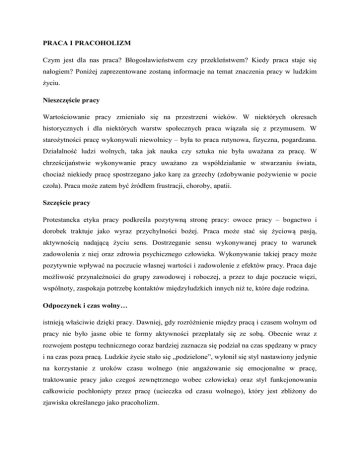 PRACA I PRACOHOLIZM Czym jest dla nas praca? Błogosławieństwem czy przekleństwem? Kiedy praca staje się nałogiem? Poniżej zaprezentowane zostaną informacje na temat znaczenia pracy w ludzkim życiu. Nieszczęście pracy Wartościowanie pracy zmieniało się na przestrzeni wieków. W niektórych okresach historycznych i dla niektórych warstw społecznych praca wiązała się z przymusem. W starożytności pracę wykonywali niewolnicy – była to praca rutynowa, fizyczna, pogardzana. Działalność ludzi wolnych, taka jak nauka czy sztuka nie była uważana za pracę. W chrześcijaństwie wykonywanie pracy uważano za współdziałanie w stwarzaniu świata, chociaż niekiedy pracę spostrzegano jako karę za grzechy (zdobywanie pożywienie w pocie czoła). Praca może zatem być źródłem frustracji, choroby, apatii. Szczęście pracy Protestancka etyka pracy podkreśla pozytywną stronę pracy: owoce pracy – bogactwo i dorobek traktuje jako wyraz przychylności bożej. Praca może stać się życiową pasją, aktywnością nadającą życiu sens. Dostrzeganie sensu wykonywanej pracy to warunek zadowolenia z niej oraz zdrowia psychicznego człowieka. Wykonywanie takiej pracy może pozytywnie wpływać na poczucie własnej wartości i zadowolenie z efektów pracy. Praca daje możliwość przynależności do grupy zawodowej i roboczej, a przez to daje poczucie więzi, wspólnoty, zaspokaja potrzebę kontaktów międzyludzkich innych niż te, które daje rodzina. Odpoczynek i czas wolny… istnieją właściwie dzięki pracy. Dawniej, gdy rozróżnienie między pracą i czasem wolnym od pracy nie było jasne obie te formy aktywności przeplatały się ze sobą. Obecnie wraz z rozwojem postępu technicznego coraz bardziej zaznacza się podział na czas spędzany w pracy i na czas poza pracą. Ludzkie życie stało się „podzielone”, wyłonił się styl nastawiony jedynie na korzystanie z uroków czasu wolnego (nie angażowanie się emocjonalne w pracę, traktowanie pracy jako czegoś zewnętrznego wobec człowieka) oraz styl funkcjonowania całkowicie pochłonięty przez pracę (ucieczka od czasu wolnego), który jest zbliżony do zjawiska określanego jako pracoholizm. Pracoholizm Jest jednym z rodzajów uzależnień, podobnie jak uzależnienie od Internetu czy hazardu. Człowiek staje się niewolnikiem swojej pracy a uzależnienie to powoduje pogorszenie stanu zdrowia somatycznego, problemy rodzinne do rozpadu więzi rodzinnych włącznie, ograniczenie kontaktów towarzyskich jedynie do przyjaciół z pracy. Osoba uzależniona od pracy lekceważy problemy zdrowotne, ucieka od czasu wolnego a nawet gdy już wybierze się na urlop to nie zapomina o zabraniu ze sobą laptopa i komórki. Urlop, czas poświęcony na inne niż aktywność zawodowa formy działalności, uważa za czas stracony. Praca i myślenie o pracy jest pracoholikowi potrzebne stopniowo coraz bardziej. Pojawia się wypalenie zawodowe, nienawiść do pracy i przymus jej wykonywania. U źródeł pracoholizmu leży prawdopodobnie potrzeba nieustannego potwierdzania własnej wartości poprzez osiąganie kolejnych etapów kariery zawodowej, poprzez ciągłe pięcie się na szczyt, poprzez skupienie się na tym jednym rodzaj aktywności ludzkiej z pominięciem innych, pozazawodowych. Niestety kolejne osiągnięcia nie dają satysfakcji, człowiek nie pozwala sobie na odpoczynek, wikła się w pogoń bez końca za byciem coraz lepszym. Praca nie daje szczęścia ale pracoholik nie jest w stanie bez niej żyć. Równowaga… między pracą i nie-pracą, zaangażowaniem się w sprawy zawodowe i w sprawy pozazawodowe, umiejętność zbudowania elastycznych i zarazem dostatecznie sztywnych granic między tymi dwoma sferami życia człowieka wydaje się być odpowiedzią na pytanie o konstruktywną lub destrukcyjną rolę pracy w ludzkim życiu. oprac. Anna Skuzińska CIiPKZ w Elblagu