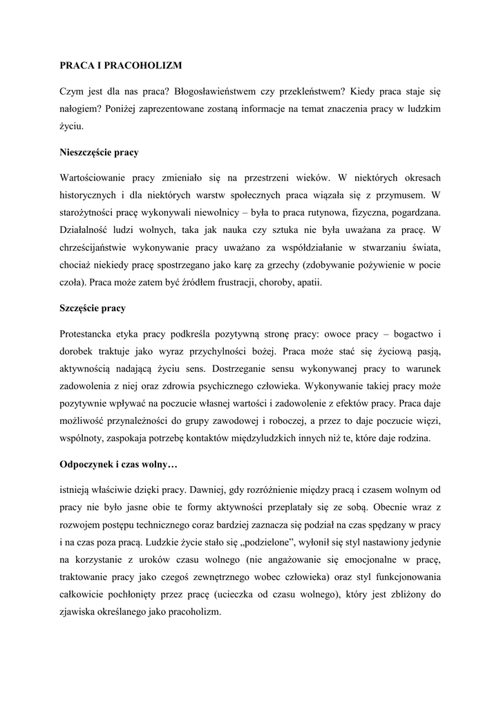 PRACA I PRACOHOLIZM Czym jest dla nas praca