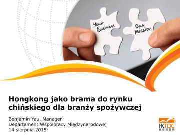 Hongkong jako brama do rynku chińskiego dla branży spożywczej Benjamin Yau, Manager Departament Współpracy Międzynarodowej 14 sierpnia 2015 Chiny: potencjał gospodarczy Druga co do wielkości gospodarka na świecie Ostanie 10 lat PKB : Handel : 2 10% wzrostu rocznie 19% wzrostu rocznie Chiny: kierunek przemian Chiny nie są już „tylko” bazą produkcyjną Rosnąca konsumpcja – wzrost sprzedaży detalicznej o 10,6% w czerwcu 2015 Rosnąca klasa średnia – około 230 milionów Urbanizacja – 1 mld mieszkańców miast do 2030 roku 3 Hongkong: solidna podstawa biznesu Centrum biznesowe Azji Transparentność w biznesie Usługi stanowią 92% PKB Hongkongu – najwyższy poziom na świecie Nr 2 w raporcie World Competitiveness Yearbook 2015 Dobrze regulowany system bankowy Niskie podatki, prosty system podatkowy 4 Hongkong: solidna podstawa biznesu Praworządność Skuteczny, niezależny system prawny Ochrona własności intelektualnej Swobodny przepływ informacji, ludzi, towarów i kapitału Najbardziej liberalna gospodarka na świecie Hongkong: Idealna lokalizacja Harbin Changchun Shenyang Shijiazhuang Beijing Tianjin Taiyuan Zhengzhou Xian Chengdu Dalian Jinan Nanjing Hefei Wuhan Chongqing Changsha Shanghai Hangzhou Nanchang Fuzhou Guiyang Guangzhou Guilin Taipei Kunming Delhi Dhaka Hanoi Hong Kong Haikou Seoul Tokyo Osaka Fukuoka W promieniu 4 godz. lotu dostęp do wszystkich kluczowych rynków w Azji Mumbai Chennai Bangalore Colombo Bangkok Manila Ho Chi Minh City 4 godz. Singapore 5 godz. Jakarta W promieniu 5 godz. lotu połowa ludności świata Hongkong: Idealna lokalizacja Azjatycki węzeł logistyczny i morski Nr 1 w międzynarodowym transporcie lotniczym • 4,1 mln ton przewiezionego ładunku (2013) • >100 linii lotniczych • 180 połączeń lotniczych Jeden z największych na świecie portów kontenerowych • 22,3 mln TEUs (2013) • 380 liniowców kontenerowych tygodniowo, 550 połączeń Top photo credit: Hong Kong International Airport Hongkong: Idealna lokalizacja Tuż obok prowincji Guangdong 105 mln mieszkańców 28% eksportu z Chin (głównie z Delty Rzeki Perłowej) 7,9% wzrostu realnego PKB Chińskie inwestycje zagraniczne Hongkong: Trampolina dla inwestycji zagranicznych z Chin kontynentalnych Szansa dla firm zagranicznych Około 60% inwestycji zagranicznych z Chin kontynentalnych realizowanych jest przez Hongkong Chiny Hongkong Hongkong: Centrum globalnego biznesu Most na rynki azjatyckie Siedziba biur regionalnych Korzystne umowy handlowe z Chinami kontynentalnymi Uznawany na całym świecie wolny rynek Hongkong: Centrum globalnego biznesu Jeden pas, jedna droga Hongkong jako azjatyckie centrum handlu żywnością 12 Źródło: Census and Statistics Department, HKSARG Hongkong: azjatyckie centrum handlu żywnością >7 mln ludności, >95% artykułów spożywczych pochodzi z importu 61 mln turystów w 2014 r., z czego 47 mln (ok. 77%)z Chin kontynentalnych > 14 000 restauracji w Hongkongu z międzynarodową ofertą gastronomiczną (37% to restauracje chińskie, 56% restauracje nie-chińskie, 7% lokale typu fast food) >1000 bary, puby i inne lokale 13 Źródło: Census and Statistics Department, HKSARG Hongkong importował przetworzoną żywność i napoje o wartości 25 mld USD w 2014 r. Rodzaj produktów Inne 14% Produkty mleczne 9% Kraje pochodzenia Inne 36% Mięso 32% USA 16% Napoje 10% Ryby 15% Warzywa 20% Źródło: Census and Statistics Department, HKSARG Brazylia, 10% Australia 4% Japonia 4% 14 Chiny 20% Tajlandia 4% Holandia 6% Hongkong reeksportował przetworzoną żywność i napoje o wartości 7 mld USD (~28% całkowitego importu) Rodzaj produktów Inne Produkty mleczne10% 5% Kraje docelowe Mięso 28% Wietnam 35% Napoje 14% Ryby 14% Warzywa 29% Singapur, 1% Tajlandia, 1% Inne 12% USA 2% 15 Źródło: Census and Statistics Department, HKSARG Chiny 34% Makao 15% Hongkong jako brama do Chin W 2014 r. Hongkong eksportował przetworzoną żywność i napoje o wartości 7,3 mld USD (+11%) >90% importowanej żywności jest przeznaczone do reeksportu z Hongkongu ok.34% Chiny , ok.39% Węzeł logistyczny ASEAN niezawodny i wydajny Produkty żywnościowe zawarte w umowie CEPA taryfy0% 16 Potencjał rynku chińskiego USD (mld) 400 20% 15% 300 13% 288 12% 260 10% 200 11% 10% 189 213 238 100 0 0% 2012 2013 2014 2015* 2016* wielkość rynku wzrost rok do roku 17 Źródło: Euromonitor International Rynek chiński : Rosnący popyt na towary importowane Import przetworzonej żywności i napoi wyniósł w Chinach 45,6 mld USD w 2014 (+11%) Badania konsumentów prowadzone przez HKTDC nt. chińskiego rynku żywności: - 81% respondentów kupuje głównie żywość pakowaną - 58% respondentów kupuje głównie żywość pakowaną importowaną Skandale dotyczące lokalnej żywności podważyły zaufanie konsumentów Dzięki wysokiemu poziomowi dochodów oraz wysokiej sile nabywczej, konsumenci wykazują duże zapotrzebowanie na żywność pakowaną importowaną 18 Działalność HKTDC Promocja współpracy handlowej pomiędzy Hongkongiem, Chinami i resztą świata Dostarczanie informacji 19 Kojarzenie partnerów biznesowych Organizacja targów HKTDC: Zintegrowana platforma informacyjno- handlowa Imprezy targowe Online Trade Fairs hktdc.com Publikacje branżowe Aplikacje mobilne Print 20 Mobile HKTDC: Największe imprezy targowe w Hongkongu Ponad 30 imprez targowych w ciągu roku 10 największych targów branżowych w Azji, w tym 4 największe na świecie Watch & Clock Gifts & Premium Jewellery + Electronics (Autumn) Diamond, Gem & Pearl + electronicAsia 21 Fashion Fall/Winter Electronics (Spring) Toys & Games Houseware Licensing FILMART Platforma handlowa hktdc.com >1.5M zarejestrowanych kupców >120,000 sprawdzonych dostawców >12M odsłon miesięcznie >20M zapytań handlowych rocznie 22 HKTDC: Publikacje branżowe >20 katalogów branżowych >5 mln czytelników w >200 krajach/regionach Wersja drukowana Wysyłka pocztą tradycyjną Wersja BEZPŁATNA dostępn